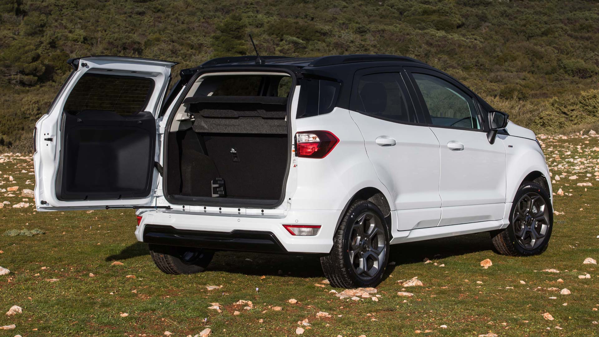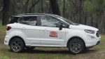 Διαφορές αισθητές δεν υπάρχουν σε σχέση με το προ ανανέωσης μοντέλο, καθώς το Ford EcoSport έχει διατηρήσει όλα τα εμφανισιακά χαρακτηριστικά που το καθιέρωσαν. Το εμπρός μέρος του παραμένει δυναμικό, χάρη στη μεγάλη μάσκα, η οποία έχει μαύρο χρώμα, που έρχεται σε αντίθεση με το λευκό του αμάξωμα και συνδυάζεται αρμονικά με την επίσης μαύρη οροφή, ως μέρος των δυνατοτήτων εξατομίκευσης που προσφέρει η Ford για το SUV της. Εξάλλου, ο υποψήφιος αγοραστής έχει στην διάθεσή του 12 χρώματα και δυνατότητες επιλογής, όπως οι αντίθετες αποχρώσεις οροφής ως τις κολόνες, τα πάνω πλαίσια θυρών και οι εξωτερικοί καθρέπτες. Το πίσω μέρος ξεχωρίζει από την αεροτομή οροφής και το μαύρο κάτω μέρος του προφυλακτήρα που παραπέμπει σε αεροδυναμικό διαχύτη. Κοιτώντας το EcoSport από το πλάι δεν μπορείς παρά να παρατηρήσεις την αυξημένη απόσταση από το έδαφος (190 χλστ.), τις ράγες οροφής αλλά και τις ζάντες αλουμινίου 17 ιντσών. Όσον αφορά τις διαστάσεις του, το μήκος του είναι στα 4.017 χλστ. (4.273 χλστ. με εξωτερική ρεζέρβα, που είναι και ο λόγος για τον οποίο η πίσω πόρτα ανοίγει αριστερόστροφα και όχι κατακόρυφα) το πλάτος στα 2.057 χλστ. και το ύψος στα 1.650 χλστ.