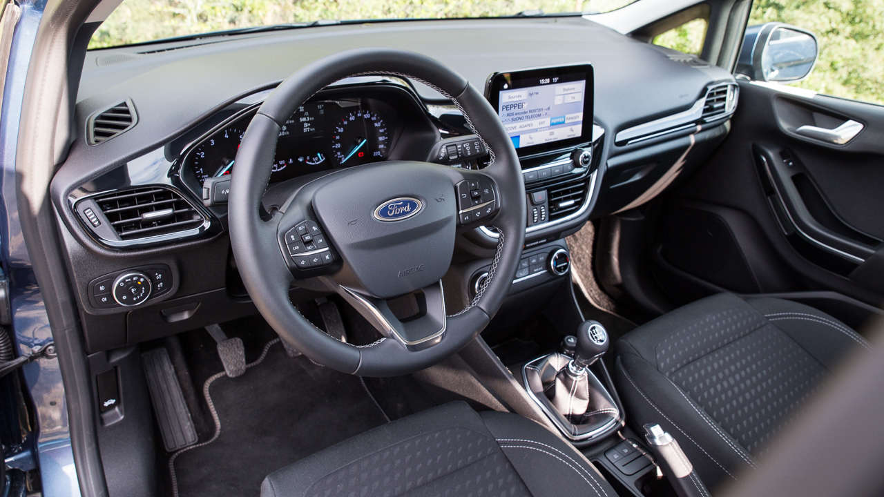Η θέση οδήγησης του Fiesta είναι εξαιρετική και δεν με δυσκόλεψε καθόλου στο να βρω ιδανικές αποστάσεις από τιμόνι και πεντάλ με τις ρυθμίσεις που προσφέρει το κάθισμα να με βοηθούν να βολευτώ γρήγορα. Γύρω μου υπάρχουν πολλά φυσικά και φωτιζόμενα κουμπιά, τα οποία ωστόσο έχουν σωστή διάταξη και απαιτούν ελάχιστο χρόνο εξοικείωσης για να μάθω τι βρίσκεται πού. Το βράδυ δε, σε συνδυασμό και με τον κρυφό τυρκουάζ ατμοσφαιρικό φωτισμό, στις πόρτες και μπροστά από τα πόδια οδηγού και συνοδηγού, θυμίζει λίγο cockpit αεροσκάφους. Στο κέντρο του ταμπλό, σε σωστό ύψος, δεσπόζει η μεγάλη οθόνη αφής των 8 ιντσών του συστήματος πολυμέσων SYNC 3, η οποία διακρίνεται για τα κομψά γραφικά και την υψηλή ευκρίνεια της, την γρήγορη απόκριση αλλά και την ευκολία που δίνει πρόσβαση στα διάφορα υπομενού του συστήματος.