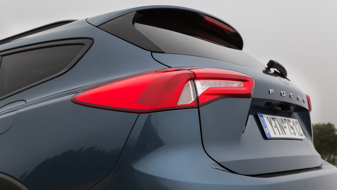 Το “ψηλό” Focus δείχνει τη διαφορετικότητα του και από τις ξεχωριστές πινελιές που φέρει στο αμάξωμα του. Μπροστά η γρίλια είναι μαύρη ματ με το δικό της ιδιαίτερο μοτίβο, ενώ οι θόλοι των τροχών φέρουν πλαστικές προστασίες στο ίδιο μαύρο χρώμα και υφή που μειώνουν την πιθανότητα να γρατσουνιστούν τα φτερά του Focus από πετραδάκια. Διαφορετικοί είναι και οι προφυλακτήρες στο κάτω μέρος τους, επίσης σε μαύρο ματ, με το χείλος να έχει ασημί “επένδυση” στο κεντρικό κομμάτι του που θυμίζει μεταλλική προστασία. Η εικόνα ολοκληρώνεται από τις μαύρες ράγες οροφής με το wagon αμάξωμα να μην υπολείπεται σε δυναμισμό έναντι του hatchback σε κανένα σημείο του.