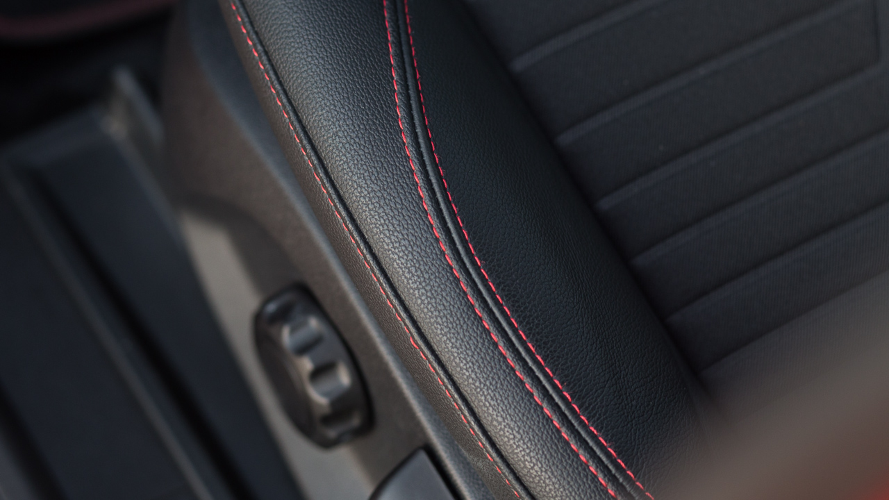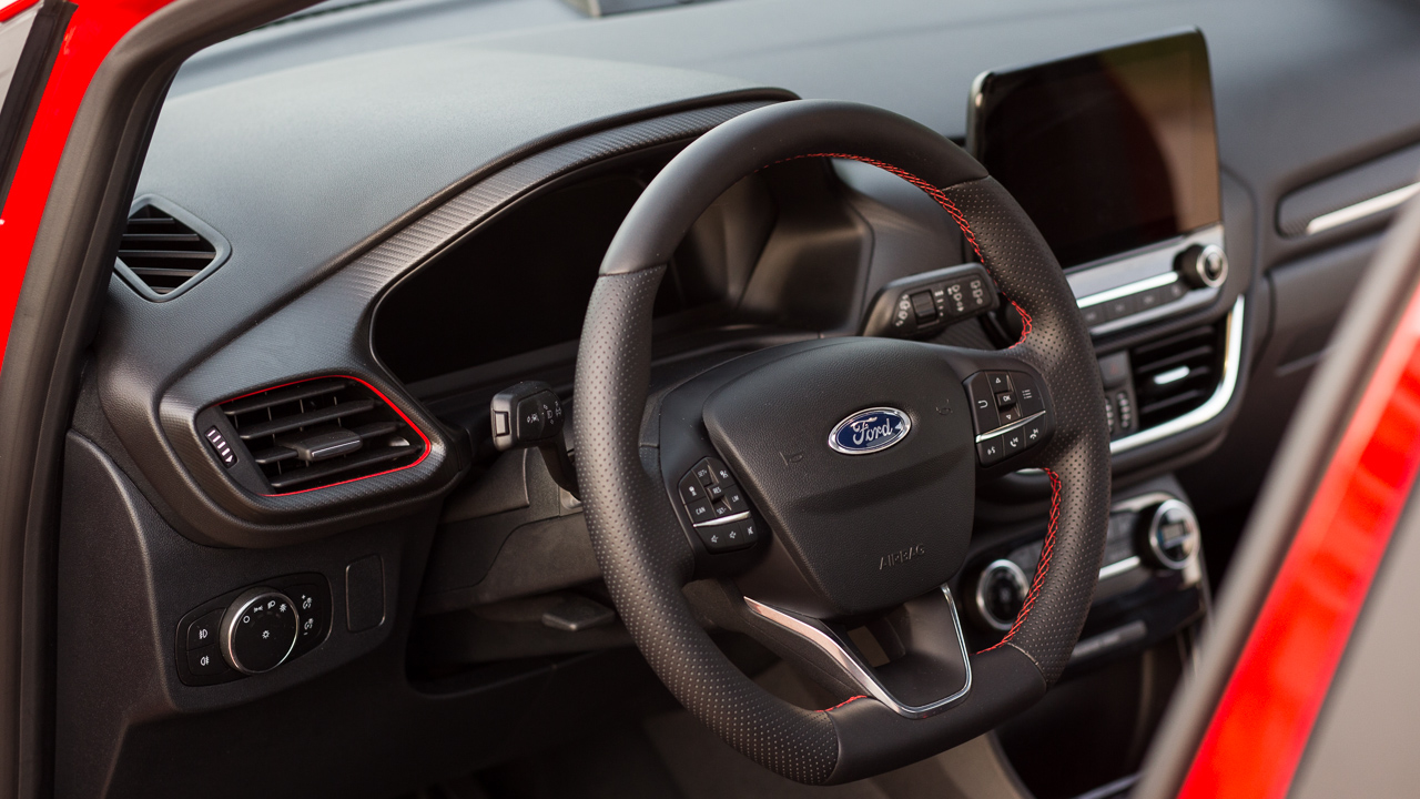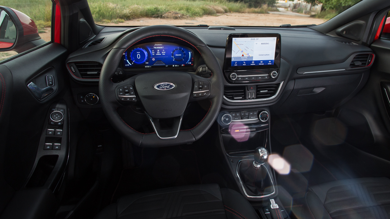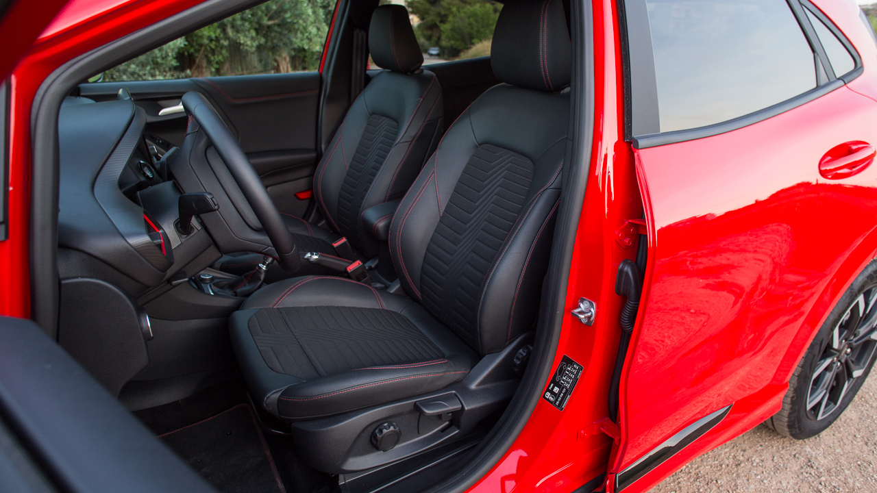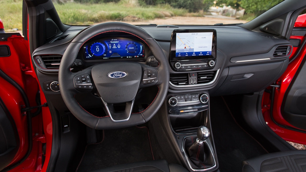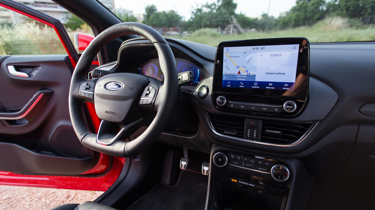 Το εσωτερικό του Puma είναι πιο γνώριμο καθώς προέρχεται σε μεγάλο βαθμό από το Fiesta, πάνω στο οποίο άλλωστε “πατάει” το μικρό crossover. Όπως και το Fiesta έτσι και στο Puma η ποιότητα κατασκευής βρίσκεται σε υψηλά επίπεδα ενώ την έκδοση της δοκιμής ST-Line X ξεχωρίζουν οι επενδύσεις των σπορ καθισμάτων με τις κόκκινες ραφές που κάνουν την εμφάνιση τους στο τιμόνι, τον επιλογέα του χειροκίνητου 6τάχυτου κιβωτίου, στο χειρόφρενο και τις πόρτες.
