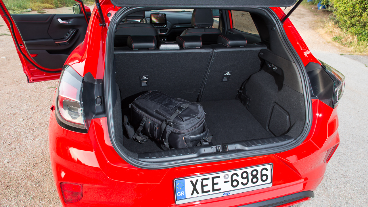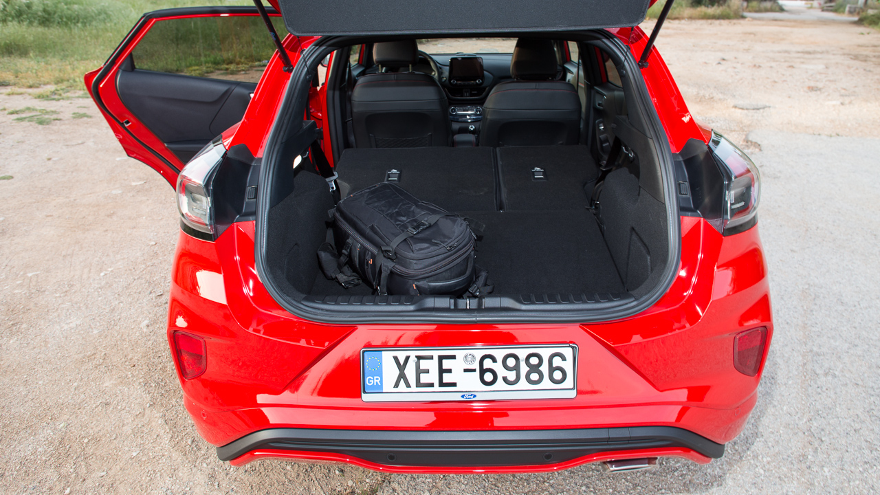Το Puma σχεδιάστηκε εξαρχής για να προσφέρει του περισσότερους δυνατούς χώρους για το μέγεθος του αμαξώματος του. Μπορεί η δυναμική του εξωτερική σχεδίαση με τα έντονα σπορ στοιχεία για την κατηγορία να υπονοεί θυσίες στον τομέα των χώρων, η αλήθεια όμως απέχει πολύ από αυτό. Με μήκος 4.186 χλστ., πλάτος στα 1.805 χλστ. και μεταξόνιο στα 2.590 χλστ., οι χώροι για τέσσερις επιβάτες είναι ικανοποιητικότατοι για το μικρό crossover της Ford, με μπόλικο χώρο για τα κεφάλια των πίσω και αρκετά καλό για τα γόνατα τους. Ένας πέμπτος θα κάτσει με κάποιες παραχωρήσεις για τα γόνατα του, ωστόσο εκεί που το Puma δίνει πραγματικά ρέστα είναι στο κομμάτι του πορτμπαγκάζ.