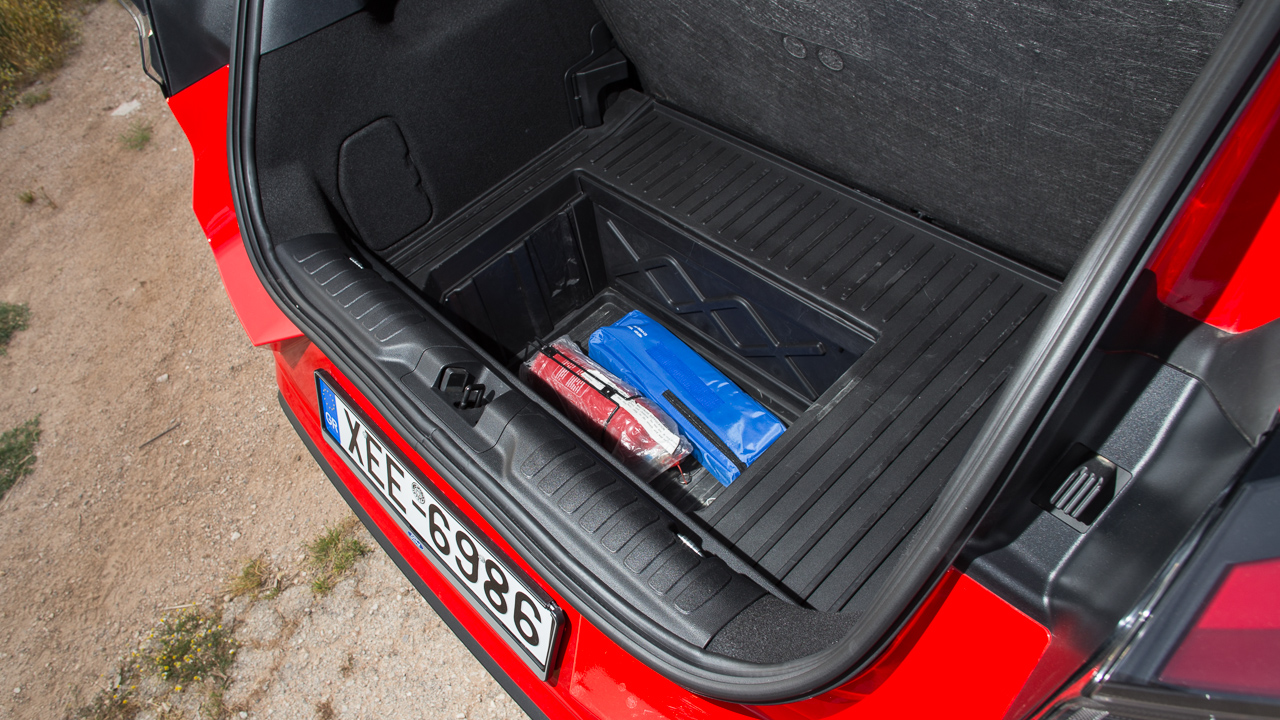 Ο χώρος αποσκευών φτάνει στα 402 λίτρα στην ήπια υβριδική έκδοση της δοκιμής και δεν αναλώνεται μόνο εκεί. Κάτω από το δάπεδο υπάρχει το Mega Box της Ford, ένας επιπλέον στεγανός χώρος από σκληρό πλαστικό 50 λίτρων που πλένεται εύκολα και χωρίς τύψεις με το λάστιχο. Φέρει φέρει τάπα αποστράγγισης και μπορεί να χρησιμοποιηθεί ποικιλοτρόπως: από την όρθια τοποθέτηση ψηλών αντικειμένων έως και την εκτέλεση χρεών σαν… προσωρινό ψυγείο (!) με τον εφεδρικό τροχό να θυσιάζεται στο βωμό των ωφέλιμων χώρων. Με την αναδίπλωση των καθισμάτων και φόρτωμα μέχρι την οροφή ο ωφέλιμος χώρος φτάνει στα 1.216 λίτρα.