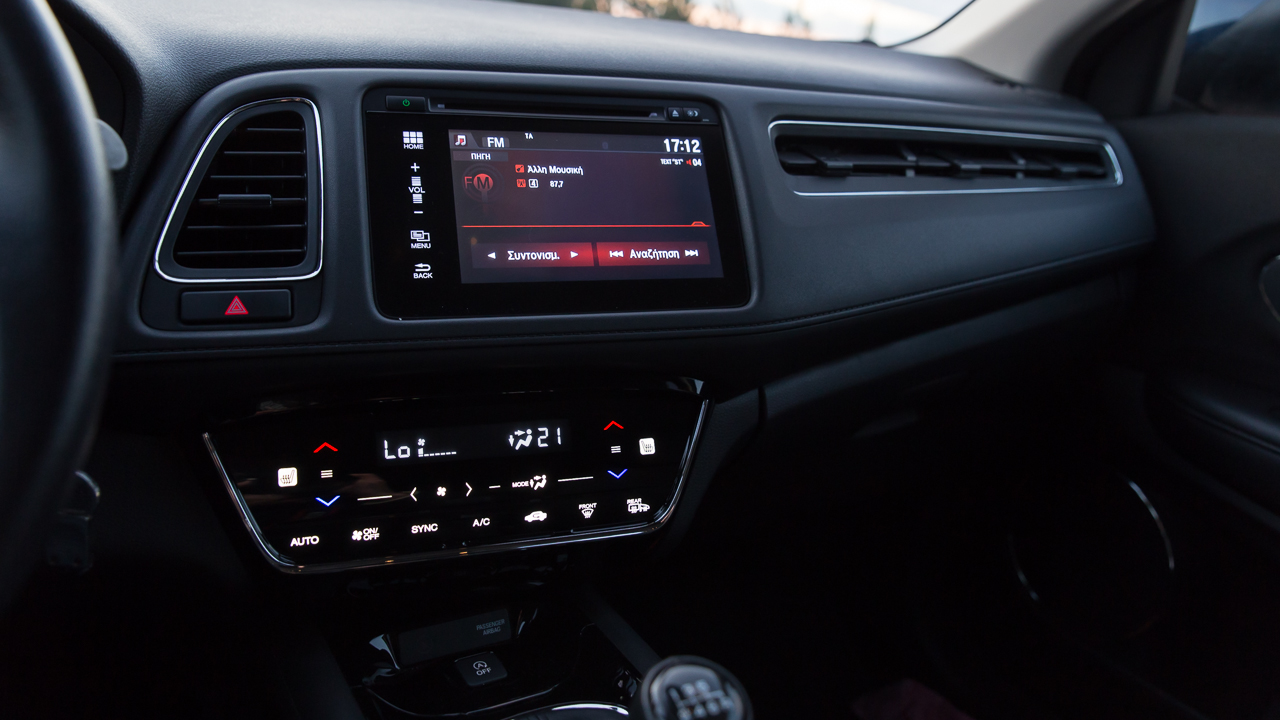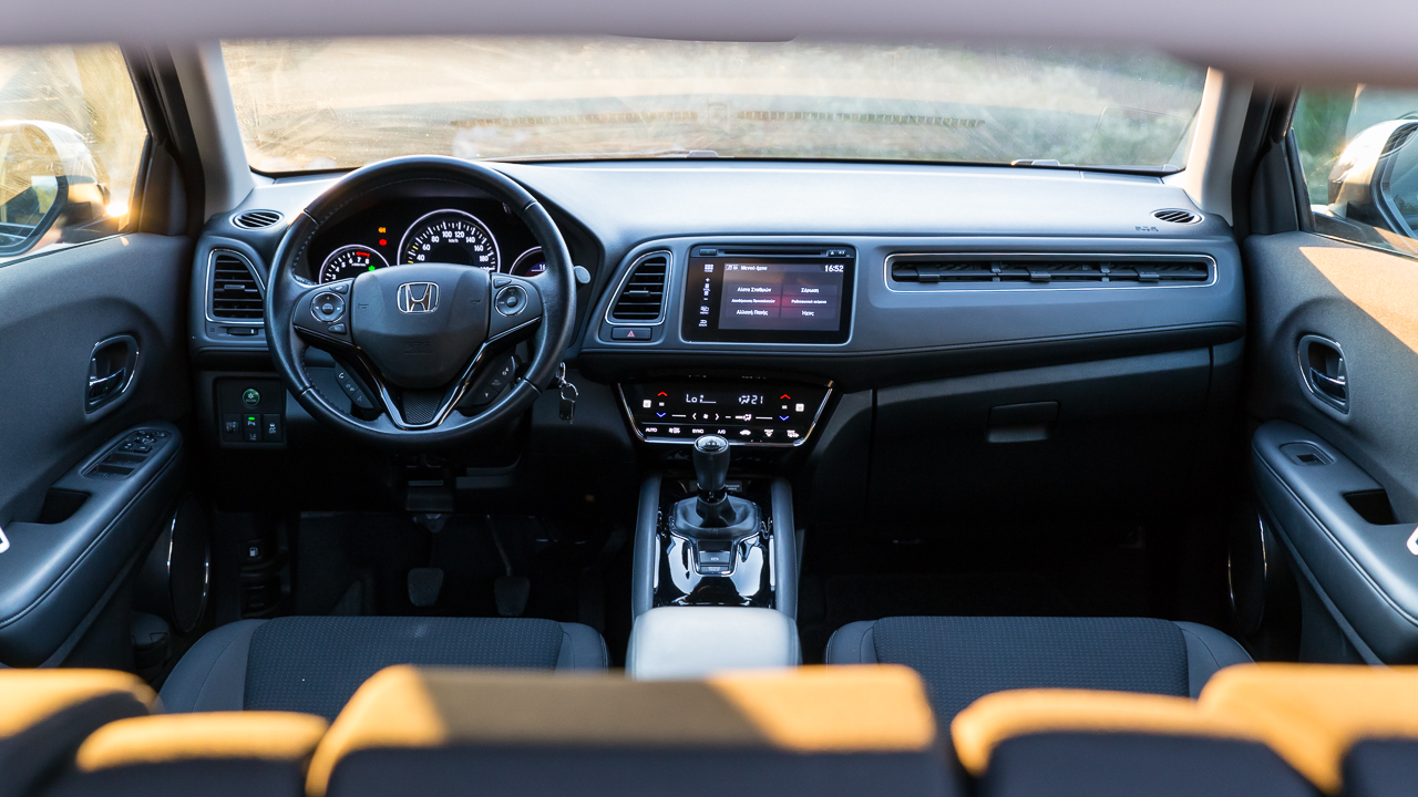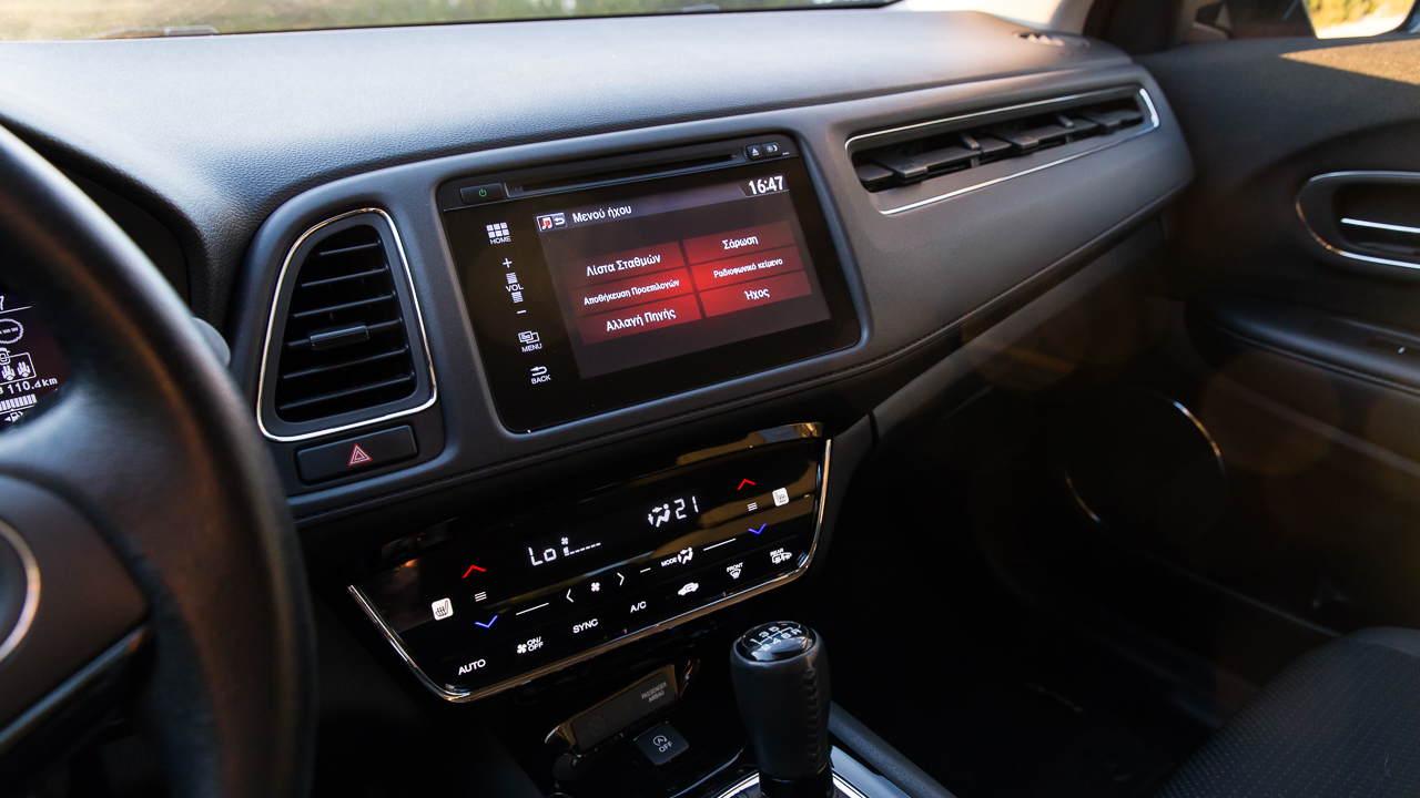 Στο εσωτερικό του Honda H-RV προτεραιότητα σε αυτή την ανανέωση δόθηκε στην άνεση αυτών που βρίσκονται στα δύο εμπρός καθίσματα. Τα τελευταία ανανέωσαν τη σχεδίαση τους ώστε να γίνουν πιο άνετα και ανατομικά, με νέο αφρώδες υλικό αλλά και διαφορετική σχεδίαση για την πλάτη. Νέες και πιο ποιοτικές είναι και οι επενδύσεις των καθισμάτων κάτι που ισχύει και για εκείνες των θυρών. Το σοφιστικέ και μοντέρνο περιβάλλον που παρουσιάζει το HR-V στο εσωτερικό του σε υποδέχεται θερμά από την αρχή. Το σύγχρονης σχεδίασης ταμπλό με το σχεδόν σκανδιναβικό design κερδίζει τις εντυπώσεις με τη λιτότητα των γραμμών του αλλά και την έλλειψη (στα μάτια τουλάχιστον) των πολλών φυσικών κουμπιών. Η μαύρη γυαλιστερή επιφάνεια στην κεντρική κονσόλα των δύο επιπέδων και η αντίστοιχη όψη του αυτού του τομέα, που συγκεντρώνει μεταξύ άλλων τα κουμπιά αφής για τον έλεγχο του κλιματισμού, προσδίδουν μια σπορ πολυτέλεια που μπορεί και να μην την περίμενε κανείς από ένα χρηστικό SUV. Ακριβώς από πάνω, σε σωστό ύψος, βρίσκεται η οθόνη αφής του συστήματος πολυμέσων με διαγώνιο στις επτά ίντσες. Γρήγορη στις εντολές του οδηγού και με προσεγμένα γραφικά δεν αφήνει παράπονο από τη χρήση της, ενώ όπως και με όλα τα σύγχρονα συστήματα, ο χρόνος που θα χρειαστεί για να εξοικειωθείτε μαζί της βρίσκεται σε φυσιολογικά όρια.
