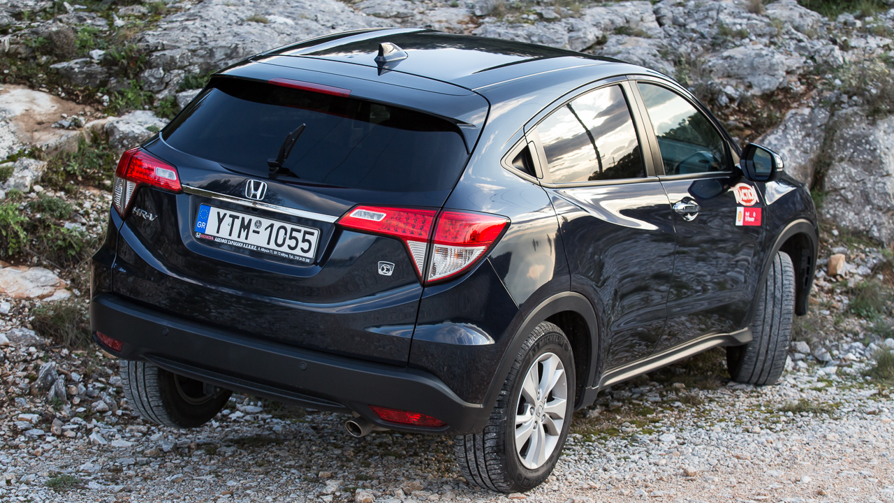 Το σχήμα του HR-V ακολουθεί κατά πόδας τις τελευταίες σχεδιαστικές τάσεις της κατηγορίας τις οποίες και έχει προσαρμόσει στην δική του αισθητική ταυτότητα. Τα “νεύρα” που διατρέχουν το SUV της Honda στο καπό αλλά ειδικά στο πλάι, σε συνδυασμό με τους τονισμένους θόλους των τροχών και την ελαφρώς κεκλιμένη πορεία σε στιλ coupe που ακολουθεί η οροφή, του προσδίδουν τον απαραίτητο δυναμισμό που αναζητά το απαιτητικό κοινό της κατηγορίας. Το ίδιο κάνουν και οι “κρυφές” και κάθετα τοποθετημένες χειρολαβές για τις πίσω πόρτες, ένα από τα highlights της εμφάνισης του μοντέλου των Ιαπώνων.