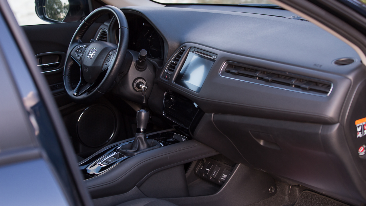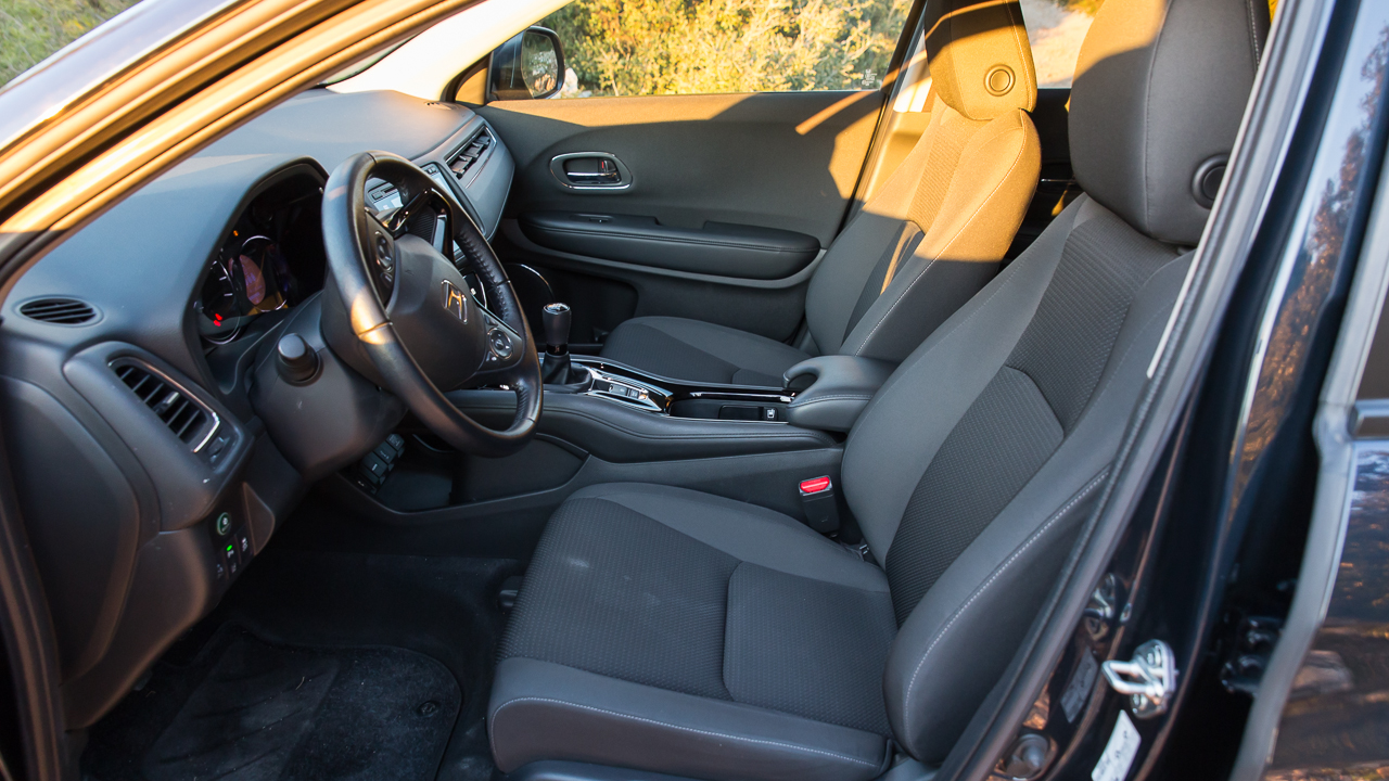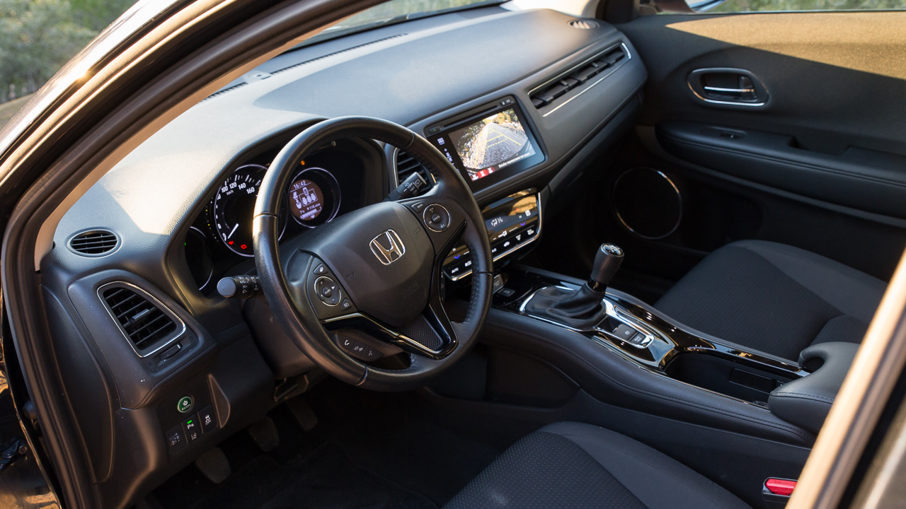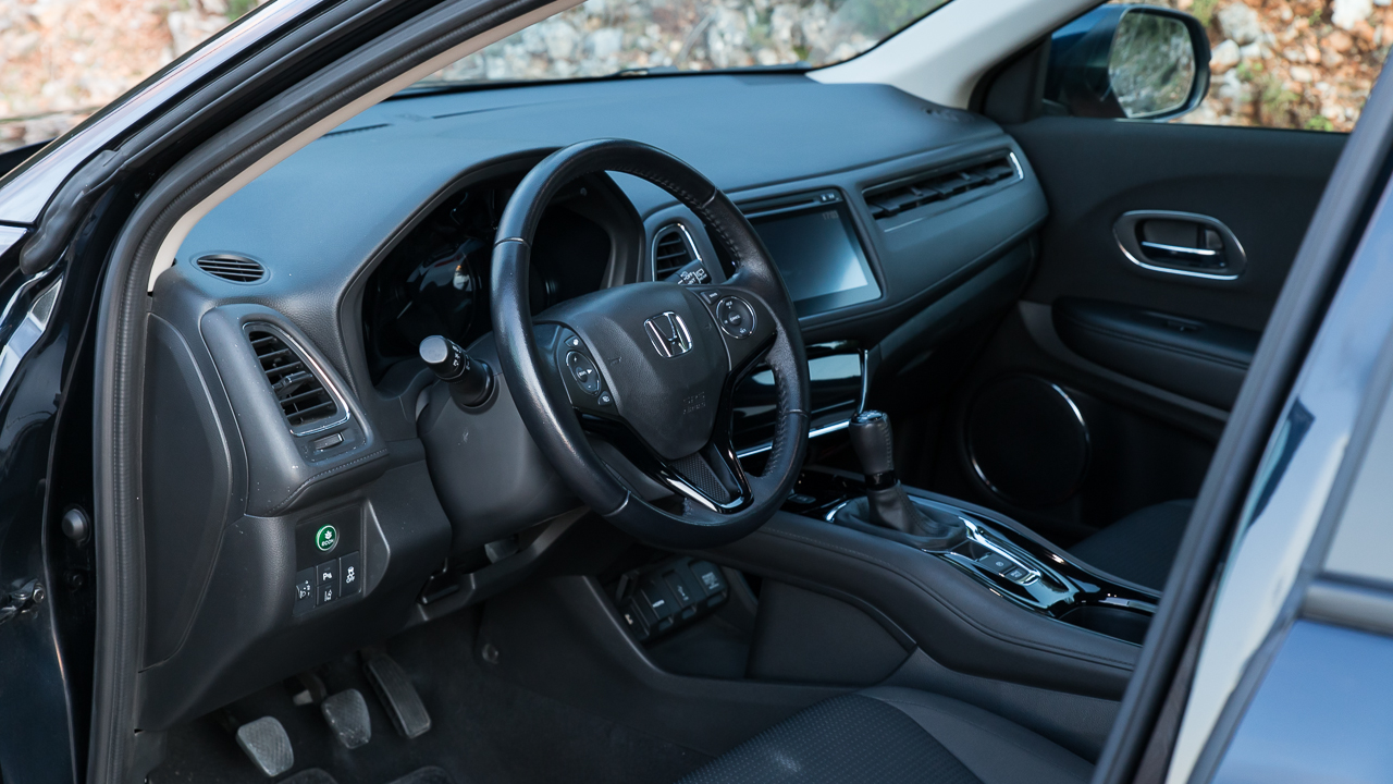 Στο εσωτερικό του H-RV προτεραιότητα σε αυτή την ανανέωση δόθηκε στην άνεση αυτών που βρίσκονται στα δύο εμπρός καθίσματα. Τα τελευταία ανανέωσαν τη σχεδίαση τους ώστε να γίνουν πιο άνετα και ανατομικά, με νέο αφρώδες υλικό αλλά και διαφορετική σχεδίαση για την πλάτη. Νέες και πιο ποιοτικές είναι και οι επενδύσεις των καθισμάτων κάτι που ισχύει και για εκείνες των θυρών. Το σοφιστικέ και μοντέρνο περιβάλλον που παρουσιάζει το HR-V στο εσωτερικό του σε υποδέχεται θερμά από την αρχή. Το σύγχρονης σχεδίασης ταμπλό με το σχεδόν σκανδιναβικό design κερδίζει τις εντυπώσεις με τη λιτότητα των γραμμών του αλλά και την έλλειψη (στα μάτια τουλάχιστον) των πολλών φυσικών κουμπιών. Η μαύρη γυαλιστερή επιφάνεια στην κεντρική κονσόλα των δύο επιπέδων και η αντίστοιχη όψη του αυτού του τομέα, που συγκεντρώνει μεταξύ άλλων τα κουμπιά αφής για τον έλεγχο του κλιματισμού, προσδίδουν μια σπορ πολυτέλεια που μπορεί και να μην την περίμενε κανείς από ένα χρηστικό SUV. Ακριβώς από πάνω, σε σωστό ύψος, βρίσκεται η οθόνη αφής του συστήματος πολυμέσων με διαγώνιο στις επτά ίντσες. Γρήγορη στις εντολές του οδηγού και με προσεγμένα γραφικά δεν αφήνει παράπονο από τη χρήση της, ενώ όπως και με όλα τα σύγχρονα συστήματα, ο χρόνος που θα χρειαστεί για να εξοικειωθείτε μαζί της βρίσκεται σε φυσιολογικά όρια.