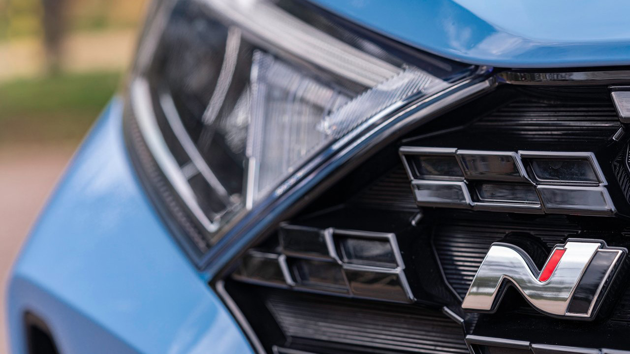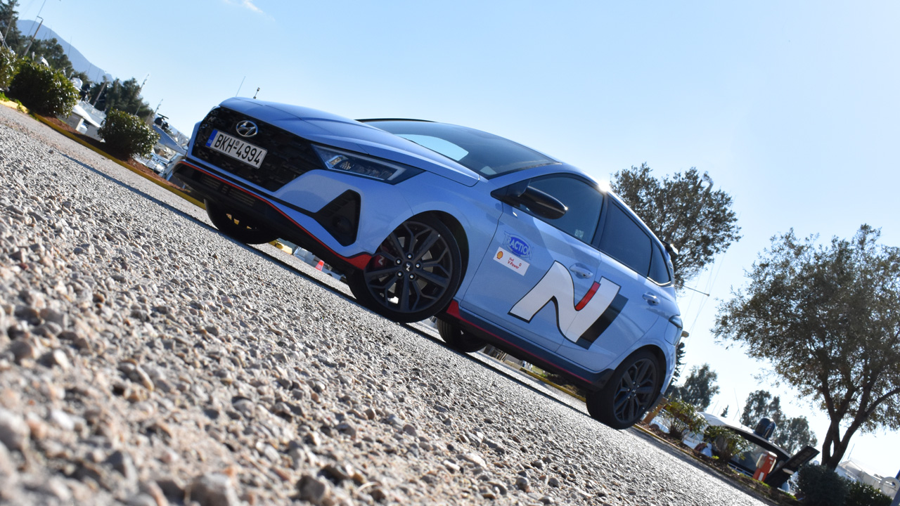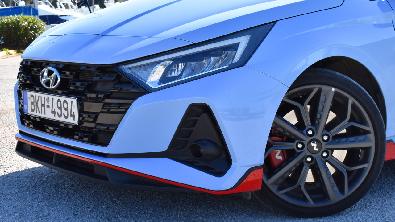 Ξεκινώ από την εμφάνιση, η οποία “φωνάζει” από μακριά ότι πρόκειται για μία σκληροπυρηνική έκδοση. Δεν είναι τυχαίο άλλωστε ότι παρατήρησα ίσως τις περισσότερες θετικές αντιδράσεις, όπως τα αμέτρητα “thumps up” άλλων οδηγών. Βλέπετε είναι εκείνο το τεράστιο “Ν” στις πόρτες που τραβά τα βλέμματα σαν μαγνήτης, ενώ η σκληροπυρηνική εμφάνιση ολοκληρώνεται και με άλλα στοιχεία. Μερικά εξ’ αυτών είναι το bodykit με κόκκινες λεπτομέρειες, η μαύρη “πινελιά” στους καθρέφτες και την αεροτομή, ο διαχύτης και η οβάλ απόληξη της εξάτμισης στο πίσω μέρος, αλλά και οι αλουμινένιες ζάντες 18 ιντσών που “φιλοξενούν” κόκκινες δαγκάνες με το σήμα N και ειδική σειρά ελαστικών Pirelli P Zero που φέρει το λογότυπο HN (Hyundai N) και έχει μέγεθος 215/40/R18. H “sportive” εμφάνιση ολοκληρώνεται με την χαμηλή απόσταση από το έδαφος και τα “N” λογότυπα σε εμπρός μάσκα και πίσω μέρος.