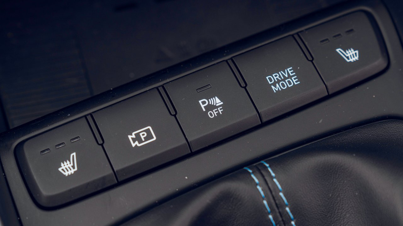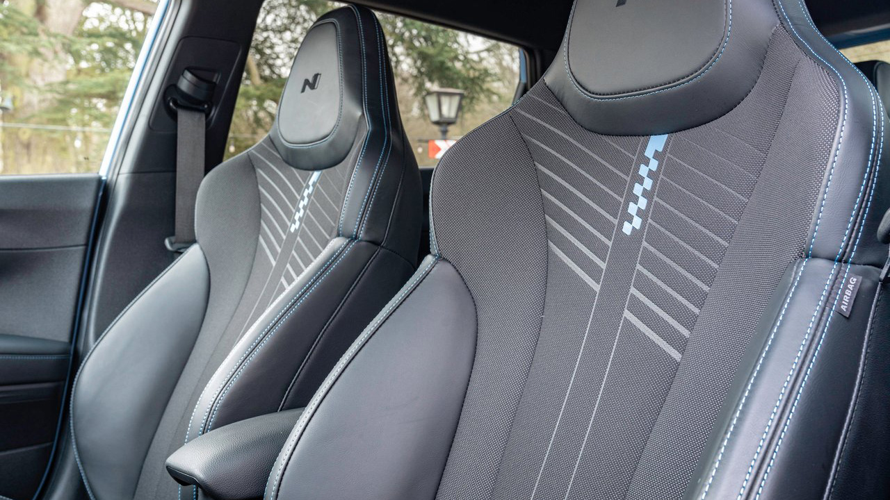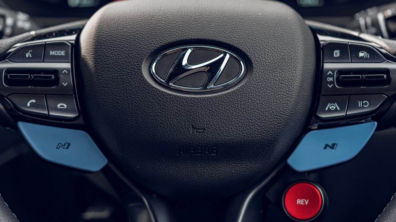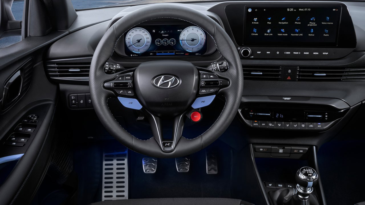 Περνώντας στο εσωτερικό του Hyundai i20 N, το βλέμμα του κάθε λάτρη της οδήγησης πηγαίνει αυτομάτως στα μπάκετ καθίσματα. Τα προσκέφαλα φέρουν το σήμα “Ν” και είναι ενσωματωμένα στα καθίσματα, τα οποία με την σειρά τους προσφέρουν εξαιρετική πλευρική στήριξη. Το δεύτερο πιο εντυπωσιακό στοιχείο είναι σίγουρα το τιμόνι, με τα δύο μπλε κουμπιά και το κυκλικό κόκκινο για τα οποία θα μιλήσουμε αναλυτικά στη συνέχεια. Το “hardcore” περιβάλλον ολοκληρώνεται με τα αλουμινένια πεντάλ, τον επιλογέα που φέρει το γράμμα “Ν” και τις μπλε ραφές. Κατά τα άλλα, η ποιότητα των υλικών στο ταμπλό κινείται στο ίδιο μήκος κύματος με τις “απλές” εκδόσεις του i20. Ασφαλώς δεν απουσιάζει η οθόνη μεγέθους 8 ιντσών σε ρόλο infotainment, η οποία προσφέρει την απαραίτητη συνδεσιμότητα μέσω Android Auto και Apple CarPlay, αλλά και άλλες διευκολύνσεις, όπως για παράδειγμα την προβολή της κάμερας οπισθοπορείας. Ιδιαίτερα πρακτική είναι και η δεύτερη ψηφιακή οθόνη 10 ιντσών σε ρόλο πίνακα οργάνων, η οποία στο “Sport” πρόγραμμα οδήγησης προσφέρει πληροφορίες, όπως η θερμοκρασία λαδιού, η πίεση του turbo και η live απεικόνιση της ροπής του κινητήρα.