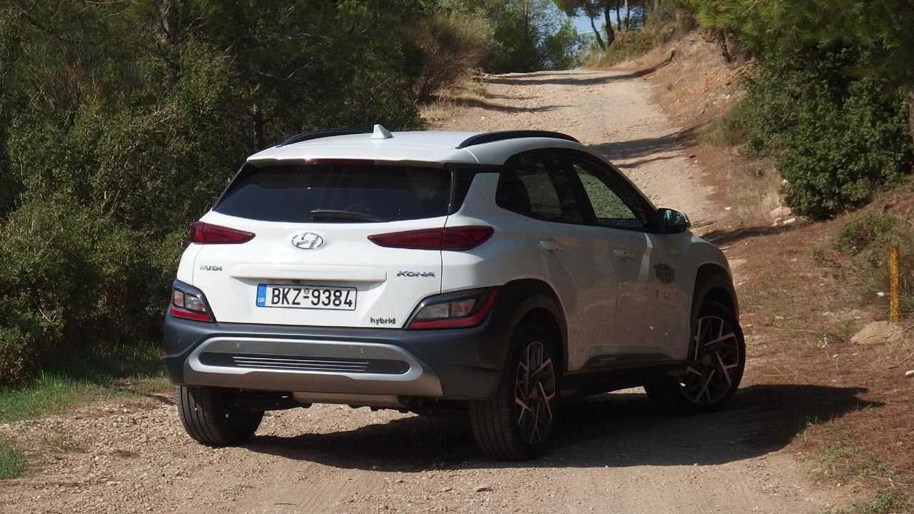 To Kona Hybrid είναι ένα ήσυχο και άνετο αυτοκίνητο στο δρόμο ακόμη και στην κορυφαία έκδοση Distinctive της δοκιμής, η οποία έφερε 18ρηδες τροχούς και ελαστικά με 45άρι προφίλ. Τα περιθώρια πρόσφυσης είναι υψηλά και σε συνδυασμό με την πολύ καλή λειτουργία των ηλεκτρονικών συστημάτων θα κινηθείτε γρήγορα σε κάθε διαδρομή. Τα όρια στις σπορ ανησυχίες του οδηγού βάζουν το τιμόνι με την ελλιπή πληροφόρηση και η αίσθηση του μεσαίου πεντάλ που δεν είναι απόλυτα γραμμική. Όπως και να έχει το υβριδικό Kona δεν σχεδιάστηκε για να κινείται διασκεδαστικά αλλά με ταχύτητα και ασφάλεια και αυτό το καταφέρνει πολύ καλά. Ως εκπρόσωπος της κατηγορίας των SUVs “βλέπει” και χωματόδρομους και δεν θα αντιμετωπίζει πρόβλημα σε πατημένα κομμάτια. Οι ζάντες των 18 ιντσών με τα αντίστοιχα χαμηλού προφίλ ελαστικά θέλουν όμως προσοχή και οι στάνταρ τροχοί των 16 ιντσών είναι μια καλύτερη επιλογή που προσφέρει ακόμη περισσότερο στον τομέα της άνεσης εκτός αλλά και εντός δρόμου.
