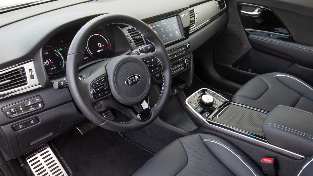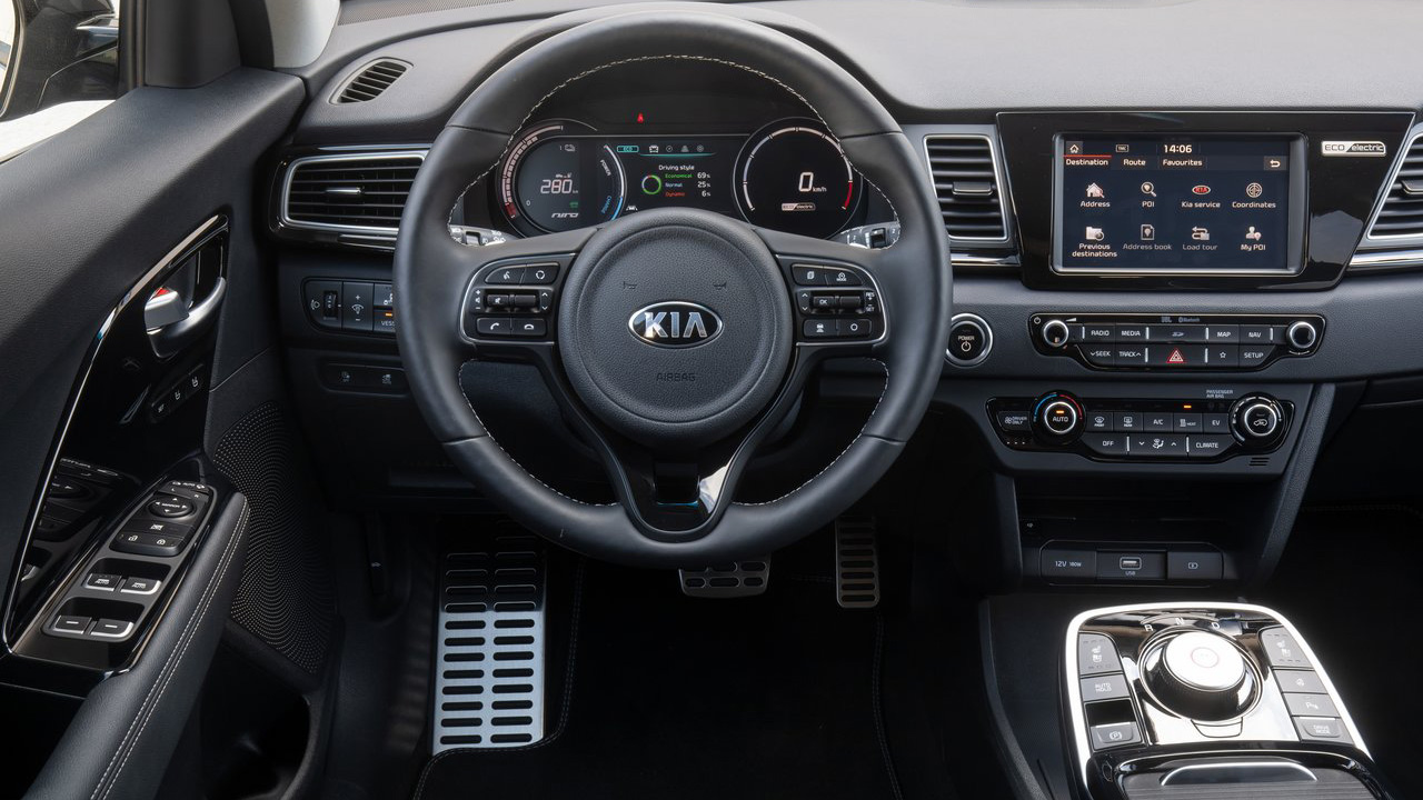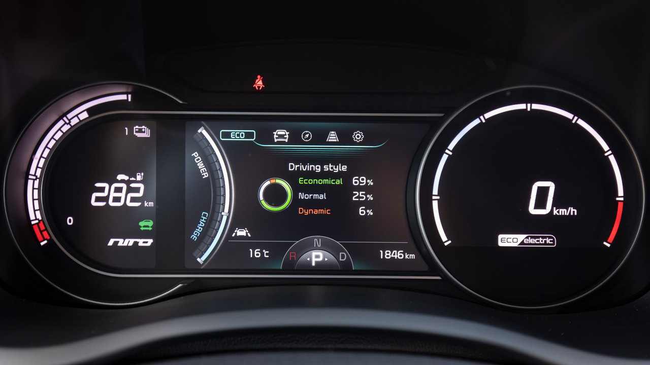Περνάμε στο εσωτερικό του Kia e-Niro και δύο λέξεις έρχονται στο μυαλό στην πρώτη επαφή… ποιότητα και τεχνολογία! Στο επάνω μέρος του ταμπλό, αλλά και στις επενδύσεις των πορτών οι επιφάνειες είναι μαλακές στην υφή, ενώ τα “piano black” διακοσμητικά στοιχεία δημιουργούν ένα όμορφο περιβάλλον. Από το κεντρικό τούνελ απουσιάζει ο επιλογέας. Την θέση του έχει πάρει ένας περιστροφικός διακόπτης για την επιλογή μετάδοσης (D,N,R,P), ο οποίος δημιουργεί αρκετό χώρο για μικροαντικείμενα. Το ψηφιακό περιβάλλον αποτελείται από μία οθόνη 7 ιντσών σε ρόλο πίνακα οργάνων πίσω από το τιμόνι, ενώ στην κεντρική κονσόλα συναντάμε οθόνη 10,25 ιντσών για την ενημέρωση και ψυχαγωγία των επιβατών. Μέσω αυτής, ο οδηγός εκτός των άλλων ελέγχει και το ηλεκτρικό σύστημα, μιας και ενημερώνεται για την ροή ενέργειας, την αυτονομία, την στάθμη της μπαταρίας και όχι μόνο. Λοιπές ενδιαφέρουσες λεπτομέρειες αποτελούν τα αλουμινένια πεντάλ, το τριάκτινο τιμόνι και τα paddles. Ρόλος των τελευταίων δεν είναι ασφαλώς να αλλάζουν σχέσεις, αλλά να ρυθμίζουν την ένταση της ανάκτησης ενέργειας σε τρία επίπεδα.