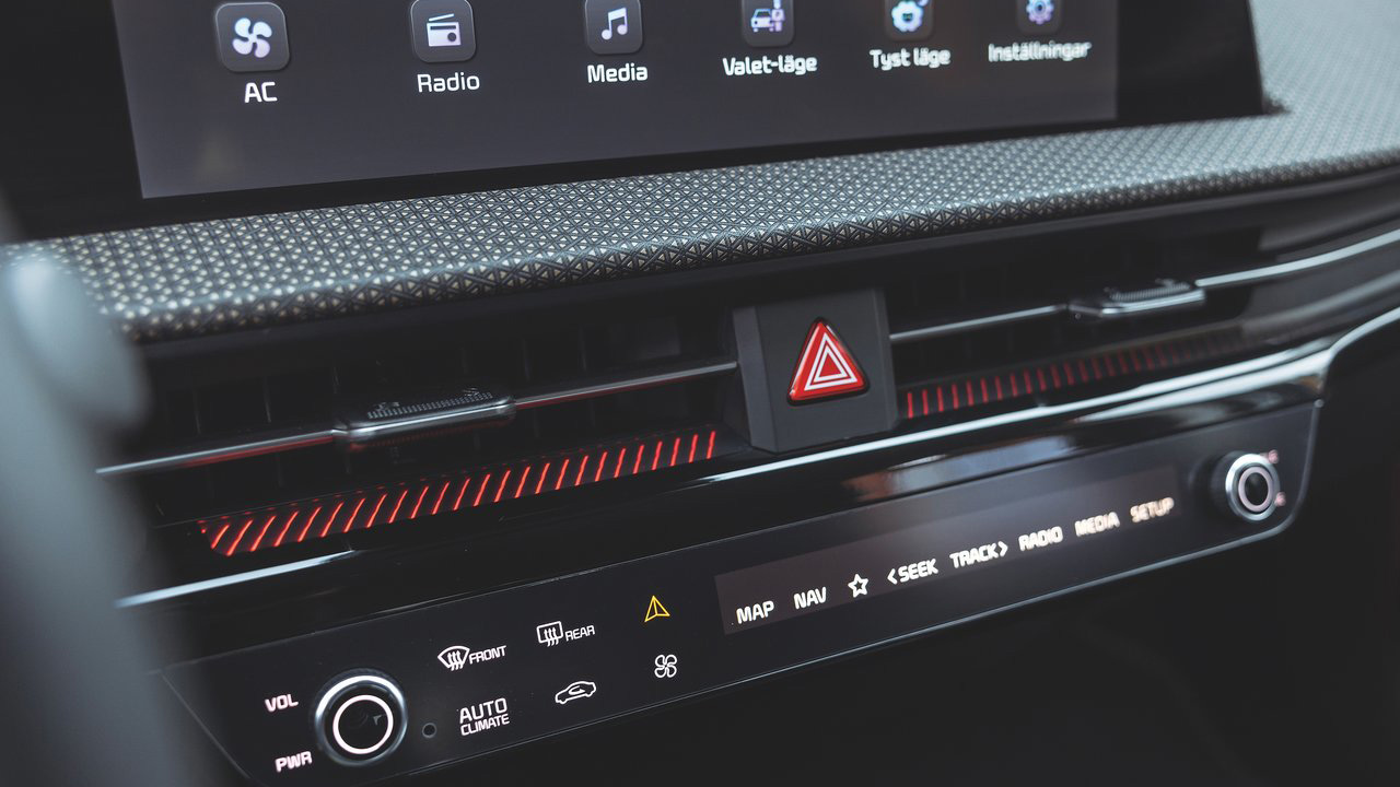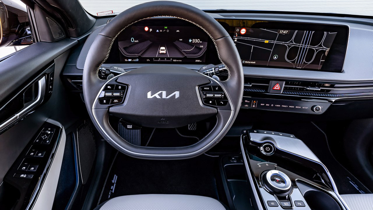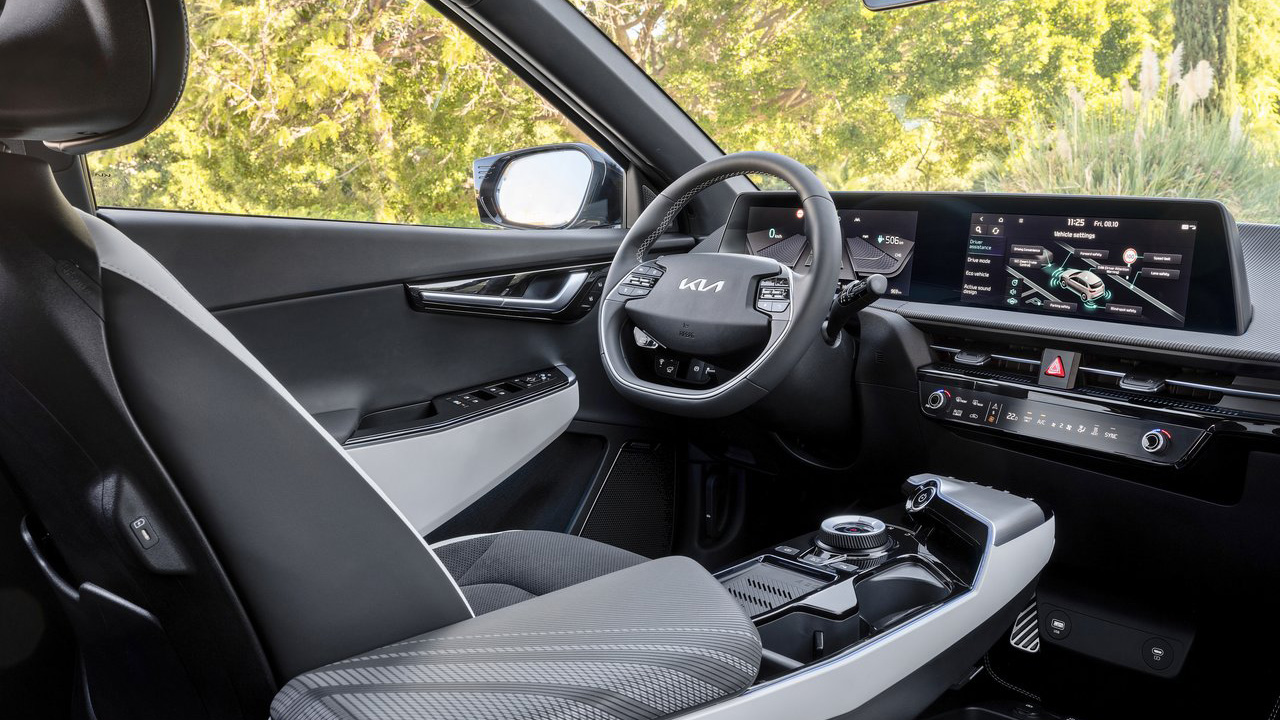 Ανοίγοντας την στιβαρή πόρτα του Kia EV6, ο οδηγός έρχεται σε επαφή με ένα άκρως ποιοτικό και ψηφιακό περιβάλλον. Οι περισσότερες επιφάνειες καλύπτονται από μαλακά στην υφή πλαστικά, ενώ εκτεταμένη είναι η χρήση vegan δέρματος και ανακυκλωμένου
