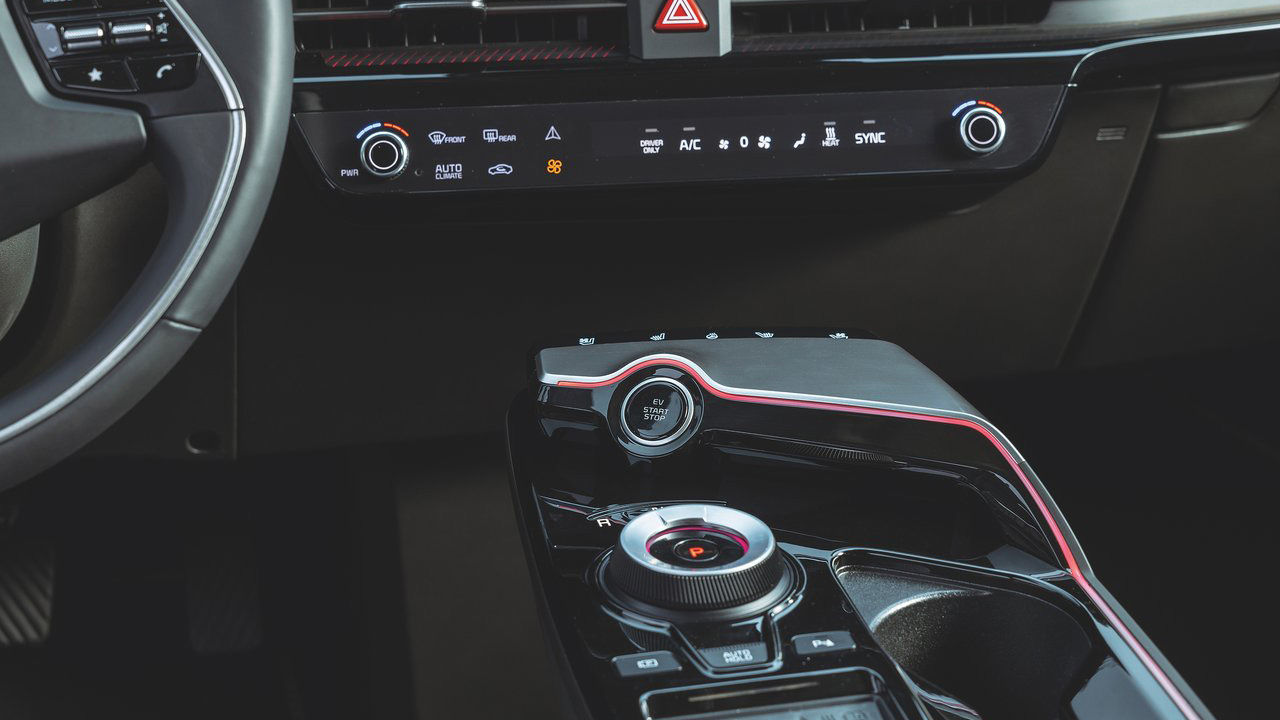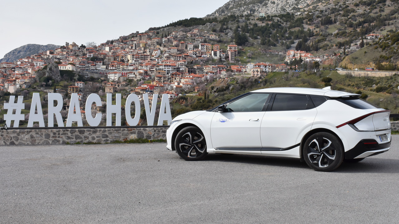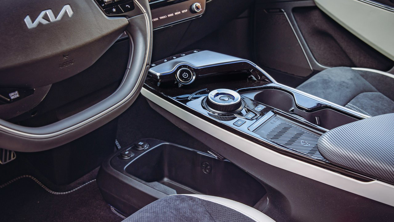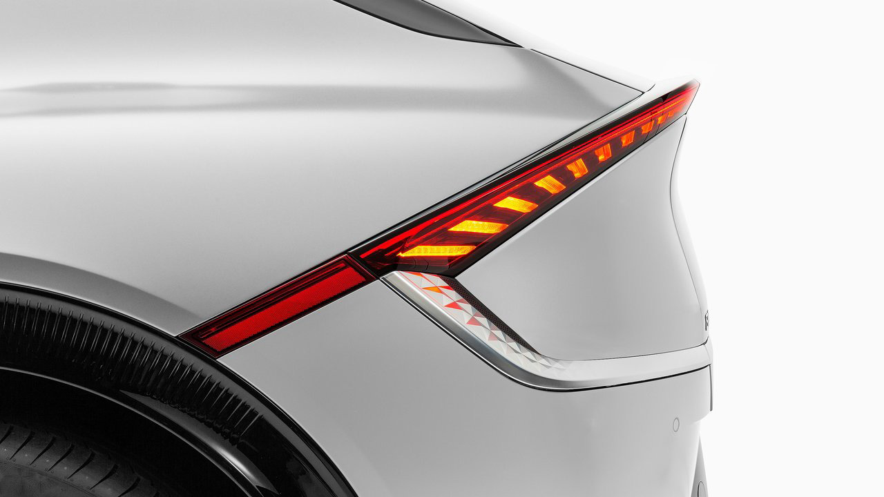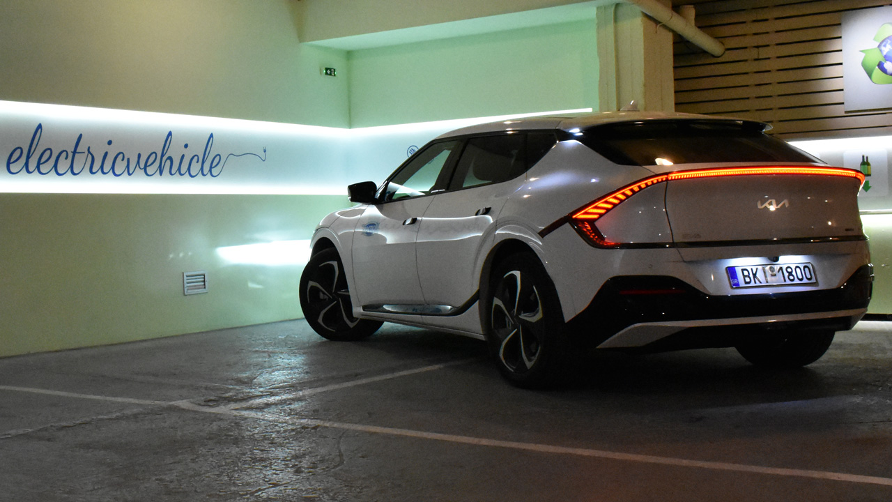 Όσο για την σχεδίαση, είναι άκρως φουτουριστική και μαγνητίζει τα βλέμματα, κάτι που το αντιλαμβάνεται κανείς από τις αντιδράσεις του κόσμου στην θέα του μοντέλου. Το εμπρός τμήμα είναι ιδιαίτερα δυναμικό, κυρίως λόγω των δύο έντονων νεύρων στο καπό και των LED εμπρός φωτιστικών σωμάτων. Πηγαίνοντας προς το πίσω μέρος, η σχεδίαση γίνεται όλο και πιο “τολμηρή”, με στοιχεία όπως οι “κρυφές” χειρολαβές, το κεκλιμένο πίσω μέρος με coupe φιλοσοφία και οι μεγάλες ζάντες αλουμινίου 20 ιντσών. Σίγουρα, όμως, το πιο εντυπωσιακό τμήμα είναι το πίσω, εκεί που υπάρχει μία αεροτομή στο επάνω μέρος, η LED λωρίδα που γεφυρώνει τα φωτιστικά σώματα, το μεγάλο λογότυπο της Kia και ασφαλώς η ηλεκτρικά ανοιγόμενη υποδοχή για φόρτιση. Μιας και αναφερθήκαμε στην αεροτομή, αξίζει να τονίσουμε ότι εντυπωσιακή είναι και η θέα της από τους πλευρικούς καθρέφτες, αφού ο οδηγός βλέπει την φωτιζόμενη άκρη της, αλλά και τους “φουσκωμένους” θόλους στον πίσω άξονα. Εντυπωσιακό!