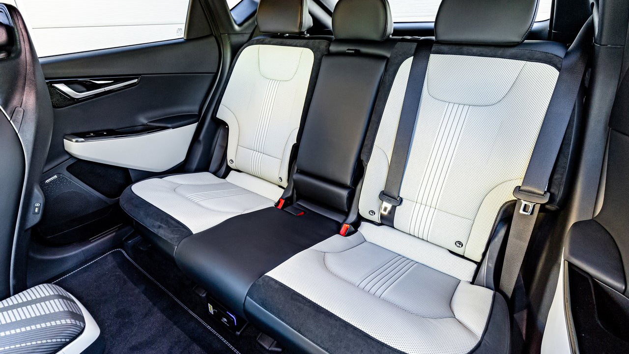 Πάμε και στους χώρους, τομέας στον οποίο εντυπωσιάζει το αμιγώς ηλεκτρικό Kia EV6. Το μεταξόνιο αγγίζει την εντυπωσιακή τιμή των 2.900 χλστ., όταν ενδεικτικά ένα Skoda Octavia έχει μεταξόνιο 2.680 χλστ. Σε συνδυασμό με το επίπεδο πάτωμα και την απουσία τούνελ μετάδοσης, προκύπτουν πραγματικά τεράστιοι χώροι για τα πόδια των πίσω επιβατών. Το ίδιο ισχύει και για κεφάλι των πίσω επιβατών, παρά την κεκλιμένη οροφή, ενώ χωρίς ιδιαίτερες παραχωρήσεις είναι εφικτό να βολευτούν και τρεις επιβάτες στις πίσω θέσεις. Ασφαλώς, η πρακτικότητα “εκτοξεύεται” με μεγάλες θήκες για μικροαντικείμενα στις πόρτες, στο κεντρικό “τούνελ” και κάτω από το υποβραχιόνιο. Αξιοσημείωτος είναι και ο τεράστιος χώρος κάτω από την κεντρική κονσόλα με αντιολισθητική επιφάνεια, εκεί όπου οι επιβάτες μπορούν να τοποθετήσουν από μία μεγάλη τσάντα (έχει και μικρό γάντζο για την συγκράτησή της), μέχρι παπούτσια ή κάποια βρεγμένη ομπρέλα κλπ.
