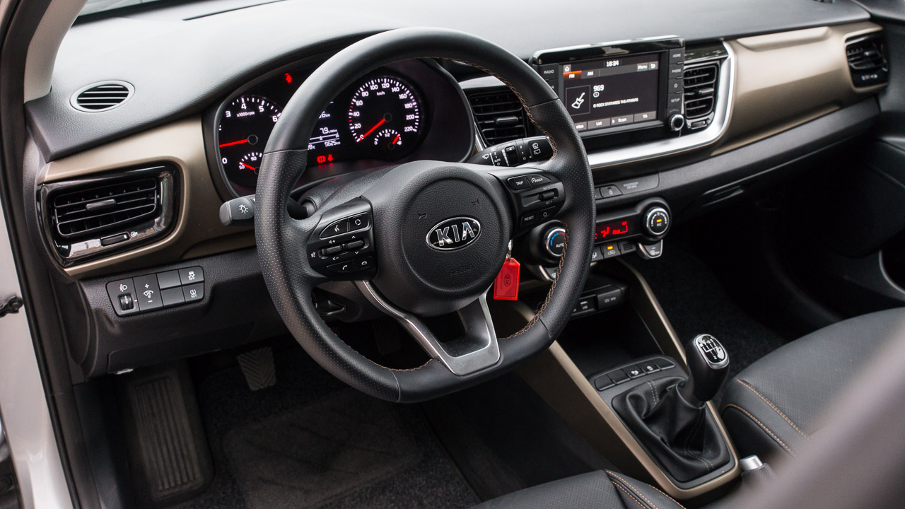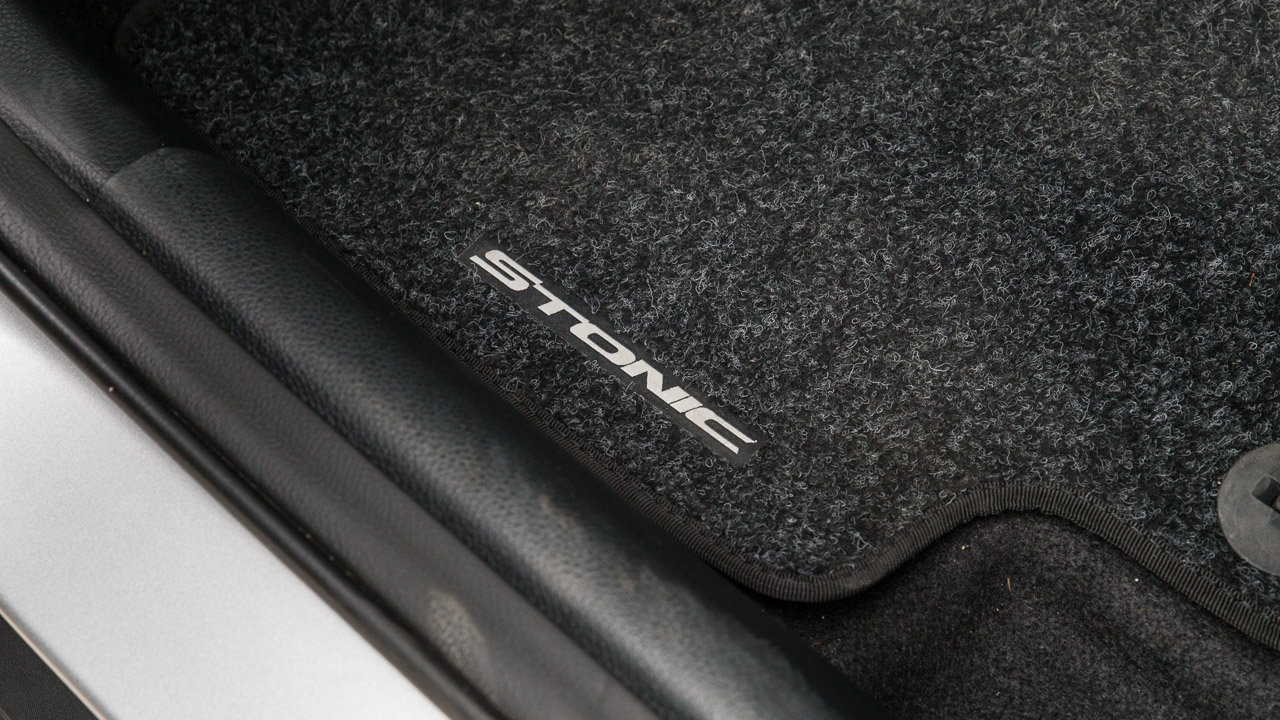 Η σχεδίαση της καμπίνας και συγκεκριμένα του ταμπλό κινείται στο ίδιο μήκος κύματος με την εξωτερική σχεδίαση του Stonic. Το “σατινέ” φιλέτο στο κέντρο του ταμπλό που αγκαλιάζει τους κεντρικούς αεραγωγούς και την οθόνη αφής του συστήματος πολυμέσων, σε συνδυασμό με τις έγχρωμες σε μεταλλικό στιλ επενδύσεις κατά μήκος του ταμπλό δημιουργούν μια μοντέρνα εικόνα που ενισχύεται από τη σχεδίαση του τριάκτινου τιμονιού. Οι αποθηκευτικοί χώροι για μικροαντικείμενα είναι ικανοποιητικοί σε μέγεθος και αριθμό και όπως και με τα περισσότερα μοντέλα των Κορεατών τα χειριστήρια βρίσκονται σε θέσεις που συνηθίζονται γρήγορα από τον οδηγό συμβάλλοντας έτσι στα πολύ καλά επίπεδα εργονομίας. Σε αυτό συμβάλλει και η θέση οδήγησης που έρχεται εύκολα στα μέτρα σας, τουλάχιστον για ύψη έως και 1,85 μ.