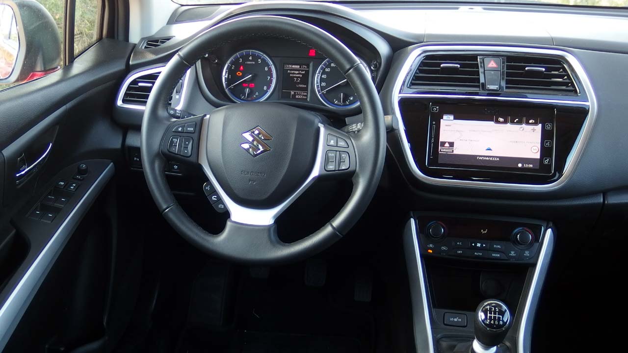 Όσον αφορά στους… αριθμούς τώρα. Το νέο Suzuki S-Cross στην συγκεκριμένη έκδοση έχει κάτω από το καπό του τον 1.4 λτ. BoosterJet βενζινοκινητήρα ο οποίος αποδίδει 129 ίππους στις 5.500 σ.α.λ. και 235 Nm ροπής από τις 2.000 έως και τις 3.000 σ.α.λ. Τιμές που του χαρίζουν 0-100 χλμ./ώρα σε 10,2 δλ. (0,7 δλ. παραπάνω από την δικίνητη έκδοση) και τελική ταχύτητα 195 χλμ./ώρα (ίδια με αυτήν της δικίνητης έκδοσης). Στον τομέα των περιβαλλοντικών επιδόσεων τώρα, οι εκπομπές CO2 είναι στα 132-133 γρ./χλμ., ενώ η μέση κατανάλωσή του σύμφωνα με το εργοστάσιο είναι στα 5,9 λίτρα/100 χλμ. Εμείς στην πράξη είδαμε 6,6 λίτρα/100 χλμ. με οδήγηση αποκλειστικά σε αστικό περιβάλλον και όχι μεικτές συνθήκες όπως συνηθίζουμε στις δοκιμές μας.