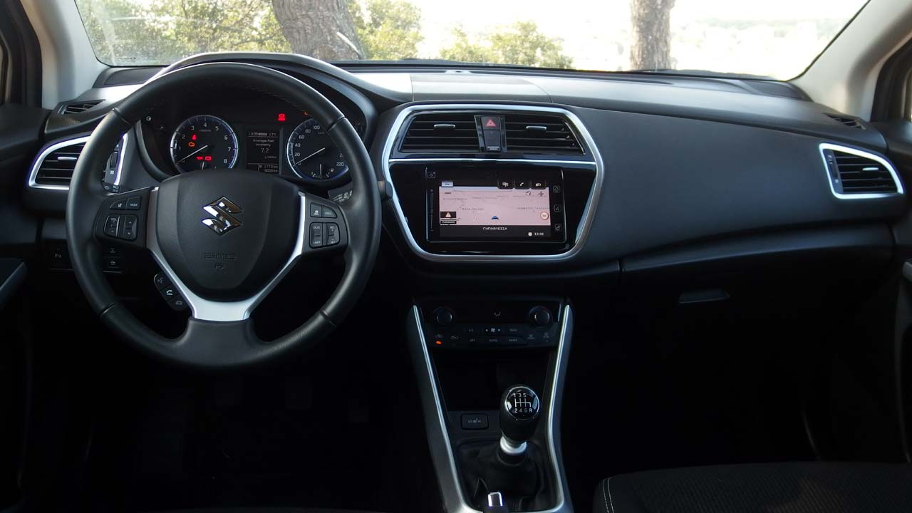 Αυτό που μπορώ να πω με σιγουριά, έπειτα από τόσες ημέρες συμβίωσης και σχεδόν 1.000 χλμ. μαζί του, είναι πως πρόκειται για ένα μοντέλο που καλύπτει όλες τις ανάγκες μιας σύγχρονης οικογένειας με νέα μέλη και όλα τα παρελκόμενά τους! Στο εσωτερικό, δίνεται έμφαση στην πρακτικότητα, με τις θήκες για μικροαντικείμενα, την ευρυχωρία για πέντε επιβάτες ή δύο παιδικά καθίσματα και μεσαίο επιβάτη πίσω και τον αυξημένο χώρο αποσκευών, με τον τελευταίο να αγγίζει τα 430 λτ. (έως 1.230 λτ. με τα καθίσματα αναδιπλωμένα), ο οποίος χωρούσε με ευκολία καρότσι διδύμων και βαλίτσα ταξιδιού. Σχεδιαστική αλλά και ουσιαστική είναι και η αναβάθμιση στο εσωτερικό του αυτοκινήτου. Τα υλικά που έχουν χρησιμοποιηθεί στο άνω μέρος του ταμπλό είναι ποιοτικά με το πλαστικό να είναι μαλακό, ενώ η συναρμογή τους είναι εξαιρετική και σε πείθει πως σε βάθος χρόνου δεν θα υπάρχουν τριγμοί που να προέρχονται από αυτά. Στις πόρτες, τα πάνελ των θυρών παραμένουν σκληρά. Ο πίνακας οργάνων είναι ανασχεδιασμένος και στο κέντρο του έχει έγχρωμη οθόνη η οποία προβάλει ενδείξεις του υπολογιστή ταξιδιού αλλά και του υβριδικού συστήματος (φόρτιση, στάθμη ενέργειας μπαταρίας κλπ.). Η Suzuki εδώ πάει πιο… παραδοσιακά και δεν επιλέγει τον πλήρως ψηφιακό πίνακα. Στο κέντρο του ταμπλό υπάρχει έγχρωμη οθόνη αφής για το σύστημα πολυμέσων (με όλες τις σύγχρονες δυνατότητες συνδεσιμότητας) μεγέθους 9,0 ιντσών, η οποία είναι σαφώς πιο προηγμένη με καλύτερη ανάλυση, ταχύτερη απόκριση στις εντολές και πιο όμορφα γραφικά/περιβάλλον. Λίγο πιο κάτω είναι οι αεραγωγοί, ο διακόπτης “αλάρμ” και κουμπί για την πίσω κάμερα (διαθέτει και περιμετρική λήψη του αυτοκινήτου), και μετά τα χειριστήρια του κλιματισμού, ο οποίος συνοδεύεται από οθόνη υγρών κρυστάλλων για τις απαραίτητες ενδείξεις θερμοκρασίας και κατεύθυνσης του αέρα. Εργονομικά είναι καλά μελετημένη η καμπίνα με διακόπτες και χειριστήρια σε σωστή απόσταση από τα ακροδάχτυλα του οδηγού (με εξαίρεση τους διακόπτες αριστερά, χαμηλά στο ταμπλό). Η χωρητικότητα της είναι και αυτή πολύ καλή. Τέσσερα άτομα θα βολευτούν άνετα, ενώ ο μεσαίος επιβάτης στο πίσω κάθισμα θα ενοχληθεί ελαφρώς από το τούνελ μετάδοσης, ανάμεσα στα πόδια του. Χώροι για αντικείμενα υπάρχουν αρκετοί στην καμπίνα και στις “τσέπες” των θυρών.