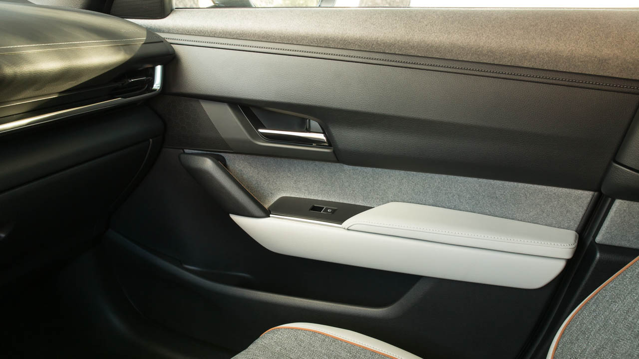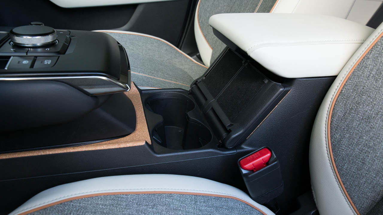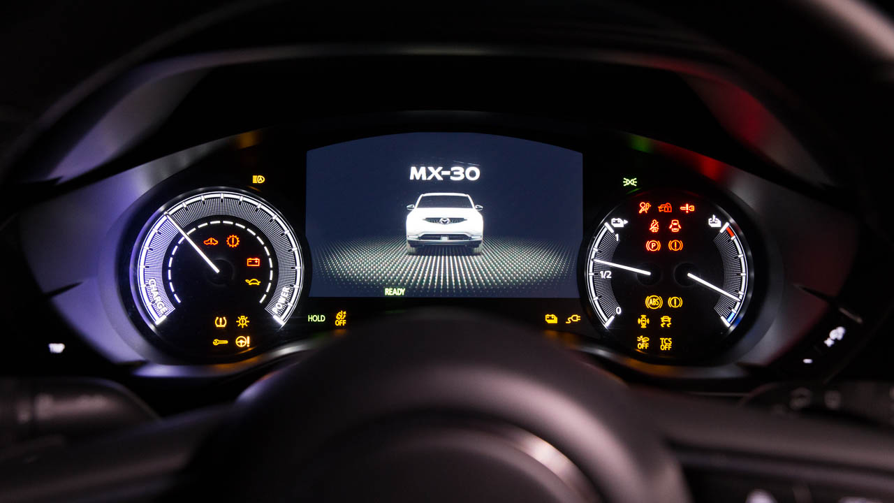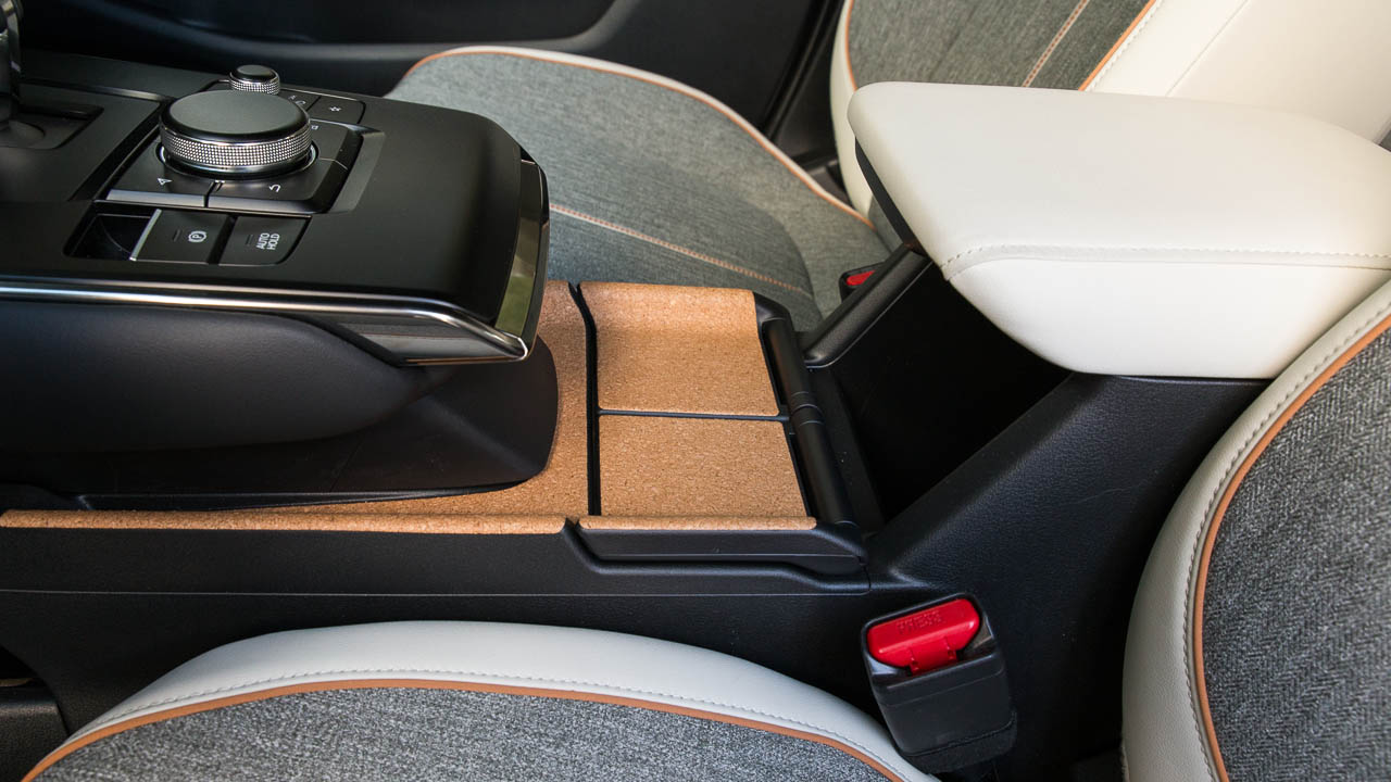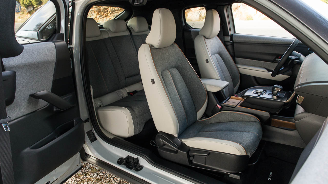 Η καμπίνα του MX-30 καταφέρνει να κερδίσει τις εντυπώσεις και με το design αλλά και τις πρακτικές λύσεις που προσφέρει παραμένοντας κοντά στη σχεδιαστική ταυτότητα που έχουμε δει και στην υπόλοιπη γκάμα των μοντέλων των Ιαπώνων. Συνολικά βλέπουμε στο εσωτερικό τρεις οθόνες πληροφοριών, μια επτά ιντσών στον πίνακα πληροφοριών του οδηγού, μία 8,8 ιντσών στην κορυφή του ταμπλό αλλά και μία ακόμη αφής με διαγώνιο στις επτά ίντσες. Η τελευταία βρίσκεται τοποθετημένη χαμηλά στην ξεχωριστή σχεδιαστικά κονσόλα δύο επιπέδων και προορίζεται αποκλειστικά για τον έλεγχο του κλιματισμού φέροντας παράλληλα και φυσικά κουμπιά. Η δύο επιπέδων κονσόλα είναι και εκείνη που τραβά το βλέμμα με τη σχεδίαση αλλά και την χρηστικότητα της.