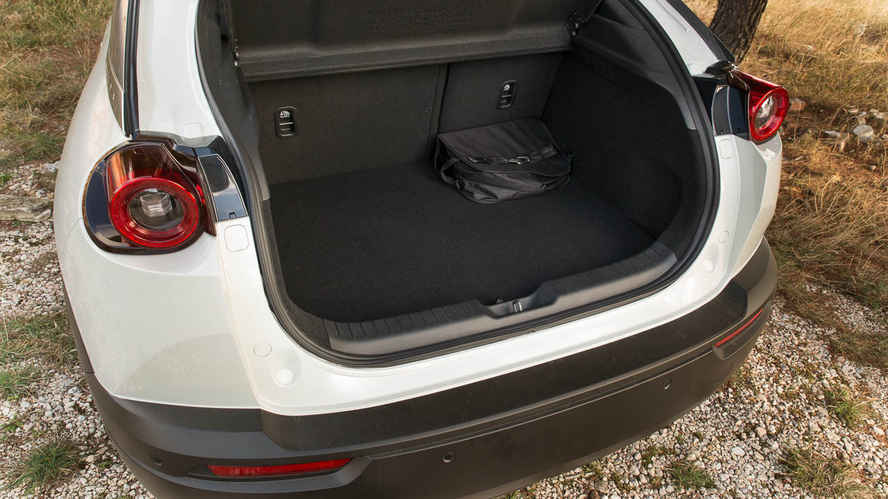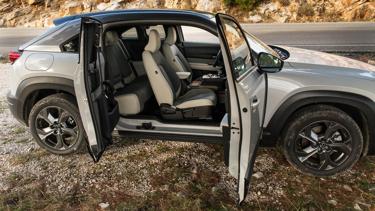 Με διαστάσεις που το τοποθετούν ως μοντέλο στη μικρομεσαία κατηγορία το MX-30 έχουν τους χώρους για να εξυπηρετήσει τις καθημερινές ανάγκες μιας 4μελούς οικογένειας. Το μήκος του ηλεκτρικού SUV είναι 4.395 χλστ. με το πλάτος και το ύψος του να φτάνουν στα 1.795 και 1.570 χλστ. αντίστοιχα. Οι δύο μικρές πίσω πόρτες που ανοίγουν μόνο εφόσον ανοίξουν οι εμπρός προσφέρουν εύκολη πρόσβαση στα πίσω καθίσματα λόγω και της απουσίας της μεσαίας κολώνας.