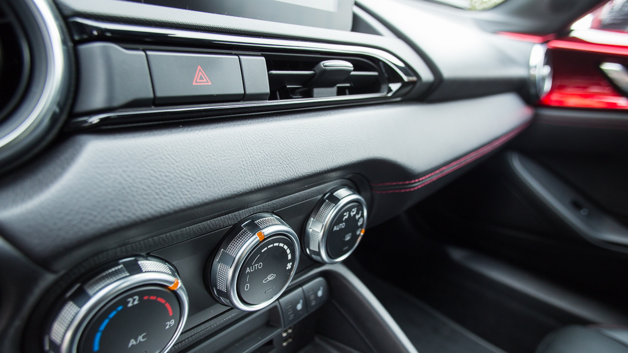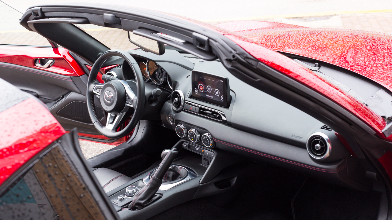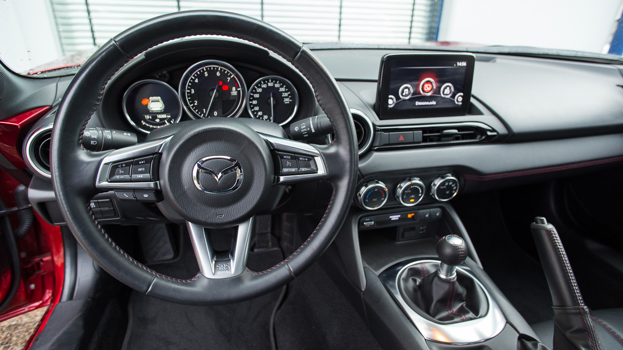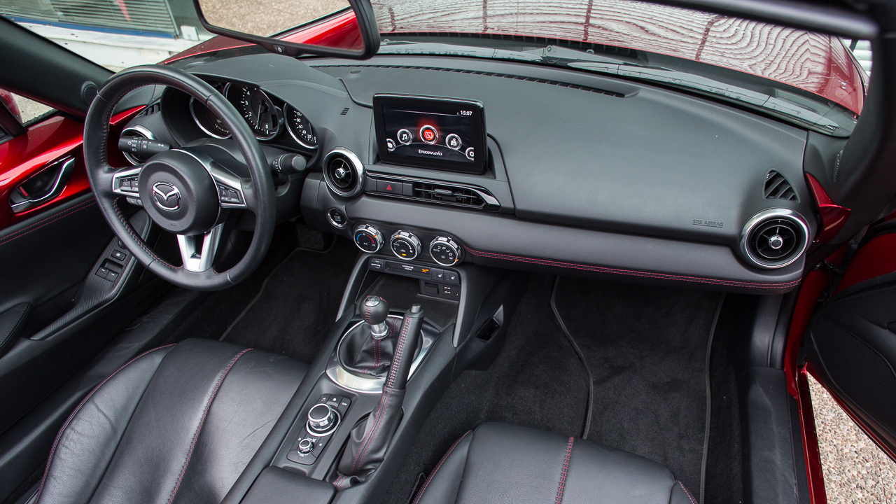 Το εσωτερικό ακολουθεί την ίδια λιτή σχεδιαστική φιλοσοφία με τις υπερβολές να απουσιάζουν. Τα πάντα σχεδόν βρίσκονται γύρω από το οδηγό που έχει αρκετό χώρο στη διάθεσή του, τουλάχιστον αν είναι έως και 1,85 μ. Η οροφή έρχεται κοντά στο κεφάλι χωρίς να ενοχλεί και τα χειριστήρια και τα κουμπιά απαιτούν πολύ λίγο χρονικό διάστημα εξοικείωσης μαζί τους. Δίπλα στο χειρόφρενο υπάρχουν μάλιστα κουμπιά και περιστροφικοί διακόπτες που ελέγχουν άριστα το σύστημα πολυμέσων, το οποίο παρουσιάζεται μέσω της κεντρικά τοποθετημένης οθόνης των επτά ιντσών. Ο συνοδηγός δεν έχει, για πρώτη φορά, ντουλαπάκι μπροστά του, όμως εκείνο ανάμεσα στις πλάτες των καθισμάτων διατηρείται και στην 4η γενιά. Η Mazda έχει τοποθετήσει και δύο ποτηροθήκες με εκείνη για τον συνοδηγό να μπορεί να μεταφερθεί και στην πλευρά του στο κεντρικό τούνελ. Το τιμόνι φέρει και τηλεσκοπική ρύθμιση, πέρα από το ύψος, και αυτό κάνει πιο εύκολη την εύρεση της σωστής θέσης για τον οδηγό.