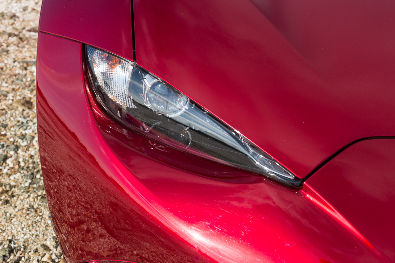 Τώρα έχουμε μπροστά μας τη νέα και 4η γενιά του δημοφιλούς roadster που σπάει σχεδόν κάθε σχεδιαστικό δεσμό με τις προηγούμενες, χωρίς όμως να αλλάξει την ουσία. Για το σχήμα το νέου MX-5 δεν μπορούν να ειπωθούν πολλά. Τα βραβεία που έχει κερδίσει και ακόμη περισσότερο τα βλέμματα που κλέβει, είτε κινείται είτε στέκεται, μιλούν από μόνα τους, ενώ αυτό ακριβώς κάνουν και κάποιοι οδηγοί που κατεβάζουν παράθυρο και σου πιάνουν την κουβέντα καθώς περιμένουν μαζί σου στο φανάρι. Με τις αναλογίες να είναι αυτές που πρέπει και τα μικρά φωτιστικά σώματα ακροβολισμένα το MX-5 δείχνει μυώδες, μικρό και κομψό ταυτόχρονα, ένα future classic σχήμα που δεν αγνοεί κανείς, για λόγους κάτι παραπάνω από εμφανείς. Με την σκληρή οροφή στο πορτμπαγκάζ γίνεται φυσικά πιο εντυπωσιακό, με την διαδικασία αναδίπλωσης να απαιτεί μόλις 13 δευτερόλεπτα και να μπορεί να ολοκληρωθεί ακόμη και με ταχύτητες έως και 10 χλμ./ώρα (πρακτικά πρέπει να είσαι σταματημένος για να λειτουργήσει).
