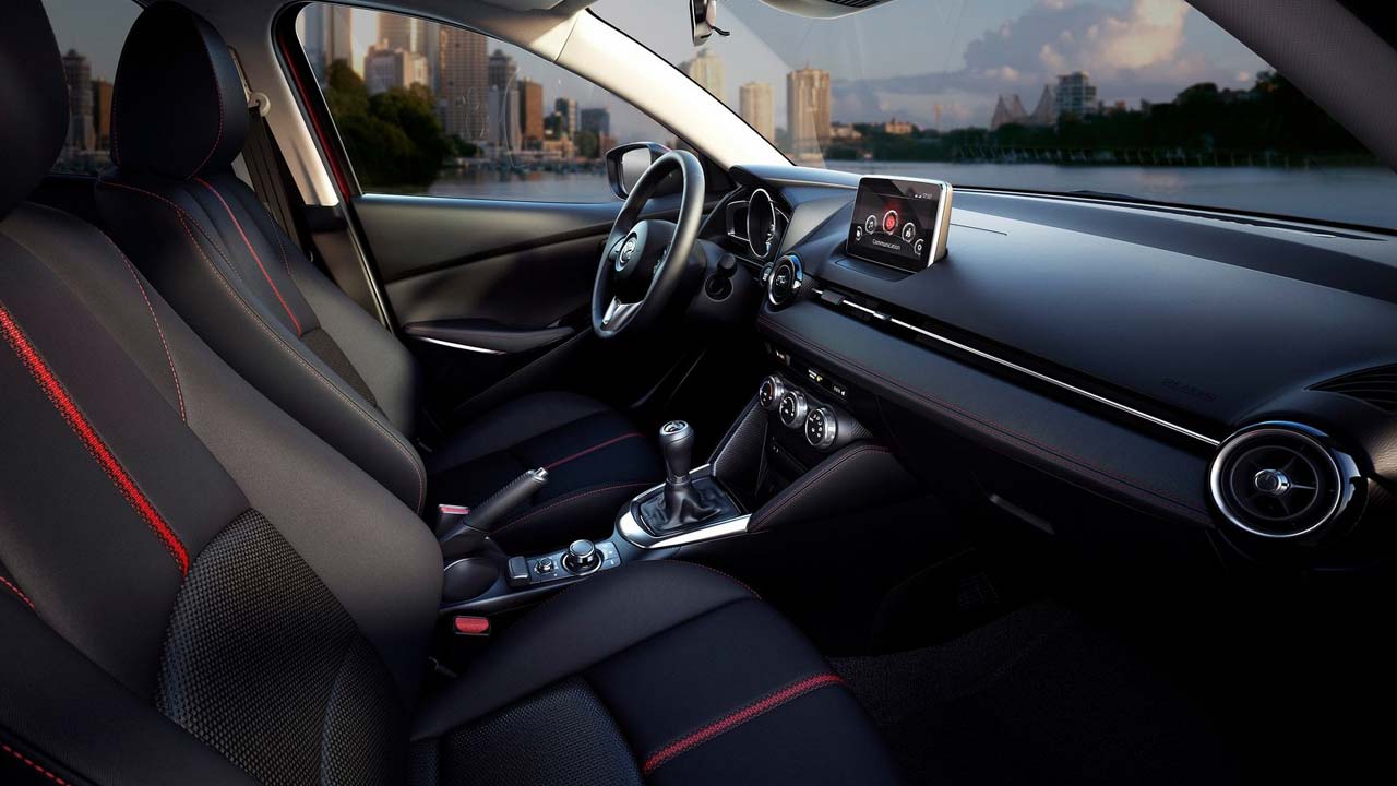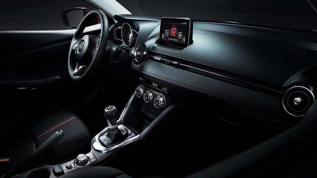 Το εσωτερικό του Mazda2 δεν συμπαθεί τις υπερβολές, ούτε στις γραμμές που ακολουθεί, ούτε στους χρωματικούς συνδυασμούς. Το μαύρο χρώμα κυριαρχεί στο συγκεκριμένο μοντέλο και η σχεδίαση δίνει προτεραιότητα στην πρακτικότητα και την εργονομία. Οι στρογγυλοί αεραγωγοί δένουν όμορφα με τις γραμμές του ταμπλό, όπως και η οθόνη που μοιάζει να αναδύεται στο άνω μέρος του. Τα υλικά είναι ποιοτικά, ενώ η συναρμολόγησή τους σε πείθει για την αντοχή τους στον χρόνο και το φινίρισμά τους είναι προσεγμένο. Θήκες υπάρχουν για μικροαντικείμενα, σε επίκαιρα σημεία στην καμπίνα, ενώ οι χώροι είναι στο μέσο όρο της κατηγορίας. Πίσω δύο ενήλικες μεσαίου αναστήματος θα βολευτούν δίχως πρόβλημα, ενώ το πορτμπαγκάζ είναι στα 250 λίτρα και φτάνει τα 882 με την αναδίπλωση των πίσω καθισμάτων.