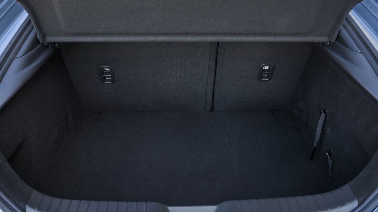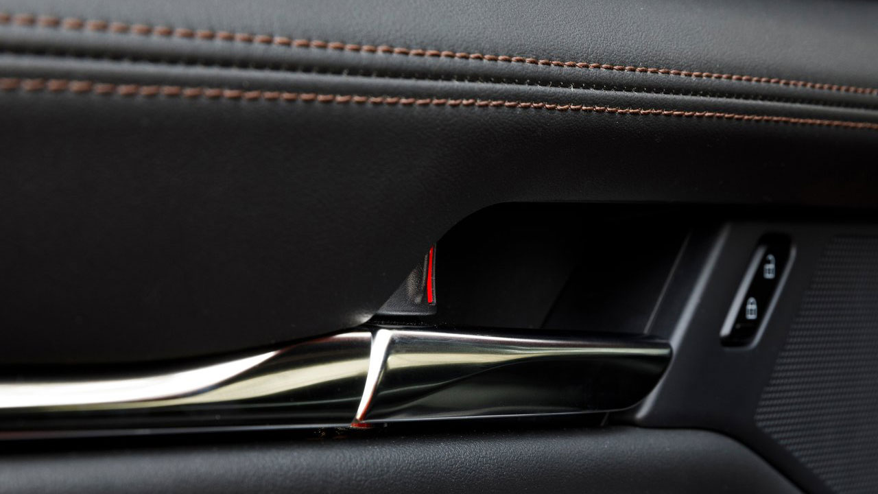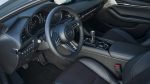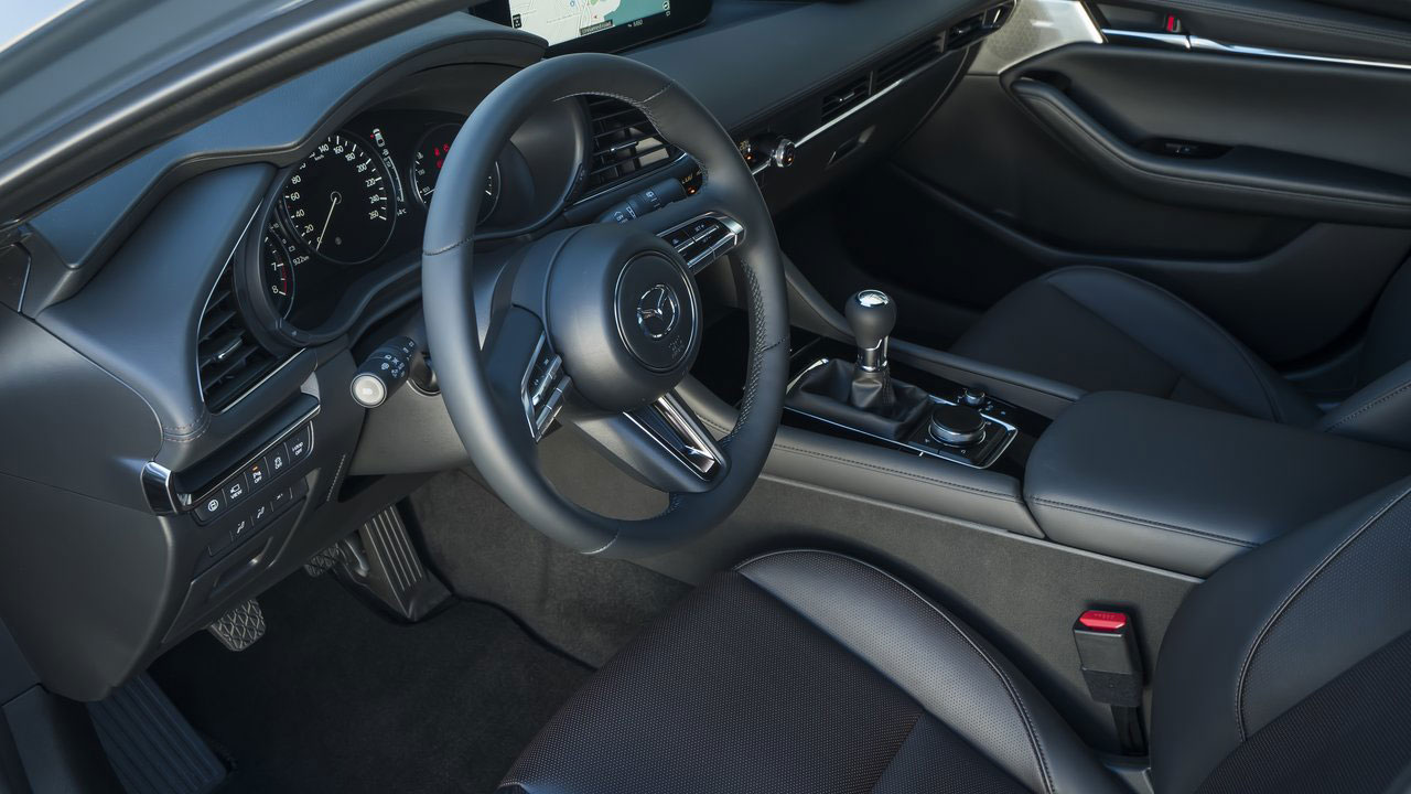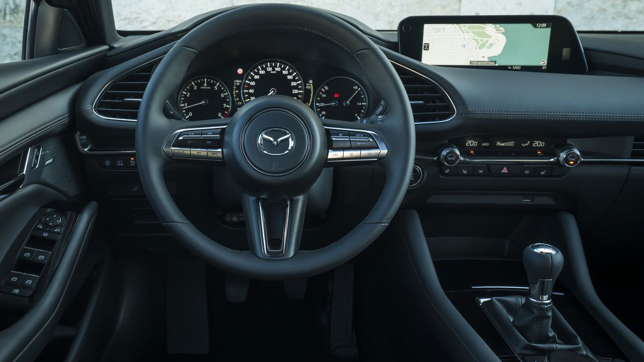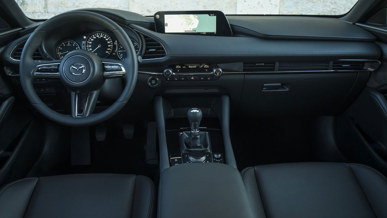 Μπορεί το Mazda3 να διαθέτει ενδιαφέρουσα σχεδίαση που το κάνει να μην περνά απαρατήρητο, αλλά ευχάριστη έκπληξη είναι και το εσωτερικό του, κυρίως λόγω της “μίνιμαλ” αισθητικής και της κορυφαίας ποιότητας. Τα υλικά που έχουν επιλεχθεί είναι ιδιαίτερα προσεγμένα, με το επάνω τμήμα του ταμπλό να φέρει δερμάτινη επένδυση. Το ίδιο ισχύει και για την κεντρική κονσόλα, με αποτέλεσμα οι επιβάτες να περιβάλλονται από μαλακές στην υφή επενδύσεις. Για την ενημέρωση και ψυχαγωγία, υπάρχει μία ψηφιακή οθόνη μεγέθους 8,8 ιντσών, η οποία παρέχει όλα τα απαραίτητα συστήματα, όπως για παράδειγμα πλοήγηση, κάμερα οπισθοπορείας, Apple CarPlay / Android Auto αλλά και τη δυνατότητα παρακολούθησης της υβριδικής λειτουργίας. Ο έλεγχός της γίνεται μέσω πιεζοπεριστροφικού διακόπτη, γεγονός που απαιτεί μερικές ώρες εξοικείωσης και θα δυσκολέψει σε κάποιες περιπτώσεις, όπως για παράδειγμα την αναγραφή της τοποθεσίας στο σύστημα πλοήγησης. Μία ψηφιακή οθόνη υπάρχει και πίσω από το τιμόνι (σε ρόλο πίνακα οργάνων), η οποία προσφέρει όλες τις απαραίτητες πληροφορίες στο οδηγό. Το αυτοκίνητο της δοκιμής εξοπλιζόταν με το πακέτο GT Plus, το οποίο προσφέρει υπερπλήρη εξοπλισμό που περιλαμβάνει εκτός των άλλων θερμαινόμενα εμπρός καθίσματα και τιμόνι, διζωνικό κλιματισμό, Head-Up Display και πολλά άλλα!
