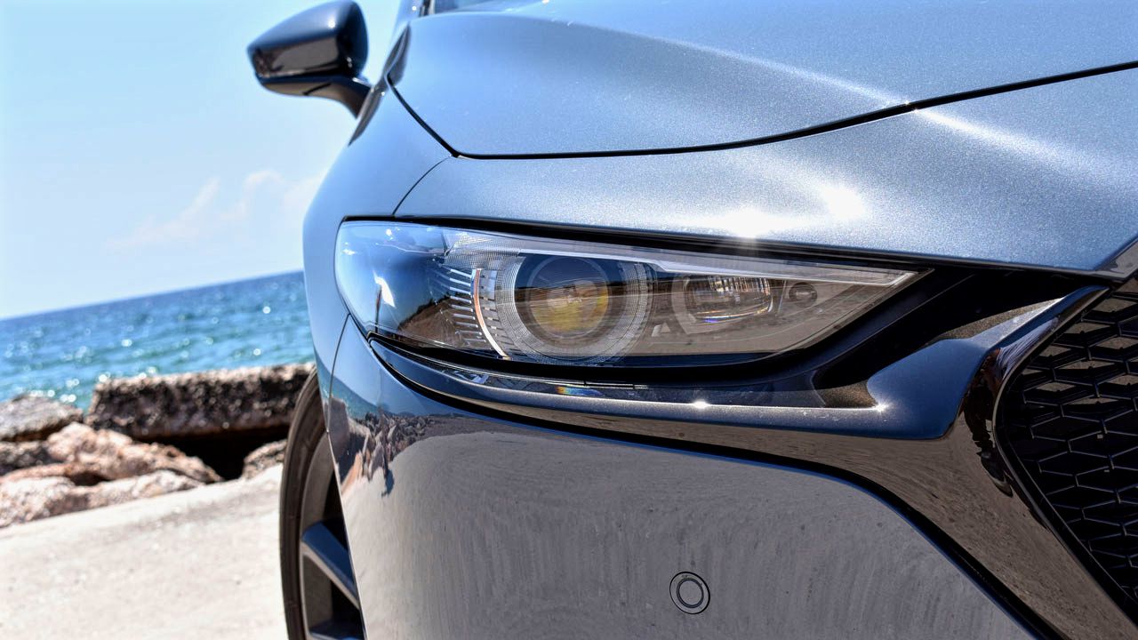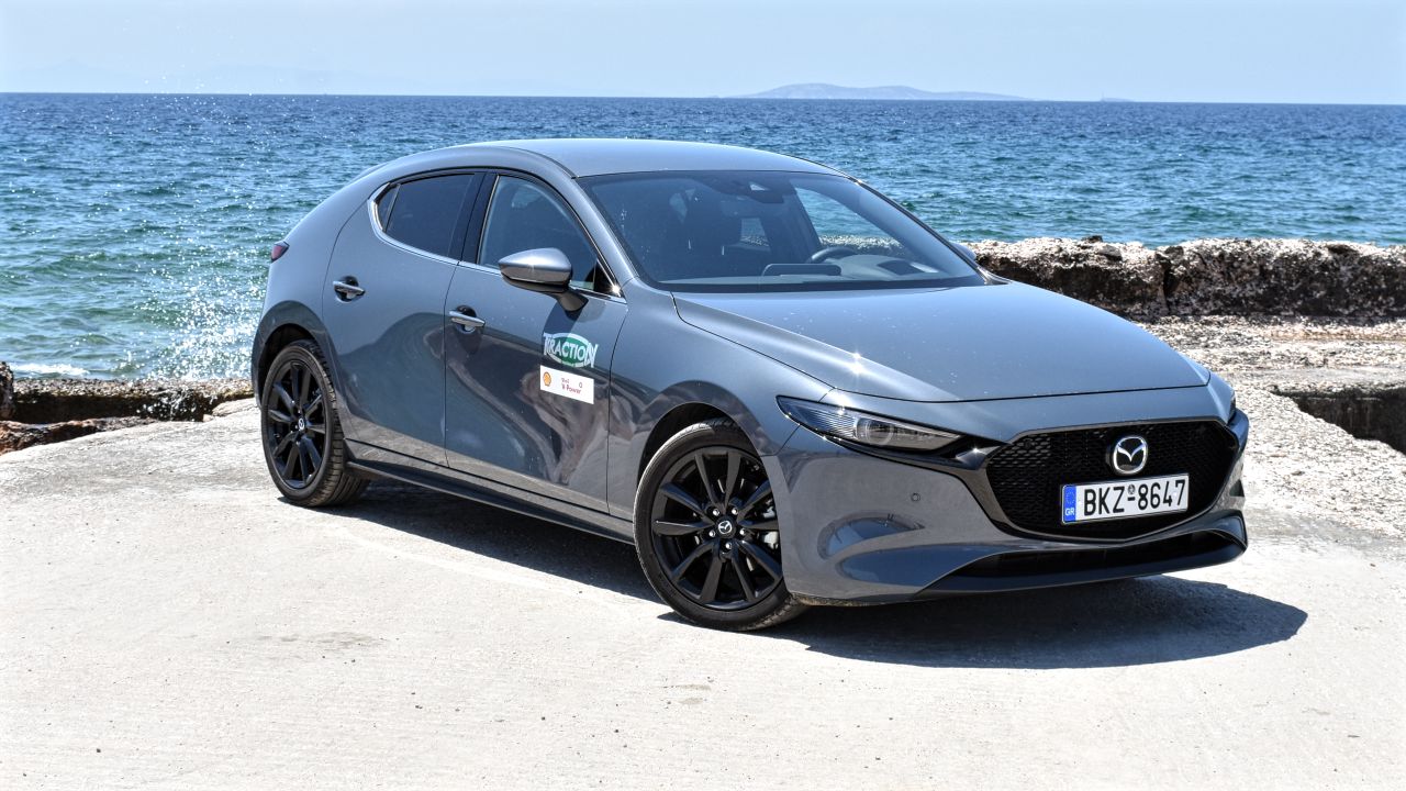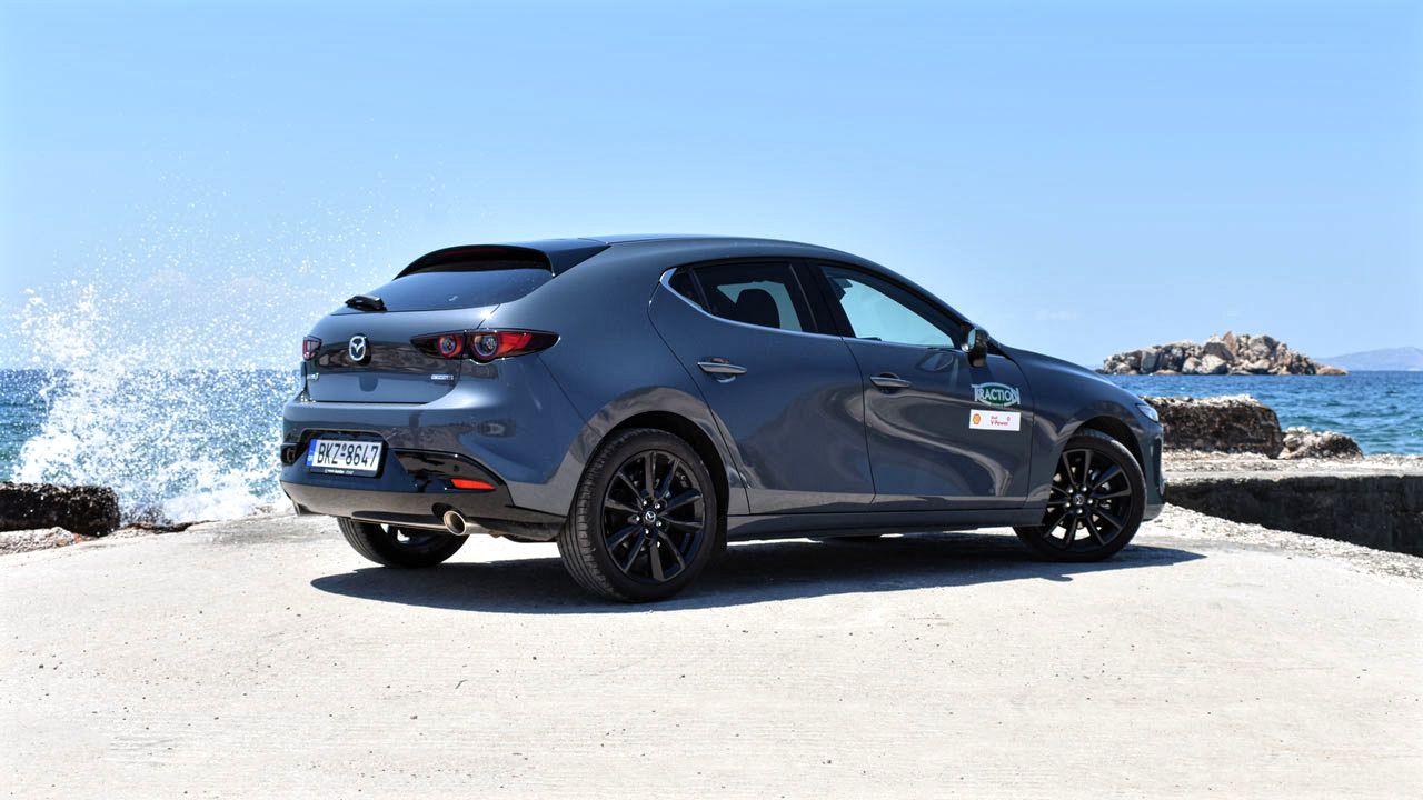 Κάτω από το καπό της ισχυρότερης έκδοσης του Mazda3 βρίσκεται ένας από τους πιο ενδιαφέροντες κινητήρες, λόγω της λειτουργίας του. Πρόκειται για ένα τετρακύλινδρο μοτέρ βενζίνης με χωρητικότητα που αγγίζει τα 1.998 κ.εκ. και φέρει την εντυπωσιακή (για κινητήρα βενζίνης) σχέση συμπίεσης που φτάνει στο 15,3:1. Πέρα από το γεγονός ότι εξοπλίζεται με ένα ήπια υβριδικό σύστημα 48V, διαθέτει την τεχνολογία SPCCI, η οποία συνδυάζει την αποδοτικότητα καυσίμου ενός κινητήρα πετρελαίου με την ισχύ και την ομαλότητα της βενζίνης. Ο κινητήρας ανάλογα με τις στροφές και το φορτίο είναι σε θέση να “επιλέγει” ανάμεσα σε συμβατική ανάφλεξη με μπουζί (όπως συμβαίνει σε κάθε κινητήρα βενζίνης) ή ανάφλεξης λόγω συμπίεσης (όπως συμβαίνει σε diesel μοτέρ). Στη δεύτερη περίπτωση, το καύσιμο μείγμα είναι ιδιαίτερα φτωχό και επιτυγχάνεται πιο αποτελεσματική καύση. Περισσότερες πληροφορίες για τον αναβαθμισμένο e-Skyactiv μπορείτε να διαβάσετε πατώντας εδώ. Στην περίπτωση του αυτοκινήτου της δοκιμής μας, η κίνηση περνά στον εμπρός άξονα (το Mazda3 διατίθεται και ως τετρακίνητο) μέσω μηχανικού κιβωτίου έξι σχέσεων (υπάρχει και η επιλογή του αυτόματου).