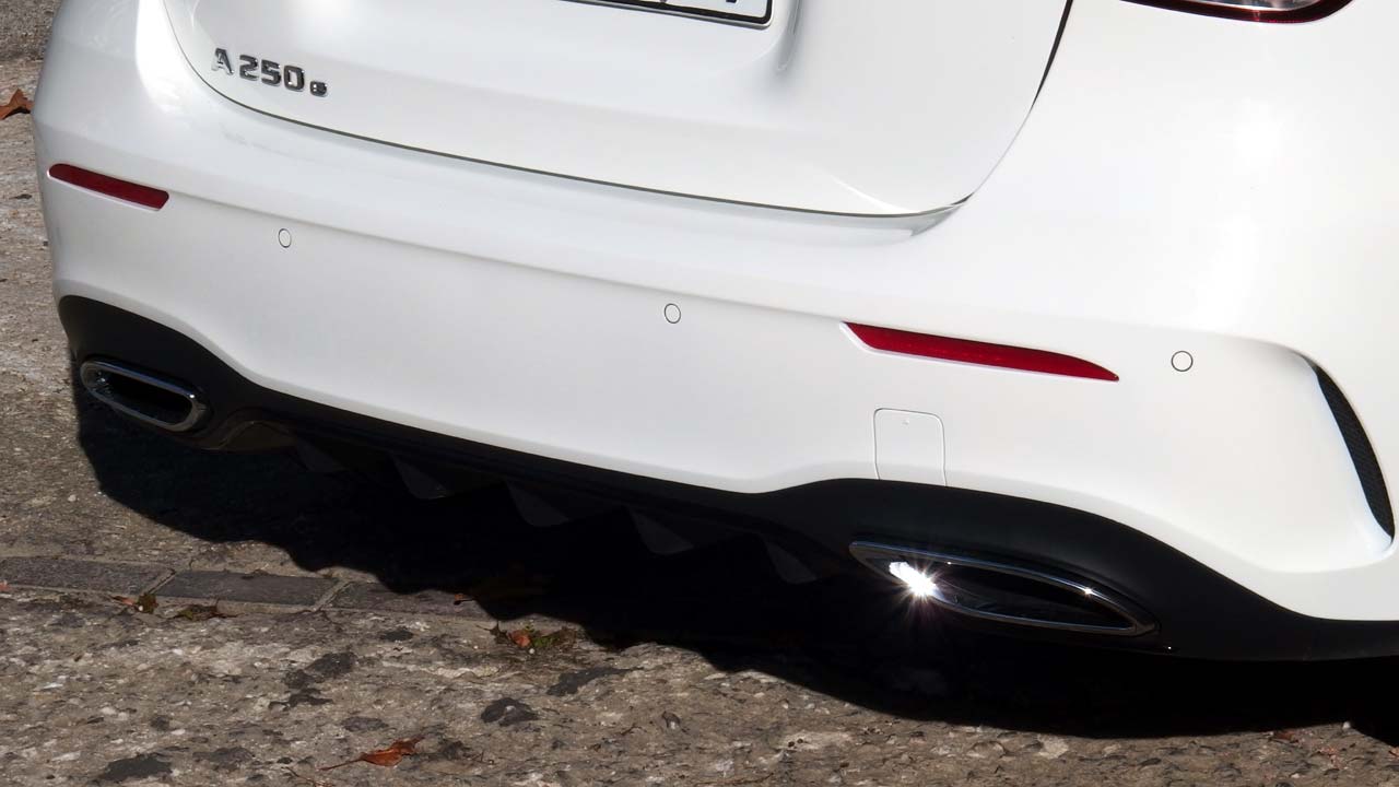 Μπορεί η Mercedes A 250 e να είναι η υβριδική έκδοση της γκάμας της A-Class, αυτό δεν σημαίνει όμως πως έχει στερηθεί κάτι σε εμφάνιση ή πως διαφοροποιείται σημαντικά σε εξωτερικά. Όλα τα χαρακτηριστικά που συναντάμε στις πλουσιότερες εκδόσεις φωνάζουν δυναμικά “παρών”. Η μάσκα εμπρός με το αστέρι στο κέντρο της, το σήμα της Mercedes στο άνω μέρος της μάσκας και τα φώτα με LED στοιχεία ημέρας (Multibeam LED για καλύτερη ορατότητα) είναι χαρακτηριστικά. Στο πίσω μέρος ξεχωρίζουν τα “αμυγδαλωτά” φώτα, ο προφυλακτήρας με το μαύρο πλαίσιο στο κάτω μέρος του και η διακριτική αεροτομή οροφής. Σχεδιαστικά έχει δοθεί έμφαση στις καθαρές γραμμές, χωρίς σχεδιαστικές φλυαρίες. Κάτι που φαίνεται και στο προφίλ του αμαξώματος, το οποίο διατρέχεται από δύο διακριτικά νεύρα, ένα που ξεκινά από τα εμπρός φτερά και περνά κάτω από τον εξωτερικό καθρέφτη για να σβήσει στο πίσω φανάρι και ένα πιο χαμηλά στις πόρτες. Όσον αφορά στις διαστάσεις της το μήκος της είναι στα 4.419 χλστ. ενώ πλάτος και ύψος είναι στα 1.796 και 1.445 χλστ. αντίστοιχα, με το μεταξόνιο να είναι στα 2.729 χλστ. Οι διαφορές της έχουν να κάνουν με το δεύτερο πορτάκι ανεφοδιασμού (εκτός από το ντεπόζιτο καυσίμου υπάρχει και αυτό για το καλώδιο του ρεύματος) και τα σήματα EQ Power φανερώνουν τον χαρακτήρα της, διακριτικά.