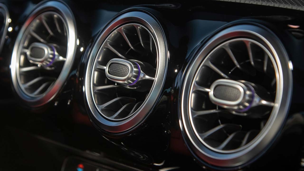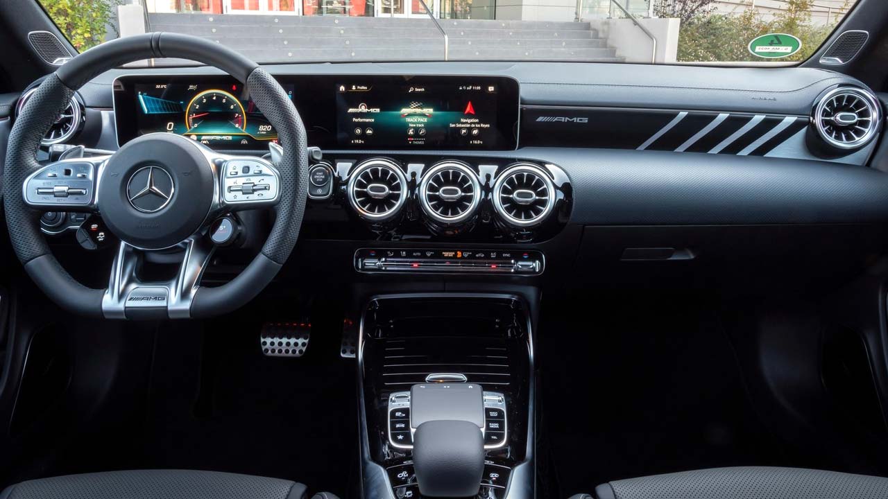 Στο εσωτερικό το template προφανώς και ήταν αυτό της “γήινης” CLA. Οι λεπτομέρειες όμως είναι πανταχού παρούσες και κάνουν αισθητή την διαφορά. Μοναδική ίσως μεγάλη αλλαγή βέβαια το τιμόνι με τα πολλαπλά χειριστήρια, από τα οποία μπορείς να επιλέξεις και τα σχετικά προγράμματα οδήγησης (Slippery, Comfort, Sport, Sport+, Race και Individual), ενώ παρών είναι φυσικά και το σύστημα πολυμέσων MBUX με τις δύο έγχρωμες οθόνες. Τα μπάκετ καθίσματα είναι εξαιρετικά σε εμφάνιση αλλά και πλευρική στήριξη και οι κόκκινες ραφές δίνουν μια ακόμη σπορ πινελιά στην καμπίνα.