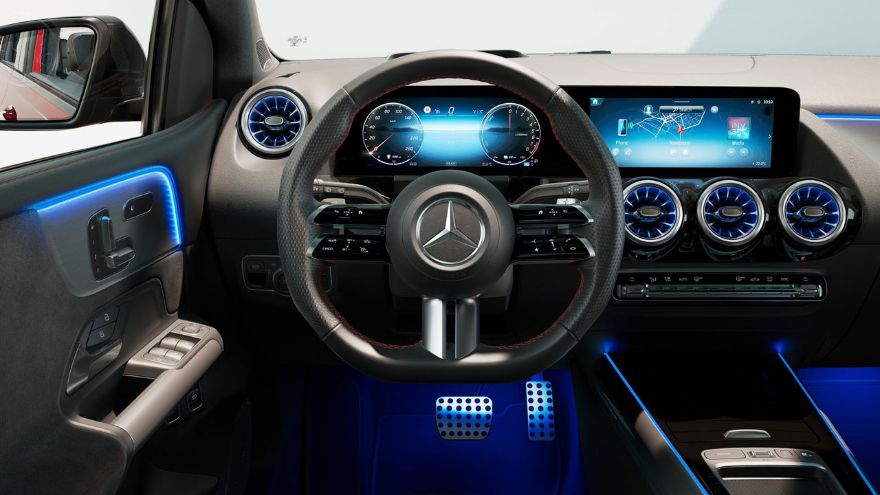 Στο εσωτερικό της Mercedes B-Class οι αλλαγές είναι πιο… ξεκάθαρες σε σχέση με αυτές του αμαξώματος. Τα υλικά έχουν βελτιωθεί, το τιμόνι είναι ανασχεδιασμένο και έχει επίπεδο κάτω μέρος και επιφάνεια αφής (που αντικαθιστά τα χειριστήρια), ενώ οι δύο οθόνες στο ταμπλό είναι 10,25 ιντσών με τη μία να αναλαμβάνει το έργο του πίνακα οργάνων και την άλλη να υπηρετεί το σύστημα πολυμέσων της Mercedes, ΜΒUX (Mercedes-Benz User Experience). Φυσικά και στην Β Class υπάρχει το σύστημα φωνητικών εντολών. Χωροταξικά, η B Class παίζει στην έδρα της… Αυξημένο το ύψος της καμπίνας, παρέχει εξαιρετικό χώρο για το κεφάλι των επιβατών, ενώ το πίσω κάθισμά χωρά με άνεση δύο ενήλικες αλλά και τρίτο μεσαίο αναστήματος στη μέση. Τα εμπρός καθίσματα είναι αναπαυτικά, η θέση οδήγησης άνετη και με πλήθος ρυθμίσεων, ενώ οι χώροι για μικροαντικείμενα είναι πολλοί και μεγάλοι. Ο χώρος αποσκευών παραμένει στα 445 λτ. όντας, έχει πλήρως εκμεταλλεύσιμο σχήμα και ηλεκτρικό άνοιγμα/κλείσιμο πόρτας.
