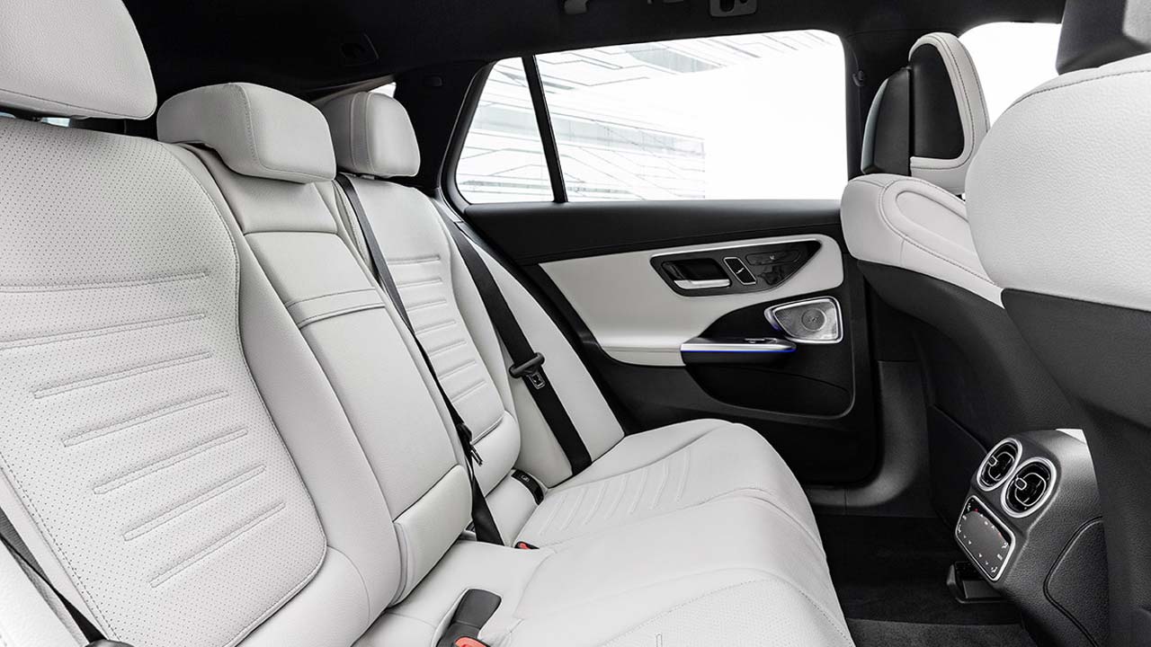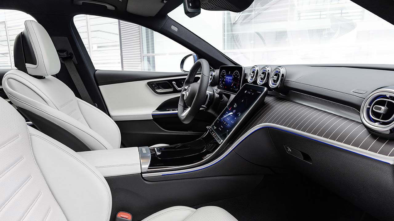 H ποιότητα στη διαμόρφωση του εσωτερικού χώρου αποτυπώνεται μέχρι την τελευταία λεπτομέρεια. Το ταμπλό οργάνων είναι χωρισμένο σε δύο τμήματα. Tο επάνω τμήμα διαθέτει νέους αεραγωγούς, ενώ το κάτω τμήμα συνίσταται σε μια ενιαία επιφάνεια με πολυτελή διακοσμητικά στοιχεία, η οποία εκτείνεται ομοιόμορφα από την κεντρική κονσόλα μέχρι το ταμπλό οργάνων χωρίς καμία παρεμβολή. Tο ταμπλό οργάνων και η κεντρική οθόνη έχουν μία ελαφριά κλίση έξι μοιρών προς τον οδηγό. H οθόνη του οδηγού διαφοροποιείται ξεκάθαρα από τα παραδοσιακά κόκπιτ με τα κλασικά, στρογγυλά όργανα. Οι πελάτες μπορούν να επιλέξουν ανάμεσα σε μια έκδοση 10,25 ιντσών ή 12,3 ιντσών. Η μετάβαση προς την ψηφιοποίηση αντανακλάται και στην κεντρική οθόνη αφής, η οποία επιτρέπει τον έλεγχο των λειτουργιών του αυτοκινήτου. Έχει διαγώνιο 9,5 ιντσών (24,1 cm) στον βασικό εξοπλισμό, ενώ προαιρετικά διατίθεται μια μεγαλύτερη έκδοση 11,9 ιντσών ή 30,2 cm. Η εμφάνιση των οθονών μπορεί να εξατομικευθεί επιλέγοντας ανάμεσα σε τρία στιλ ενδείξεων (Discreet, Sporty, Classic / Διακριτικό, Σπορ, Κλασικό) και τρεις τρόπους λειτουργίας (Navigation, Assistance, Service / Πλοήγηση, Υποβοήθηση, Service). Σε συνδυασμό με οποιαδήποτε εξοπλιστική έκδοση, ο βασικός εξοπλισμός της νέας C-Class περιλαμβάνει ατμοσφαιρικό φωτισμό με οπτικές ίνες. Όπως η νέα S-Class, έτσι και η νέα C-Class είναι εξοπλισμένη με τη δεύτερη γενιά του MBUX (Mercedes-Benz User Experience). Το εσωτερικό του αυτοκινήτου έχει γίνει ακόμη πιο ψηφιακό και ευφυές, καθώς τόσο το hardware όσο και το λογισμικό έχουν κάνει άλματα προόδου. Η φωνητική υποβοήθηση «Hey Mercedes» γίνεται πιο διαδραστική και μπορεί να μαθαίνει ενεργοποιώντας τις online υπηρεσίες στην εφαρμογή Mercedes me App. Προφανώς και όλη αυτή η τεχνολογία χρειάζεται εξοικείωση. Προσωπικά το μόνο ψεγάδι που βρήκα είναι πως για τον κλιματισμό (τον οποίο χειρίζεσαι μέσω της οθόνης) δεν υπάρχει κουμπί απενεργοποίησης. Έτσι πρέπει να πατήσεις το κουμπί έντασης του ανεμιστήρα μέχρι να τερματίσει την λειτουργία του. Επίσης δεν θα ήταν κακό αν υπήρχε έστω ένα φυσικό κουμπί για την ένταση του ήχου, καθώς τα πάνελ αφής δεν μου έδωσαν την ακρίβεια που επιθυμούσα. Οι χώροι είναι σε πολύ καλό επίπεδο για επιβάτες και μικροαντικείμενα στο εσωτερικό. Ο χώρος αποσκευών από την άλλη είναι στα 455 λίτρα και έχει μείνει αμετάβλητος σε σχέση με αυτόν του μοντέλου που αντικαθιστά.