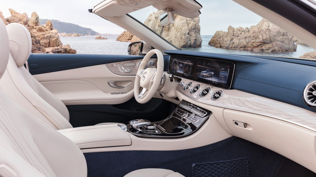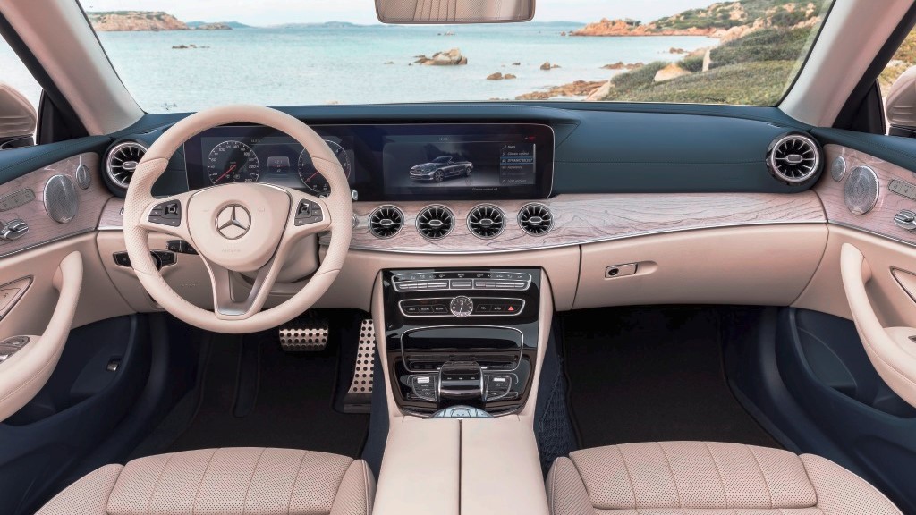 Οι μυώδεις επιφάνειες σε συνδυασμό με την μοναδική σχεδιαστική ταυτότητα του μοντέλου χαρίζουν ένα επιβλητικό αποτέλεσμα που δεν περνά απαρατήρητο. Είτε με την οροφή κλειστή είτε ανοικτή, η E–Class Cabrio τραβάει τα βλέμματα όπου και αν βρεθεί. Οι επιρροές από την E–Class Coupe είναι παραπάνω από εμφανής ενώ ο σχεδιασμός της υφασμάτινης κουκούλας, με διαφορετικές χρωματικές επιλογές δίνει μια ακόμα ξεχωριστή νότα πολυτέλειας. Μπαίνοντας κανείς στο σαλόνι της εντυπωσιάζεται από την πολυτέλεια και το φινίρισμα σε κάθε λεπτομέρεια. Δερμάτινες επιφάνειες, μοντέρνος σχεδιασμός και δυο μεγάλες οθόνες συνθέτουν το εσωτερικό του αυτοκινήτου. Μάλιστα το αποτέλεσμα τις βραδινές ώρες είναι ακόμα πιο εντυπωσιακό, με τον κρυφό φωτισμό να προσθέτει μια ακόμα νότα πολυτέλειας. Ο χειρισμός του Infotainment πραγματοποιείται είτε απευθείας από την οθόνη, είτε από το touchpad που βρίσκεται δεξιά από τον οδηγό, είτε από τα πλήκτρα στη δεξιά μεριά του τιμονιού. Παρά τις πολλές λειτουργίες του διαθέτει εύχρηστο μενού και έτσι η εξοικείωση μαζί του αποδεικνύεται αρκετά εύκολη.