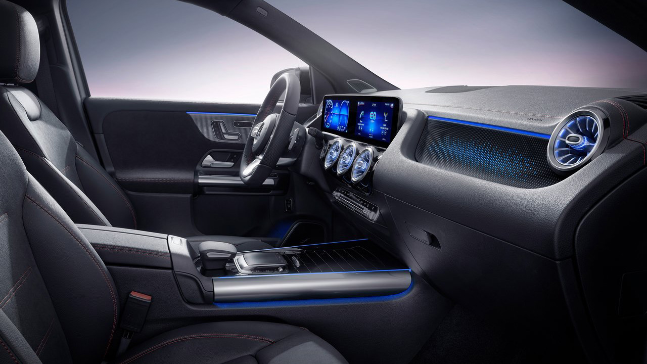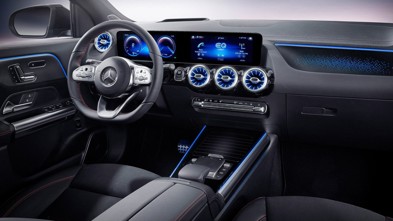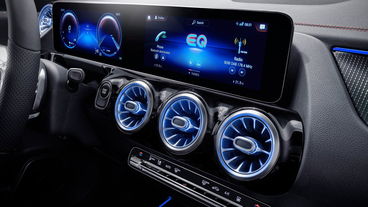 Όπως συμβαίνει σε κάθε μοντέλο της Mercedes-Benz, κατά την είσοδο στην καμπίνα είναι αισθητή η απαράμιλλη πολυτέλεια. Τα υλικά σε κάθε επιφάνεια είναι κορυφαία από άποψη ποιότητας, ενώ η συναρμολόγηση “υπογράφει” την εξάλειψη κραδασμών στο μέλλον. Σήμα κατατεθέν είναι οι πέντε φωτιζόμενοι αεραγωγοί του συστήματος κλιματισμού, οι οποίοι εντυπωσιάζουν ειδικά στο σκοτάδι. Βέβαια, ο μεγάλος “πρωταγωνιστής” δεν είναι άλλος από το σύστημα ενημέρωσης και ψυχαγωγίας MBUX, το οποίο στην περίπτωση του αυτοκινήτου δοκιμής συνδυάζει δύο οθόνες μεγέθους 10,25 ιντσών. Αυτή που βρίσκεται πίσω από το τιμόνι αναλαμβάνει τον ρόλο του πίνακα οργάνων, ενώ από την δεξιά (οθόνη αφής) γίνονται οι ρυθμίσεις του κάθε συστήματος, από τον κλιματισμό και την πλοήγηση, μέχρι τον έλεγχο του ηλεκτρικού συστήματος (αυτονομία, ροή ενέργειας κ.α.) Σημαντικό είναι το γεγονός πως στον βασικό εξοπλισμό της Mercedes EQA, περιλαμβάνεται το σύστημα infotainment MBUX (Mercedes-Benz User Experience) που προσφέρει διαισθητικό χειρισμό και ενεργοποιείται μέσω φωνητικών εντολών, με τη φράση «Hey Mercedes». Το MBUX μπορεί να διαμορφώνεται εξατομικευμένα χάρη σε μια ευρεία γκάμα επιλογών, ενώ ο έλεγχος του συστήματος πολυμέσων μπορεί να γίνει και από το σχετικό touchpad (πάνελ αφής) στην κεντρική κονσόλα.