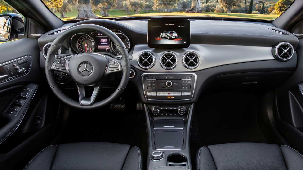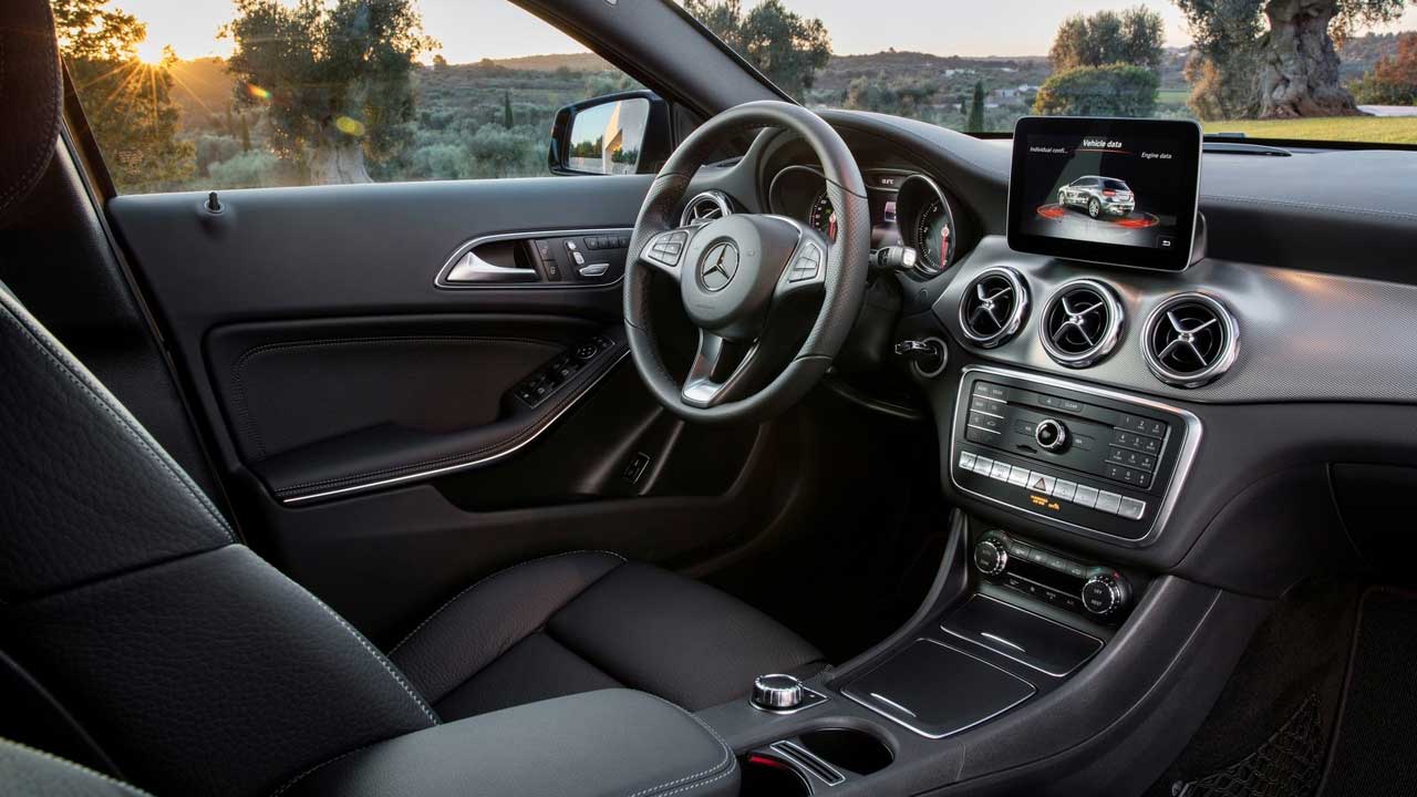 Περνώντας στο εσωτερικό της Mercedes GLA, η ρετρό πινελιές και η ποιότητα συνυπάρχουν αρμονικά με την τεχνολογία. Οι κυκλικοί αεραγωγοί είναι ξεκάθαρη αναφορά στο παρελθόν της μάρκας, ενώ τα υλικά που έχουν χρησιμοποιηθεί είναι από το πάνω ράφι… Το τριάκτινο δερμάτινο τιμόνι συνοδεύεται από χειριστήρια και είναι απόλαυση να το έχεις ανάμεσα στα χέρια σου, ενώ ο πίνακας οργάνων με τα αναλογικά κυκλικά όργανα και την ψηφιακή οθόνη για τον υπολογιστή ταξιδιού είναι ευανάγνωστος. Στο κέντρο του ταμπλό υπάρχει η έγχρωμη οθόνη 8 ιντσών για το σύστημα πολυμέσων, ο χειρισμός του οποίου γίνεται από τον ειδικό, περιστροφικό διακόπτη στην κονσόλα ανάμεσα στα εμπρός καθίσματα. Τα χειριστήρια ρύθμισης των ηλεκτρικών καθισμάτων βρίσκονται στις πόρτες και είναι από χρώμιο, ενώ ο υποψήφιος αγοραστής έχει στην διάθεσή του μία σειρά από επιλογές για να εξατομικεύσει τον διάκοσμο της καμπίνας. Οι χώροι είναι άνετοι για τέσσερις επιβάτες, με τον πέμπτο στο κέντρο του πίσω καθίσματος να πρέπει να κάνει κάποιες παραχωρήσεις. Οι χώροι για μικροαντικείμενα είναι αρκετοί και ευρύχωροι (ειδικά στην αυτόματη έκδοση που είχαμε στην διάθεσή μας, καθώς η απουσία επιλογέα δημιουργεί χώρο για επιπλέον θήκες), ενώ το πορτμπαγκάζ είναι στα 421 λίτρα και με την αναδίπλωση των καθισμάτων φτάνει στα 1.235 λίτρα. Όσον αφορά την τεχνολογία της Mercedes GLA 200, είναι προικισμένη με όλα τα σύγχρονα τεχνολογικά καλούδια άνεσης, ασφάλειας και υποβοήθησης του οδηγού. Διαθέτει Pre-Safe, Active Brake Assist, Distronic, σύστημα υποβοήθησης διατήρησης λωρίδας, σύστημα υποβοήθησης νεκρής γωνίας ορατότητας και πολλά ακόμη.