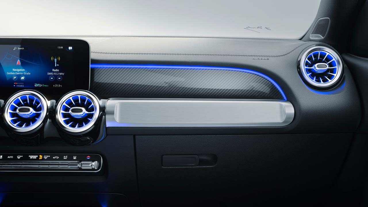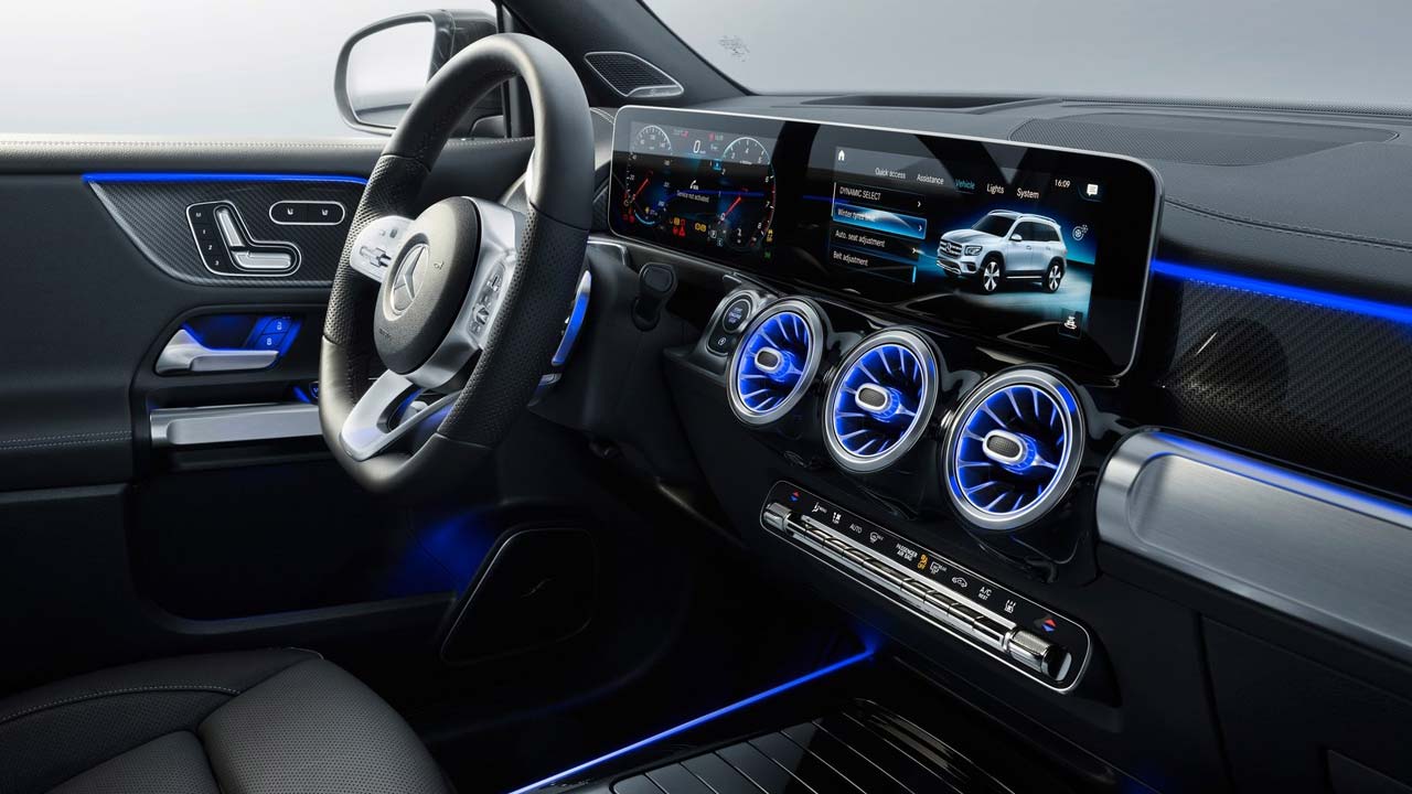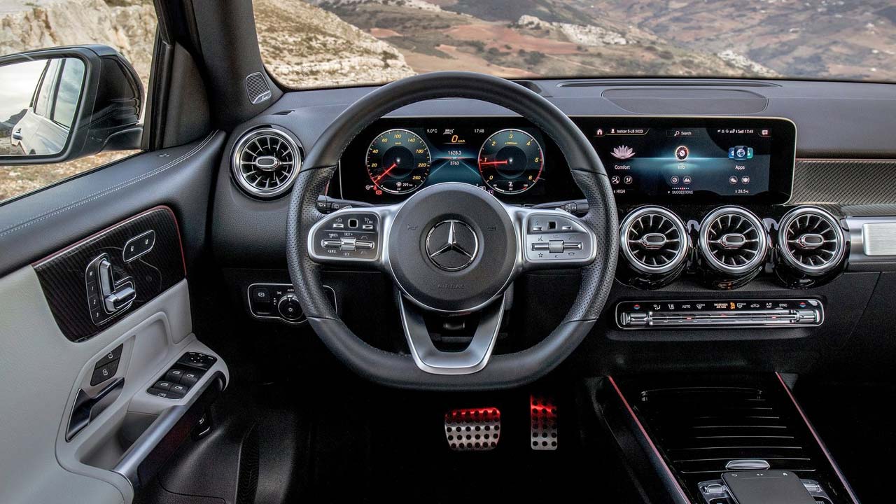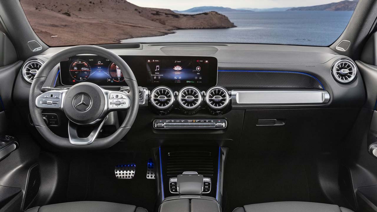 Αν η λέξη “πλουραλισμός” χαρακτηρίζει την γκάμα της Mercedes, τότε η λέξη “πληθωρικό” είναι αυτή που ταιριάζει στην περίπτωση της καμπίνας της GLB. Και αυτό γιατί τα έχει όλα και είναι για όλους. Με 2.829 χλστ. το μεταξόνιο της GLB είναι το μακρύτερο της τρέχουσας γενιάς οχημάτων στην compact κατηγορία της Mercedes-Benz. Ο σχεδιασμός τόσο της καμπίνας όσο και των παραθύρων της συμβάλλουν σημαντικά στην αίσθηση της ευρυχωρίας που προσφέρει. Ο χώρος για το κεφάλι στην πρώτη σειρά καθισμάτων είναι 1.069 χιλιοστά – ιδανικό ύψος για αυτήν την κατηγορία. Με 967 χιλιοστά, υπάρχει άπλετος χώρος για τα πόδια στα πίσω καθίσματα της πενταθέσιας έκδοσης. Το ταμπλό οργάνων είναι ενιαίο, με οπτικές εσοχές στον χώρο του οδηγού και του συνοδηγού. Ο οδηγός έχει μπροστά του ένα κόκπιτ με ευρεία οθόνη και σύστημα χειρισμού και ενδείξεων μέσω MBUX (Mercedes-Benz User Experience). Στον στάνταρ εξοπλισμό ανήκουν δύο οθόνες 7 ιντσών για το ταμπλώ οργάνων και το σύστημα χειρισμού και πολυμέσων (προαιρετικά, δύο οθόνες 10,25 ιντσών) και σπορ τιμόνι με πλήκτρα αφής «Touch Control» αριστερά και δεξιά. Τα υλικά που έχουν χρησιμοποιηθεί είναι κορυφαίας ποιότητας και η συναρμογή αψεγάδιαστη. Όσον αφορά τις 7θέσιες εκδόσεις, στα χαρακτηριστικά άνεσης της τρίτης σειράς καθισμάτων περιλαμβάνονται δύο ποτηροθήκες ανάμεσα στα καθίσματα, καθώς και δύο αποθηκευτικές θήκες με αντιολισθητική επένδυση αριστερά και δεξιά στην επένδυση του χώρου φόρτωσης, καθεμία με θύρα USB. Τα καθίσματα μπορούν να αναδιπλωθούν και να έρθουν στο ίδιο επίπεδο με το δάπεδο του χώρου φόρτωσης, ώστε να μεγαλώσει το πορτμπαγκάζ το οποίο κυμαίνεται από 570 έως και 1.805 λίτρα. Αξίζει εδώ να σημειώσουμε πως τα καθίσματα της δεύτερης σειράς είναι συρόμενα και έχουν ρυθμιζόμενη κλίση πλάτης.