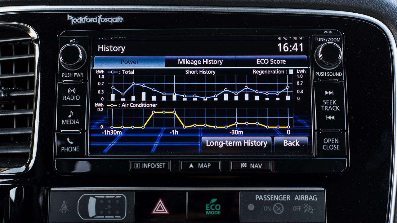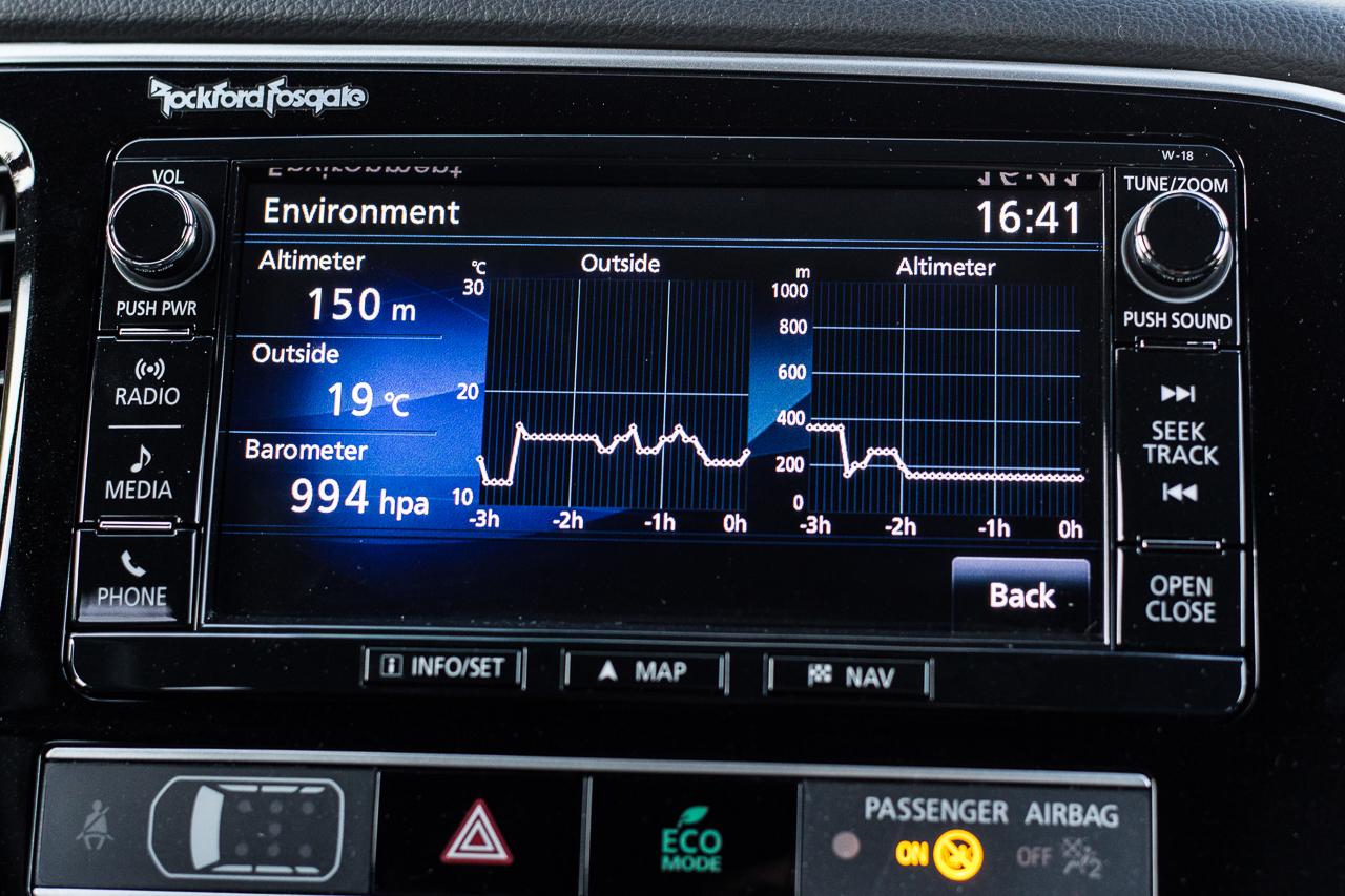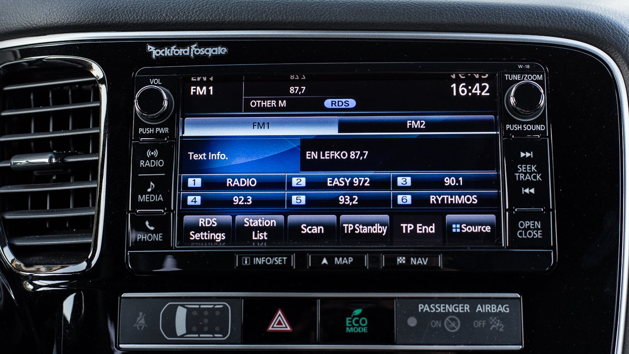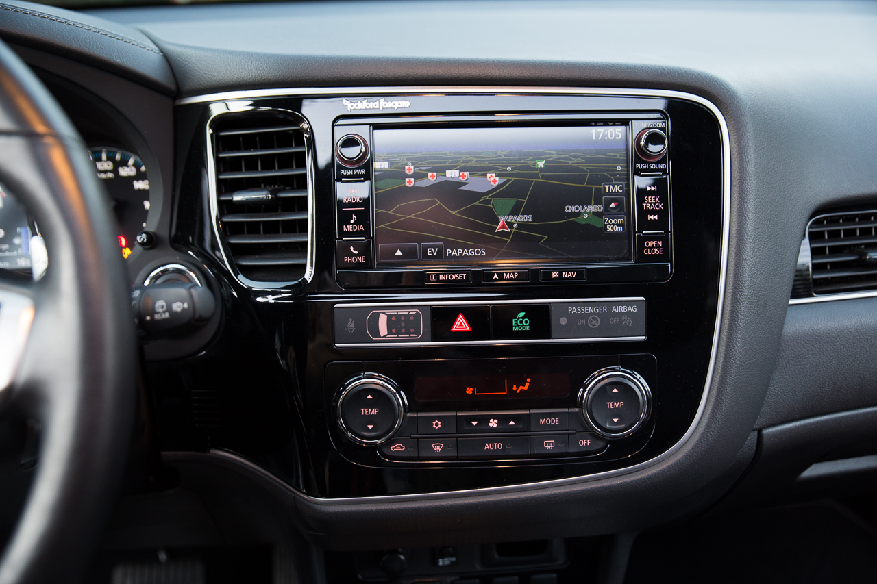 Ως οδηγός κάθεσαι ψηλά στο Outlander και έχεις εξαιρετική εποπτεία του δρόμου με τα νέα καθίσματα να συμβάλλουν στην άνεση. Στην διάθεσή σου έχεις δεκάδες κουμπιά και χειριστήρια, τόσο φυσικά όσο και εικονικά. Αν και στην αρχή νιώθεις ένα σχετικό άγχος, γρήγορα καταλαβαίνεις τον τρόπο που τα έχουν “ομαδοποιήσει” οι Ιάπωνες. Οι λειτουργίες στις οποίες χρειάζεσαι άμεση πρόσβαση είναι επίσης άμεσα προσβάσιμες, εκτός από το το κουμπί που ελέγχει τις μικρές ψηφιακές ενδείξεις στον πίνακα πληροφοριών που δεν βρίσκεται στο τιμόνι αλλά αριστερά από αυτό, στο ταμπλό. Το πλήρως ενσωματωμένο σύστημα πολυμέσων της Rockford Fosgate έρχεται να ολοκληρώσει την εικόνα, να προσφέρει συνδεσιμότητα με κινητά Android και iOS και να σε κάνει να… κολλήσεις για ώρες με τις πληροφορίες που προσφέρει ειδικά με τα δεδομένα την κίνησης για το υβριδικό σύστημα. Μέχρι και υψόμετρο έχει ενσωματωμένο!