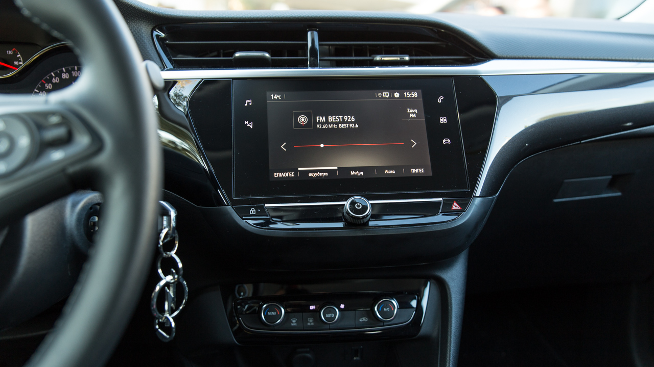 Η μοντέρνα εικόνα συνεχίζεται και στο εσωτερικό του νέου μικρού της Opel. Η εικόνα που παρουσιάζει το ταμπλό είναι σύγχρονη και ελκυστική με τα πολλά φυσικά κουμπιά να απουσιάζουν και την οθόνη αφής του συστήματος πολυμέσων να είναι ελαφρώς στραμμένη προς τον οδηγό. Τα χειριστήρια βρίσκονται στις σωστές θέσεις, η απόκριση της οθόνης είναι γρήγορη ενώ τα μενού παρουσιάζονται με απόλυτα κατανοητό τρόπο. Για να κατατοπιστείτε με τον έλεγχο του Corsa δεν χρειάζονται παρά ελάχιστα λεπτά της ώρας και αυτό δείχνει την πολύ καλή δουλειά που έχουν κάνει οι άνθρωποι της εταιρίας και στις λεπτομέρειες. Συνεχίζοντας με τα καλά περνάμε στη θέση οδήγησης που έρχεται εύκολα στα μέτρα του εκάστοτε οδηγού με το κάθισμα να προσφέρει καλή πλευρική στήριξη και να τα καταφέρνει καλά και με τη στήριξη της μέσης. Το μεγάλο τιμόνι βρίσκεται επίσης σε καλό σημείο με τη θέση οδήγησης να παρουσιάζεται συνολικά ως αξιόλογος σύμμαχος στην καθημερινότητα αλλά και στο ταξίδι. Στον τομέα των διαθέσιμων χώρων το Corsa τα καταφέρνει καλά για τα μέτρα της κατηγορίας, χωρίς ωστόσο να διεκδικεί και την κορυφή. Για την άνεση των εμπρός δεν τίθεται ερώτημα, ενώ και πίσω δύο επιβάτες μέσου αναστήματος θα κάτσουν άνετα, με τους άνω των 1,85 μ. να βρίσκουν το χώρο για τα γόνατα και τα κεφάλια τους οριακό. Σε καλά επίπεδα βρίσκεται και ο χώρος των αποσκευών με το απόλυτα εκμεταλλεύσιμο σχήμα του με την χωρητικότητα να ανέρχεται στα 309 λίτρα με τα καθίσματα στην όρθια θέση τους.