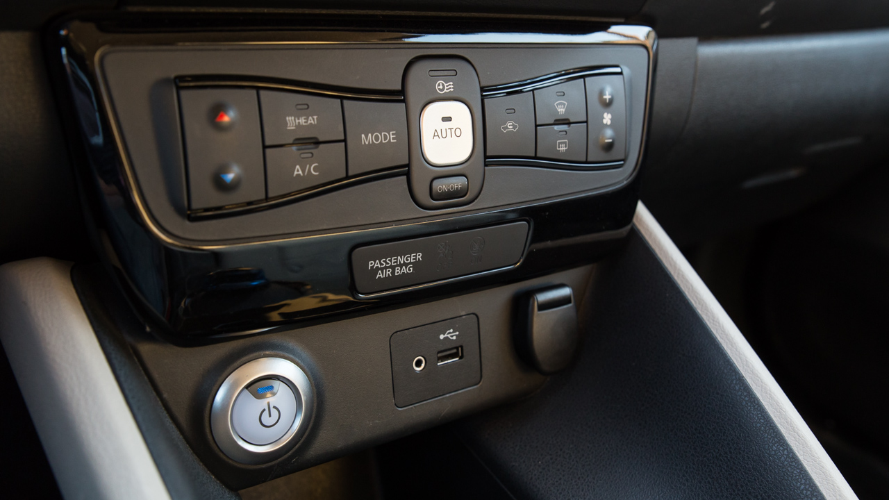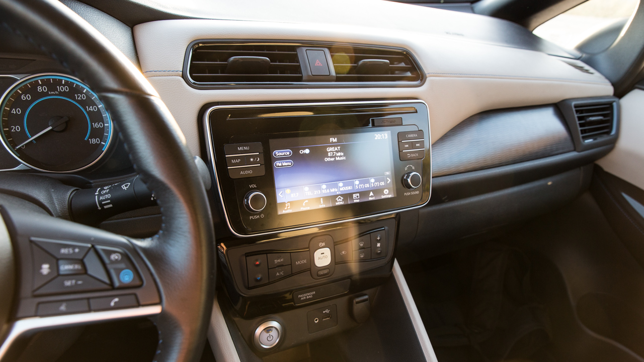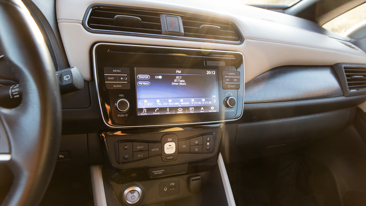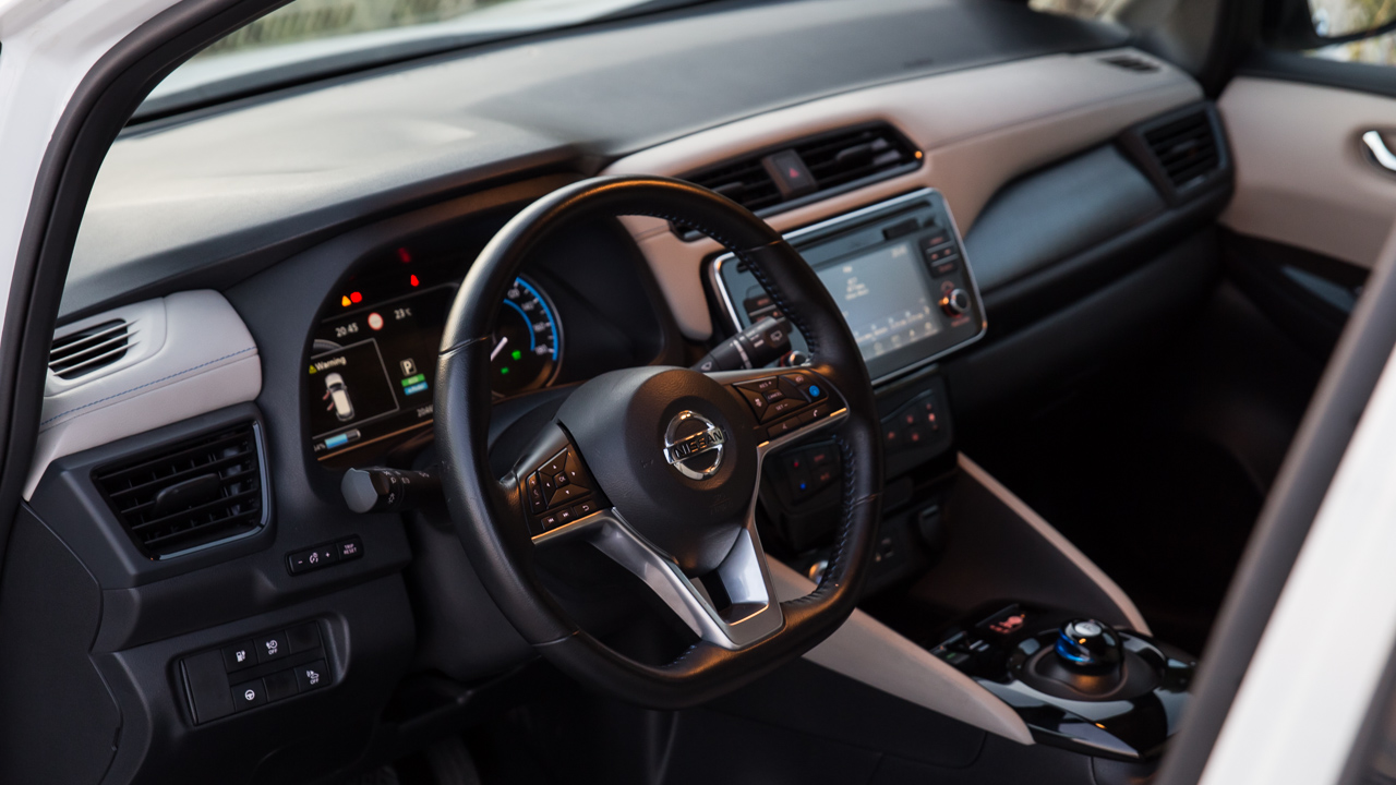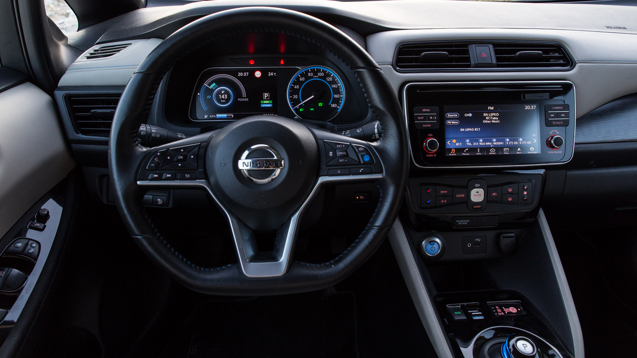 Αντίστοιχη είναι και η εικόνα στο εσωτερικό του μικρομεσαίου ηλεκτρικού της Nissan με την εκτέλεση της καμπίνας να έχει γίνει σε σύγχρονο και σοβαρό ύφος. Ο παραδοσιακός επιλογέας σχέσεων που απουσιάζει και έχει δώσει τη θέση του σε ένα χαμηλό “joystick” αλλά και οι διάφορες ενδείξεις στις δύο μεγάλες οθόνες -μια για τον οδηγό και μια κεντρική αφής- που σε πληροφορούν ποικιλοτρόπως για την μπαταρία και τα επίπεδα φόρτισης της, είναι τα στοιχεία που σου δίνουν να καταλάβεις ότι εδώ έχεις να κάνεις με ηλεκτρικό αυτοκίνητο.