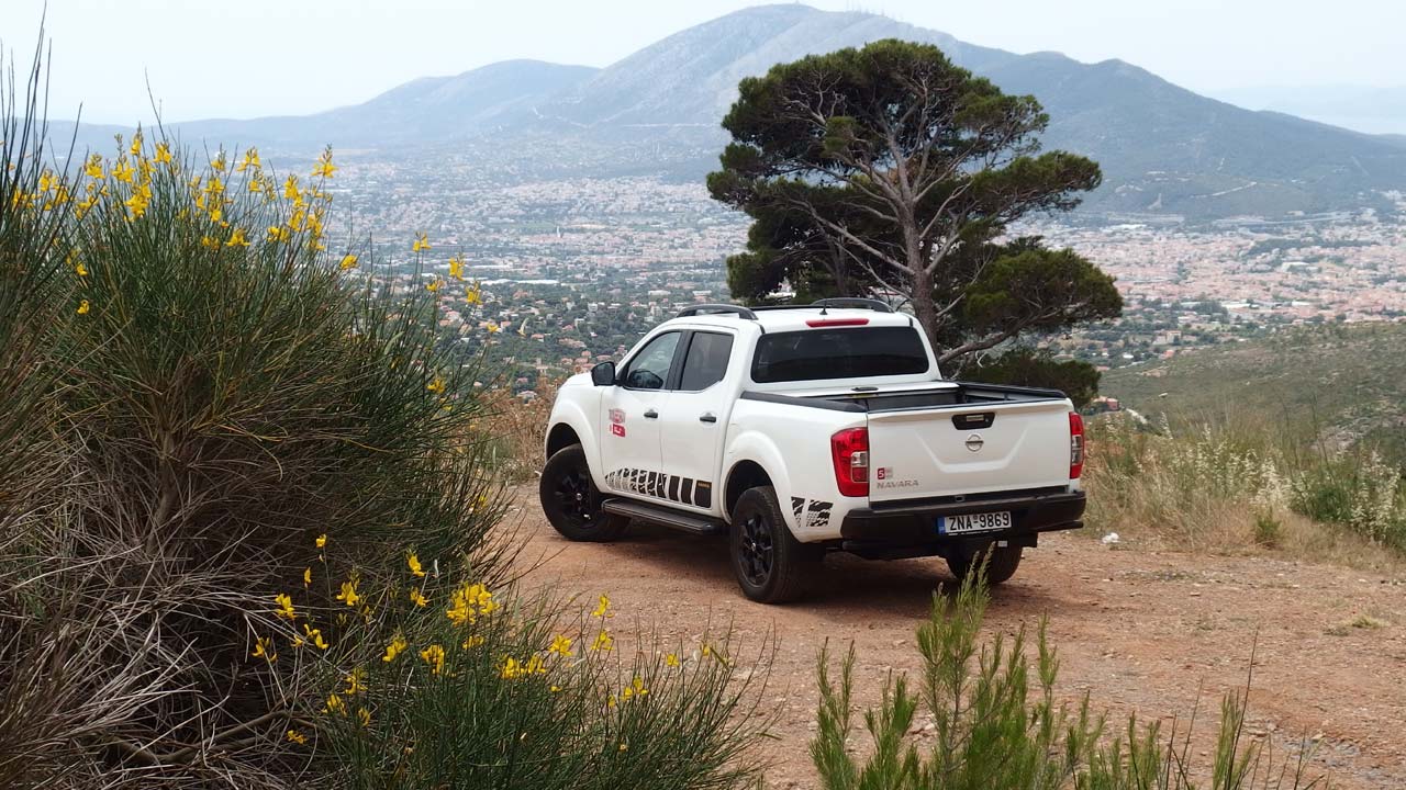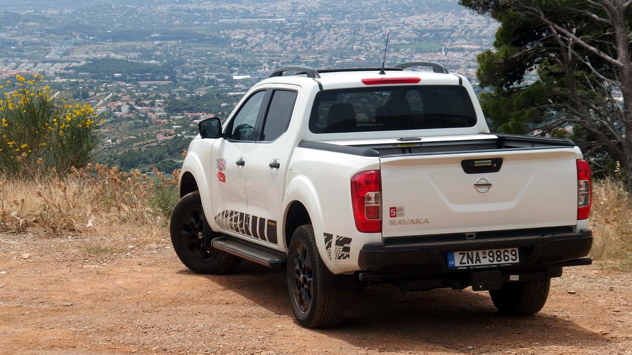 Το νέο Nissan Navara N-Guard διαθέτει εντυπωσιακές ικανότητες, καθώς μπορεί να ρυμουλκήσει έως 3.500 κιλά (στάνταρ ο κοτσαδόρος) και να μεταφέρει πάνω από 1.100 κιλά φορτίου, ακόμα και σε δύσβατα εδάφη. Ο 2.3 λτ. twin turbo, τετρακύλινδρος πετρελαιοκινητήρας συνεργάζεται άψογα με το 7άρι αυτόματο κιβώτιο ταχυτήτων. Οι 190 ίπποι αποδίδονται στις 3.750 σ.α.λ. και τα 452 Nm ροπής από τις 1.500 έως και τις 2.500 σ.α.λ. Για το 0-100 χλμ./ώρα το Navara N-Guard χρειάζεται 11,2 δλ. και η τελική του ταχύτητα είναι στα 180 χλμ./ώρα. Το αυτόματο κιβώτιο μας εξέπληξε ευχάριστα, καθώς απέδειξε την ποιότητα λειτουργίας του και τις σωστές επιλογές των σχέσεων τόσο σε αργά δύσβατα σημεία, όσο και στον αυτοκινητόδρομο. Το ίδιο οφείλουμε να πούμε και για την ανάρτηση του Navara. Παρά τη μεγάλη διαδρομή της και την έμφαση στην άνεση, συμπεριφέρεται πολύ καλά τόσο στην άσφαλτο όσο και στο χώμα. Οι πολλαπλοί σύνδεσμοι πίσω κάνουν δουλειά, ενώ οι αναπηδήσεις πίσω είναι υπαρκτές με άδεια την καρότσα, χωρίς όμως να ενοχλούν. Το τιμόνι κόβει αρκετά (διάμετρος κύκλου στροφής στα 13,1 μ.) και δεν περνά κραδασμούς ακόμη και σε κακοτράχαλα εδάφη. Όσον αφορά τις εκτός δρόμου ικανότητές του τα νούμερα είναι ενδεικτικά. Απόσταση από το έδαφος στα 223 χλστ. με γωνίες εισόδου, ράμπας, διαφυγής στις 30.4, 22.6, και 25.6 μοίρες αντίστοιχα, ενώ μπορεί να κινηθεί σε νερό βάθους 60 εκατοστών. Όσον αφορά την τετρακίνηση, αυτή είναι κατ’ επιλογήν, με ειδικό, πιεζοπεριστροφικό διακόπτη στο ταμπλό και προσφέρει πίσω κίνηση, τετρακίνηση, υποπολλαπλασιαμό (αργό) και κλείδωμα πίσω διαφορικού (στην έκδοση N-Guard κλειδώνει και το εμπρός διαφορικό). Τι καίει όμως το Nissan Navara N-Guard; Σύμφωνα με τα επίσημα νούμερα η μέση κατανάλωσή του είναι στα 7,4 λίτρα/100 χλμ. Στην πραγματικότητα, εμείς κινηθήκαμε με μέση κατανάλωση στα 8,8 λίτρα/100 χλμ.
