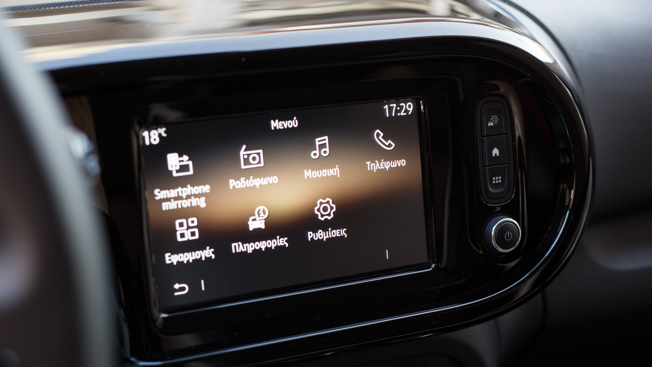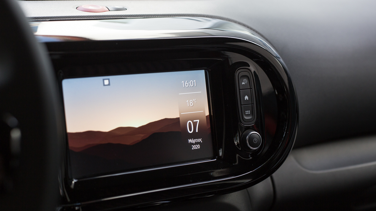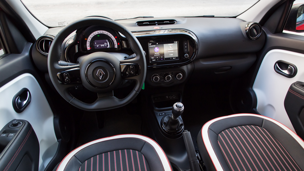 Η εκμετάλλευση των χώρων είναι αρκετά καλή στην καμπίνα του Twingo, δεδομένου του μήκους των μόλις 3.615 χλστ. -1.646 πλάτος και 1.541 χλστ. ύψος). Δύο επιβαίνοντες κανονικού μεγέθους δεν θα δυσκολευτούν να βολευτούν στο πίσω κάθισμα ακόμη και σε μεγαλύτερες αποστάσεις, ενώ η Renault έχει φροντίζει και για την προσφορά αρκετών χώρων για μικροαντικείμενα και για ποτήρια, τόσο στην κεντρική κονσόλα όσο και στις πόρτες. Οι πίσω μάλιστα φέρουν και λάστιχο συγκράτησης για μεγαλύτερα αντικείμενα. Στο ταμπλό ξεχωρίζει η νέα οθόνη αφής των επτά ιντσών με τα προσεγμένα γραφικά και τους καλούς χρόνους απόκρισης στις εντολές του οδηγού με το σύστημα πολυμέσων να είναι συμβατό με Android Auto και Apple CarPlay. Επιπλέον βελτίωση το “κλειστό” ντουλαπάκι μπροστά από το συνοδηγό ενώ η Renault τοποθέτησε μια επιπλέον θύρα USB αλλά και θύρα jack 3,5 χλστ.