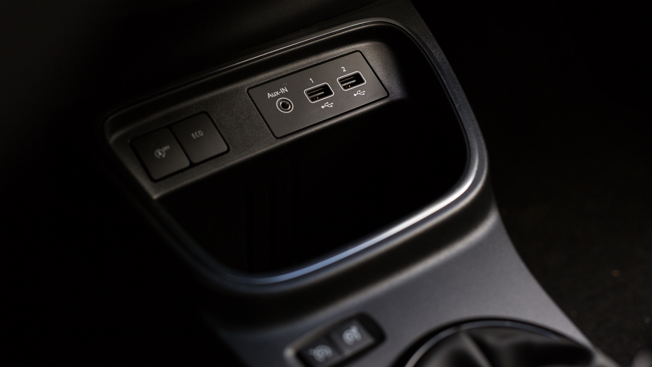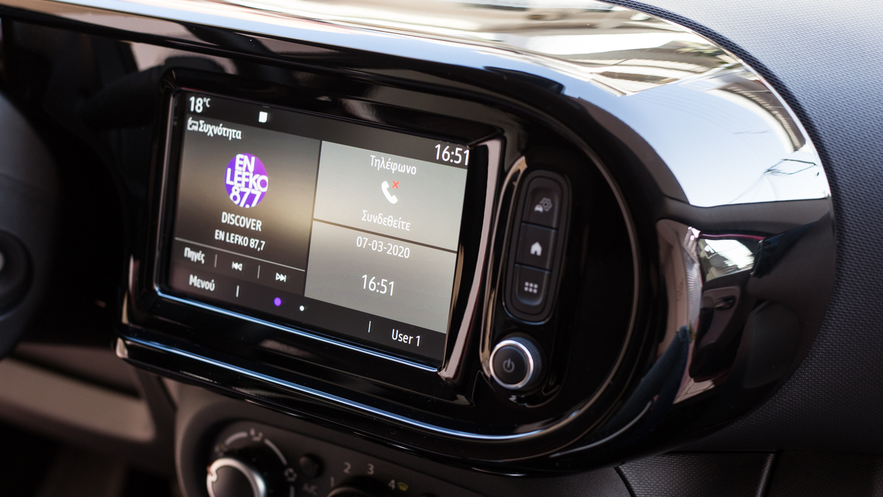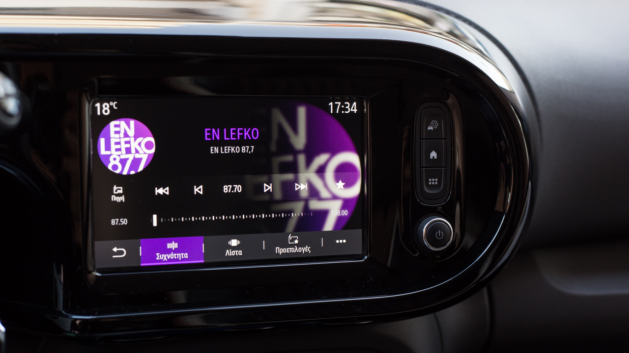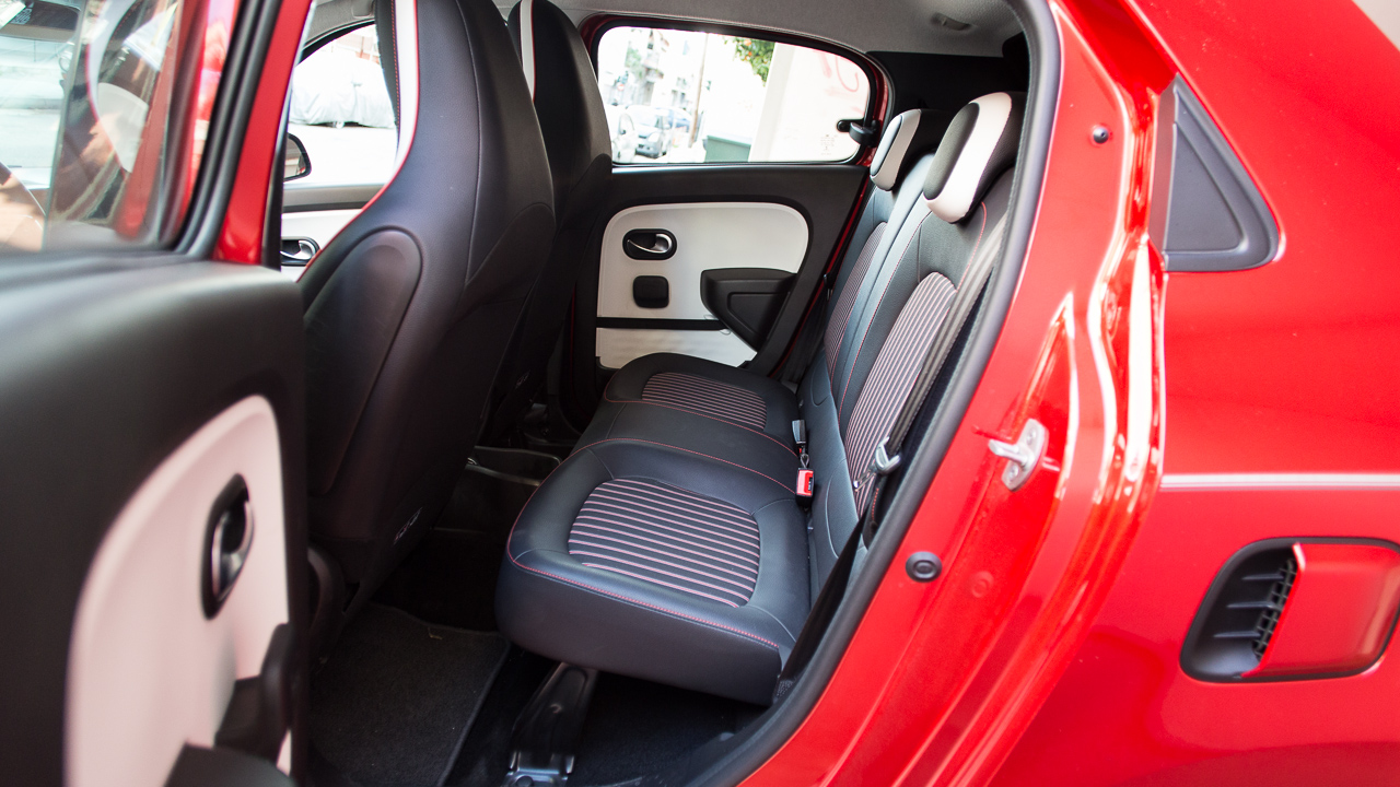 Η εκμετάλλευση των χώρων είναι αρκετά καλή στην καμπίνα του Twingo, δεδομένου του μήκους των μόλις 3.615 χλστ. -1.646 πλάτος και 1.541 χλστ. ύψος). Δύο επιβαίνοντες κανονικού μεγέθους δεν θα δυσκολευτούν να βολευτούν στο πίσω κάθισμα ακόμη και σε μεγαλύτερες αποστάσεις, ενώ η Renault έχει φροντίζει και για την προσφορά αρκετών χώρων για μικροαντικείμενα και για ποτήρια, τόσο στην κεντρική κονσόλα όσο και στις πόρτες. Οι πίσω μάλιστα φέρουν και λάστιχο συγκράτησης για μεγαλύτερα αντικείμενα. Στο ταμπλό ξεχωρίζει η νέα οθόνη αφής των επτά ιντσών με τα προσεγμένα γραφικά και τους καλούς χρόνους απόκρισης στις εντολές του οδηγού με το σύστημα πολυμέσων να είναι συμβατό με Android Auto και Apple CarPlay. Επιπλέον βελτίωση το “κλειστό” ντουλαπάκι μπροστά από το συνοδηγό ενώ η Renault τοποθέτησε μια επιπλέον θύρα USB αλλά και θύρα jack 3,5 χλστ.