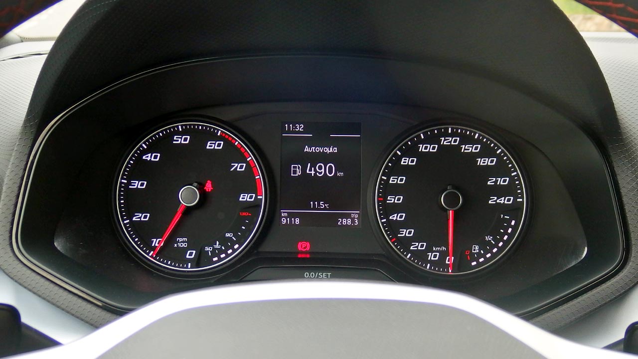 Περνάμε στην καμπίνα, η οποία διαφοροποιείται αισθητά συγκριτικά με το παρελθόν και θυμίζει σε μεγάλο βαθμό αυτή του Leon. Τα πλαστικά δείχνουν αρκετά ποιοτικά (μαλακά μόνο στο άνω τμήμα) και η συναρμογή τους είναι ιδιαίτερα προσεγμένη. Πρώτες αλλαγές που εντοπίζουμε είναι το νέο “sportive” τιμόνι, το οποίο έχει και το σήμα FR, αλλά και η κεντρική οθόνη αφής, 9,2 ίντσες (8,25 ίντσες βασικός εξοπλισμός). Πίσω από το τιμόνι, στην προκειμένη περίπτωση δεν υπάρχει οθόνη, αλλά ένας τυπικός πίνακας οργάνων που παρέχει όλες τις απαραίτητες ενδείξεις στον οδηγό και συνοδεύεται από ψηφιακή οθόνη για τον υπολογιστή ταξιδιού (υπάρχει και αναβάθμιση σε πλήρως ψηφιακό πίνακα οργάνων). Όσον αφορά στους χώρους, τόσο οι εμπρός όσο και οι πίσω επιβάτες θα βρουν ιδιαίτερα πρακτικές τις θήκες για μικροαντικείμενα (μεγάλες “τσέπες” στις εμπρός και πίσω πόρτες), ενώ στις πίσω θέσεις θα βολευτούν άνετα δύο ενήλικες επιβάτες. Το πορτμπαγκάζ είναι στα 355 λίτρα.