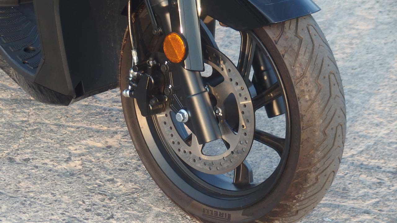 Περνώντας στα φρένα, αυτά ικανοποιούν σε αίσθηση αλλά και αποτελεσματικότητα, παρά το βάρος των 155 κιλών. Σε αυτό συνεισφέρουν και τα πολύ καλά ελαστικά σε εμπρός και πίσω τροχό (15 και 14 ιντσών αντίστοιχα). Κρίμα πάντως που απουσιάζει το ABS. Κατά τα άλλα η λειτουργία της ανάρτησης είναι καλή με ένα άτομο, ειδικά πίσω, που αρκετά συμβατικά scooters χωλαίνουν και συμπεριφέρονται απότομα. Εδώ είδα μια καλή συμπεριφορά με ικανοποιητική απόσβεση και γρήγορο rebound. Με δύο άτομα όμως, η ανάρτηση γίνεται αρκετά σφικτή. Για το κόστος χρήσης τώρα, αυτό είναι ελάχιστο, καθώς υπάρχει ένας περιοδικός έλεγχος, με αναλώσιμα τα ελαστικά τους δίσκους φρένων και τα τακάκια. Βέβαια αν χρησιμοποιείτε “έξυπνα” και μεθοδικά το σύστημα ανάκτησης ενέργειας μάλλον θα αργήσετε πολύ να αλλάξετε δίσκους και τακάκια.