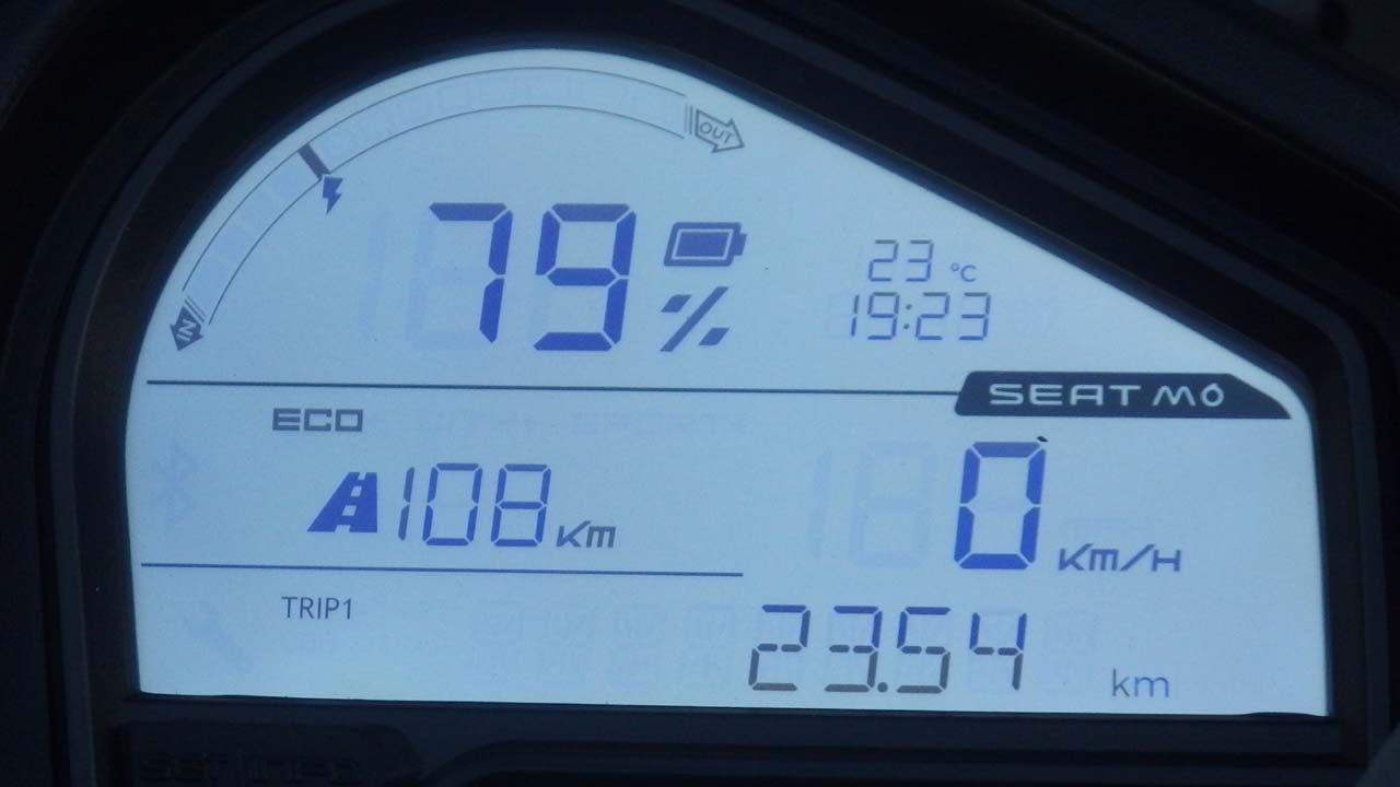 Εμπρός από τον πίσω τροχό και κάτω από την σέλα βρίσκεται η μπαταρία του Seat MO. Το σημαντικό όμως είναι πως η συγκεκριμένη μπαταρία είναι αποσπώμενη και έτσι μπορείς να την αφαιρέσεις από το scooter και να την μεταφέρεις μαζί σου σαν τσάντα ταξιδιού με ροδάκια, μέχρι το σημείο φόρτισης. Ωραία ιδέα αλλά η μπαταρία ιόντων λιθίου των 5,6 kWh ζυγίζει κάτι παραπάνω από 40 κιλά, επομένως αν υπάρχουν σκαλιά από το scooter μέχρι το σπίτι σας η το γραφείο ξεχάστε την μεταφορά της. Αν όμως μπείτε μέσα σε ένα ασανσέρ πχ. τότε εύκολα την ανεβάζετε στο διαμέρισμά σας και την φορτίζετε (έχει ένα σκέτο καλώδιο και όχι τροφοδοτικό). Να σημειώσω εδώ πως μία φόρτιση διαρκεί κάτι παραπάνω από 5 ώρες σε πρίζα σούκο (που είναι και η μοναδική επιλογή). Φυσικά φόρτιση μπορεί να γίνει και με την μπαταρία επάνω στο scooter, χωρίς να αλλάζει κάτι στον χρόνο φόρτισης βέβαια. Για το κόστος φόρτισης υπολογίστε περί τα 0,6 έως και 0,9 ευρώ/100 χλμ. (αναλόγως τιμής κιλοβατώρας και τρόπου οδήγησης φυσικά).