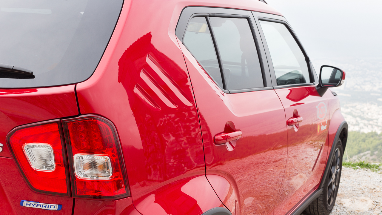 Εξωτερικά η χαριτωμένη εμφάνιση του Ignis κερδίζει τις εντυπώσεις ειδικά στο έντονο κόκκινο χρώμα του μοντέλου της δοκιμής που τονίζει ακόμη περισσότερο τα ρετρό στοιχεία που έχει ενσωματώσει η Suzuki στη σχεδίασή του. Η ιαπωνική εταιρία “δανείστηκε” στοιχεία από την παράδοσή της και έδωσε έτσι στο μοντέλο της έναν ακόμη πιο ιδιαίτερο χαρακτήρα. Οι τρεις χαρακτηριστικές γραμμές στην πίσω κολόνα (κάνουν την εμφάνιση τους και στην κεντρική κονσόλα) αλλά και ο τρόπος που πλαισιώνονται τα εμπρός φωτιστικά σώματα έχουν μια έντονη αύρα από τα Fronte Coupe και Cervo, τα μικρά σπορ αυτοκίνητα της Suzuki από την δεκαετία του ’70. Οι εμπρός κολώνες σε μαύρο χρώμα είναι ο οικογενειακός δεσμός του Ignis με το σύγχρονο Swift, ενώ στις άκρες του καπό βλέπουμε “αεραγωγούς” που θυμίζουν Vitara.