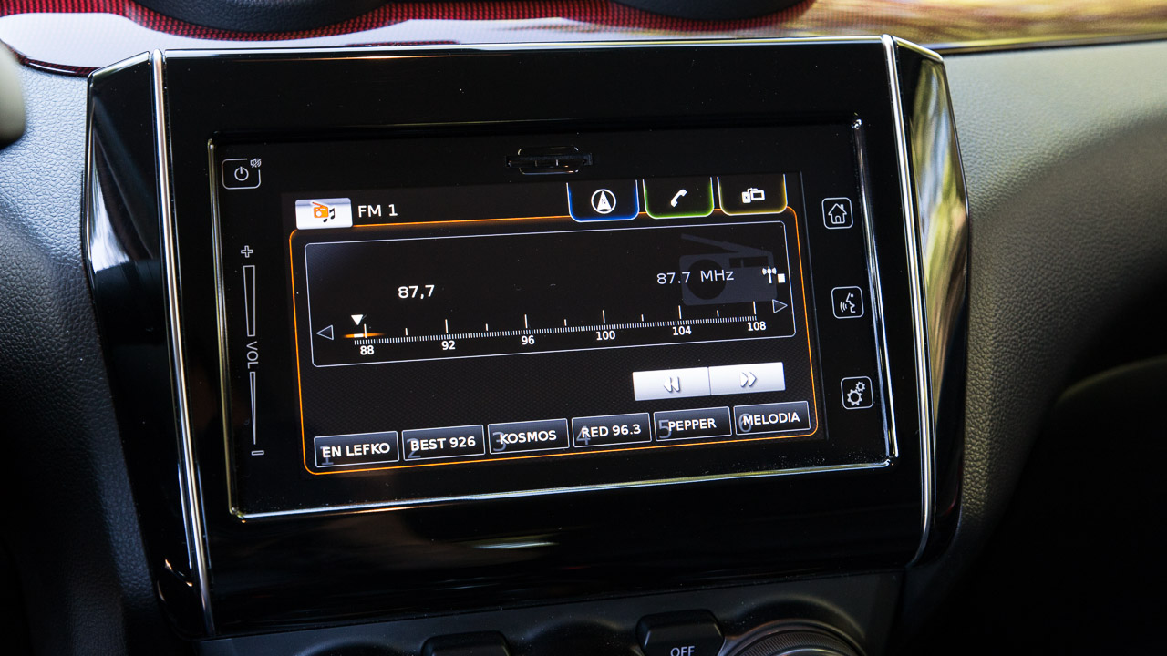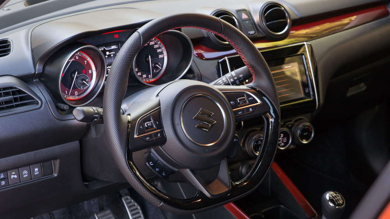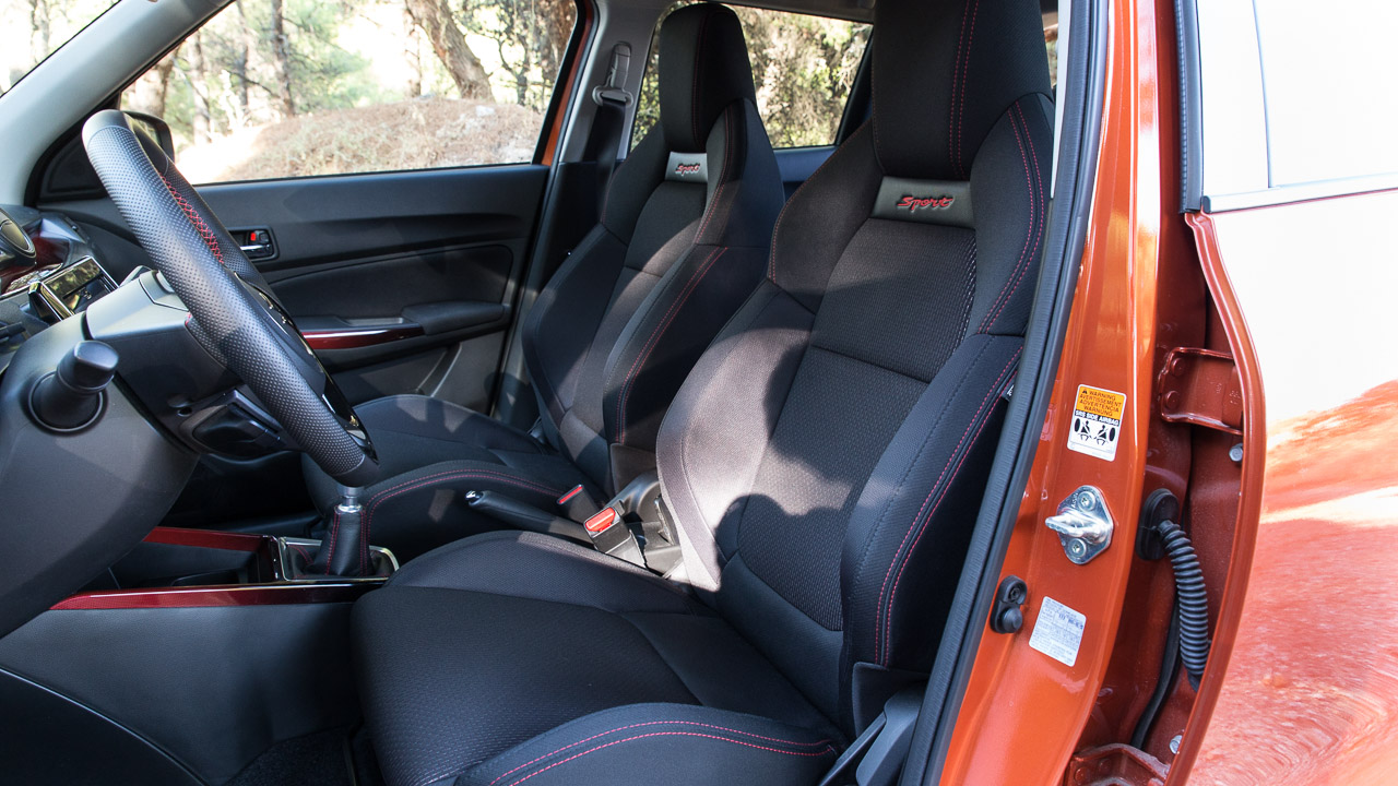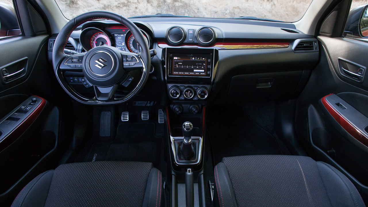Η σπορ εικόνα συνεχίζεται και στο εσωτερικό του Swift Sport Hybrid με τη Suzuki να έχει προχωρήσει σε όλες τις απαραίτητες “πινελιές” ώστε η εικόνα της καμπίνας να αντιστοιχεί στην εξωτερική και να δίνει στον οδηγό όντως την αίσθηση πως βρίσκεται σε ένα ξεχωριστό Swift. Με το άνοιγμα της πόρτας τα σπορ καθίσματα με τις κόκκινες ραφές είναι τα πρώτα που υποδέχονται την ματιά του παρατηρητή. Προσφέρουν καλή πλευρική στήριξη που αναλογεί στην εικόνα τους, αν και κάποιοι ίσως βρουν τη βάση λίγο πιο ρηχή από το ιδανικό. Ακολουθεί το τριάκτινο τιμόνι με τη δερμάτινη επένδυση με τις κόκκινες ραφές να δίνουν και εδώ το “παρών” όπως και στην επένδυση του επιλογέα αλλά και του χειρόφρενου. Τα διακοσμητικά χρωματιστά φιλέτα σε ταμπλό και πόρτες δίνουν λίγο περισσότερο χρώμα σε μια κατά τα άλλα σκουρόχρωμη καμπίνα που χαρακτηρίζεται από τα σκληρά πλαστικά που έχουν χρησιμοποιηθεί για την κατασκευή της αλλά και τα πολύ υψηλά επίπεδα συναρμογής και συναρμολόγησης.