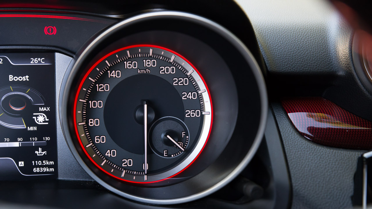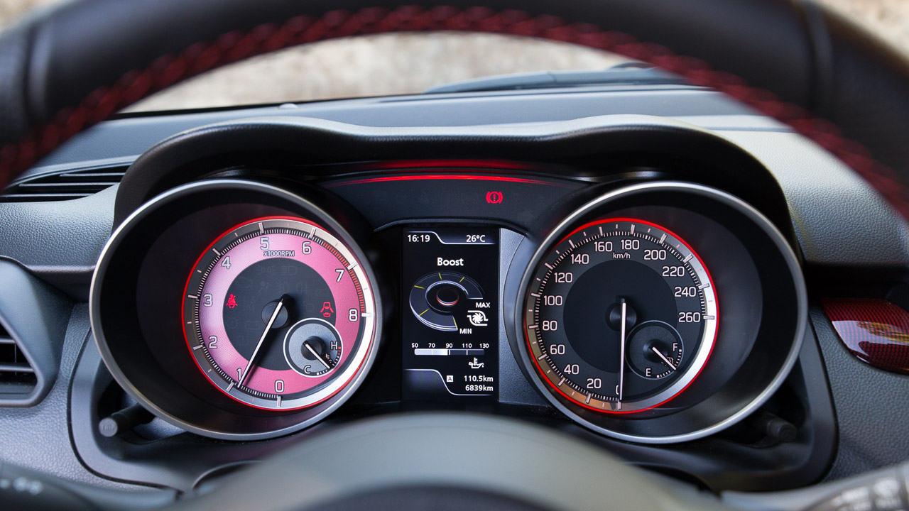 Στην πράξη η αίσθηση που δίνει το υπετροφοδοτούμενο σύνολο στις επιταχύνσεις είναι σαφώς καλύτερη από το χρόνο που δίνει η Suzuki, στον οποίο μεγάλο ρόλο παίζει και η “έξτρα” αλλαγή από 2η σχέση σε 3η πριν ο δείκτης του ταχύμετρου περάσει τα 100 χλμ./ώρα. Η καμπύλη απόδοσης είναι ικανοποιητική και πριν από τις 2.000 σ.α.λ. με τη λειτουργία του ηλεκτρικού-κινητήρα γεννήτριας να παίζει εδώ το ρόλο του, ενώ η μέση κατανάλωση κατά τη διάρκεια της δοκιμής ανήλθε στα 7,5 λίτρα/100 χλμ. Το μοτέρ είναι πολιτισμένο σε όλο το φάσμα, “φουσκώνει” περήφανα στις μεσαίες στροφές και δεν προβληματίζεται καθόλου να κινήσει με γρήγορο ρυθμό το Swift Sport που αν και βάρυνε κατά 50 κιλά έναντι του προηγούμενου παραμένει ένα ιδιαίτερα ελαφρύ μικρό hatchback για τα σημερινά δεδομένα.