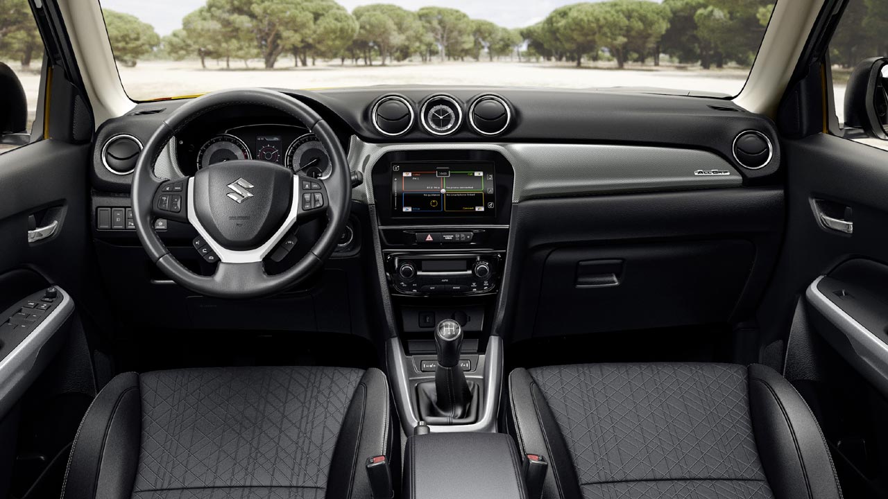 Τα ίδια ισχύουν και για το εσωτερικό του αυτοκινήτου. Και σε αυτό το Suzuki Vitara έχουν περάσει οι αλλαγές της ανανεωμένης έκδοσης. Έτσι παρουσιάζεται αναβαθμισμένο εκεί όπου πραγματικά το είχε ανάγκη. Πλέον, το σκληρό πλαστικό στο άνω μέρος του ταμπλό έχει αντικατασταθεί από μαλακό υλικό, πολύ πιο ευχάριστο στην όψη και στην αφή, ενώ η συναρμογή σε πείθει για την ανθεκτικότητά της στον χρόνο. Στις πόρτες τα πάνελ των θυρών παραμένουν σκληρά. Ο πίνακας οργάνων είναι ανασχεδιασμένος και στο κέντρο του έχει έγχρωμη οθόνη η οποία προβάλει ενδείξεις του υπολογιστή ταξιδιού αλλά και της τετρακίνησης και πλέον και του υβριδικού συστήματος (φόρτιση, στάθμη ενέργειας μπαταρίας κλπ). Στο κέντρο του ταμπλό υπάρχει έγχρωμη οθόνη αφής 7,0 ιντσών για το σύστημα πολυμέσων, ενώ λίγο πιο κάτω είναι τα χειριστήρια του κλιματισμού, ο οποίος συνοδεύεται από οθόνη υγρών κρυστάλλων για τις απαραίτητες ενδείξεις θερμοκρασίας και κατεύθυνσης του αέρα. Εργονομικά, αν εξαιρέσουμε το κουμπί για τις ενδείξεις του υπολογιστή ταξιδιού το οποίο βρίσκεται στο ταμπλό και απαιτεί να πάρεις το χέρι σου από το τιμόνι για να το πατήσεις, δεν υπάρχουν ατέλειες. Η χωρητικότητα της καμπίνας δεν έχει αλλάξει σε σχέση με τις συμβατικές εκδόσεις. Τέσσερα άτομα θα βολευτούν άνετα, ενώ ο μεσαίος επιβάτης στο πίσω κάθισμα θα ενοχληθεί ελαφρώς από το τούνελ μετάδοσης, ανάμεσα στα πόδια του. Χώροι για αντικείμενα υπάρχουν αρκετοί, οι τσέπες στα πάνελ των εμπρός θυρών είναι μεγάλες, ενώ στα πάνελ των πίσω θυρών υπάρχει θήκη για μεγάλο μπουκάλι. Ο χώρος αποσκευών είναι στα 375 λίτρα και μπορεί να φτάσει στα 1.120 με την αναδίπλωση του πίσω καθίσματος, το οποίο είναι διαιρούμενο σε αναλογία 60:40. Στοιχείο σημαντικό καθώς παραμένει ως έχει χωρίς να έχει επηρεαστεί από την ύπαρξη υβριδικού συστήματος/μπαταριών.