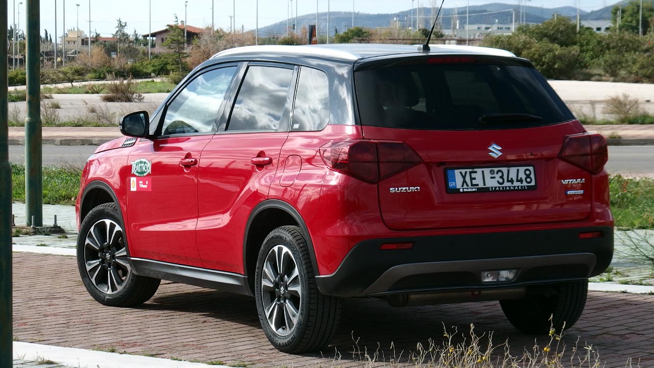 Αν κάποτε κάποιος άκουγε Vitara υβριδικό και δικίνητο θα σε έλεγε ιερόσυλο! Πλέον όμως οι καιροί άλλαξαν. Όσοι έχετε στο μυαλό σας το Vitara ως off road animal (περιλαμβάνω και τον εαυτό μου σε αυτούς, έχοντας στην κατοχή μου παλιότερα ένα Vitara) να το ξεχάσετε. Το ιαπωνικό SUV στην τελευταία του, τέταρτη γενιά έγινε πιο… ασφάλτινο από ότι ήταν στο παρελθόν. Και αυτό το καταλαβαίνεις από τα πρώτα χιλιόμετρα. Καλή πολύ καλή ποιότητα κύλισης, ανάλογη απόσβεση κραδασμών από τα αμορτισέρ και άμεση απόκριση στις εντολές του οδηγού αλλά και από τις αντιδράσεις της ανάρτησης (γόνατα McPherson εμπρός και ημιάκαμπτος άξονας πίσω) στη μεταφορά βάρους, από το αμάξωμα (απότομες αλλαγές πορείας, βίαια φρένα, ακαριαία επιτάχυνση). Και όλα αυτά με τη χρήση υβριδικής τεχνολογίας που έφερε καλύτερη και προοδευτικότερη απόκριση στο γκάζι και πιο φυσική αίσθηση από το ρελαντί. Στα επιμέρους οδηγικά στοιχεία, το τιμόνι του είναι γρήγορο και άμεσο με καλή αίσθηση χωρίς μάλιστα να περνά κραδασμούς στα χέρια του οδηγού στα κακοτράχαλα κομμάτια, ενώ ο επιλογέας ταχυτήτων έχει καλή αίσθηση κατά το κούμπωμα και δεν “κομπιάζει” στις γρήγορες αλλαγές. Όσον αφορά τα φρένα του, η δύναμή τους ικανοποιεί, ενώ το ίδιο ισχύει και για την αίσθησή τους. Έτσι αποτελεί την χρυσή τομή στην κατηγορία των compact SUV καθώς καταφέρνει να παντρέψει ιδανικά την κίνηση εκτός δρόμου με την κίνηση στην άσφαλτο. Εκτός δρόμου; Θα πάτε όσο το επιτρέπει η απόσταση των 185 χλστ. από το έδαφος. Αλλά χωρίς τετρακίνηση και με αυτά τα ελαστικά το εκτός δρόμου μάλλον περιορίζεται σε βατό χωματόδρομο, άντε και σε λίγο πιο κακοτράχαλο. Αλλά προφανώς όποιος επιλέξει την συγκεκριμένη έκδοση δεν θα το κάνει για λόγους off-road ικανοτήτων.