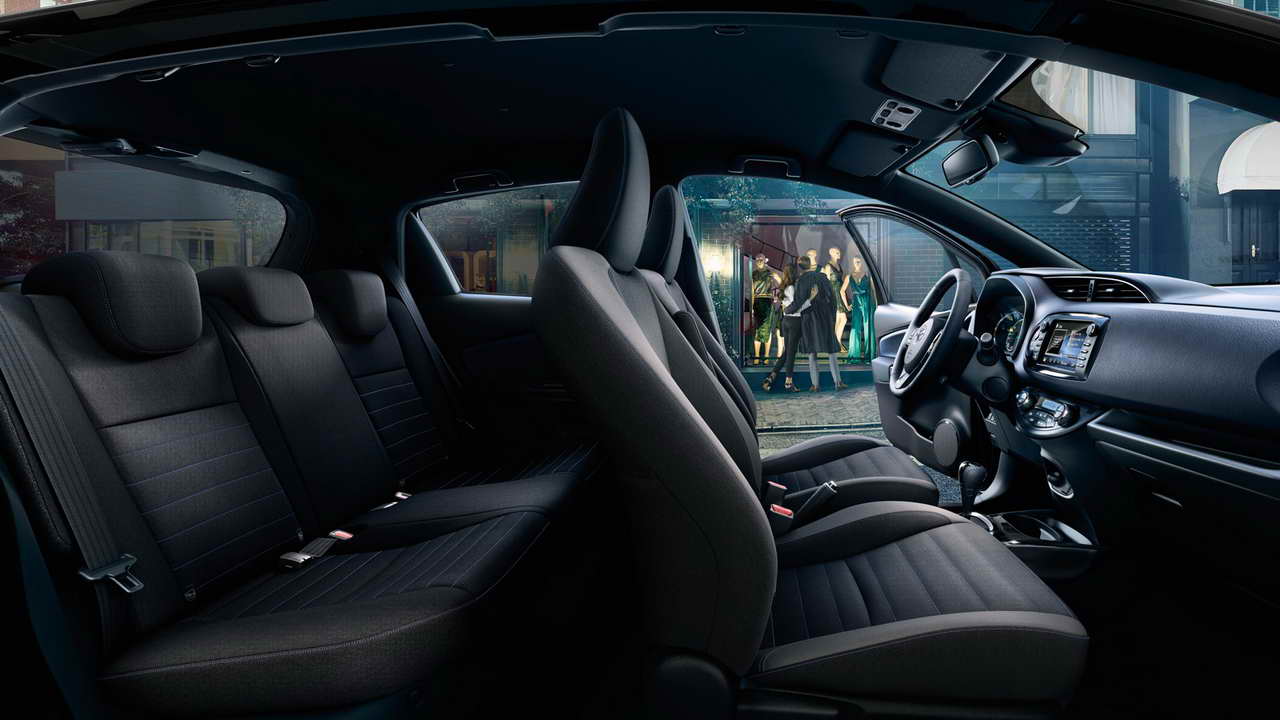 Το εσωτερικό μπορεί να φιλοξενήσει άνετα 4 επιβάτες, με τον χώρο για τους πίσω επιβάτες να είναι αρκετά ευρύχωρος. Η χωρητικότητα αποσκευών είναι 286 λίτρα, ενώ ταυτόχρονα υπάρχουν επαρκή σημεία αποθήκευσης μικροαντικειμένων. Παράλληλα, η εργονομία και η ποιότητα των υλικών εντός της καμπίνας, βρίσκονται σε αναμενόμενα υψηλά επίπεδα. Ακόμη, οι δυνατότητες εξατομίκευσης εντός και εκτός είναι πολλές, καθώς το Yaris διατίθεται σε πλειάδα χρωμάτων. Το συγκεκριμένο χαρακτηριστικό υφίσταται και στο εσωτερικό, όπου προκύπτουν αρκετοί συνδυασμοί, σε συνάρτηση με το χρώμα του αμαξώματος.