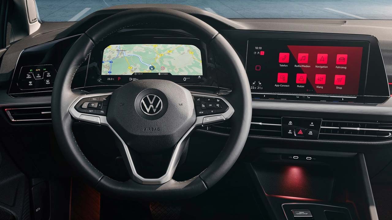 Και κάπως έτσι αφήνω τους αριθμούς και πάω στην ουσία ξεκινώντας από το εσωτερικό. Έχω την τύχη να γνωρίζω καλά το Golf από την τρίτη του γενιά έως και την σημερινή που δοκιμάζουμε εδώ (οι δύο πρώτες γενιές του μου ξέφυγαν λόγω ηλικίας…). Μπορώ να πω λοιπόν με σιγουριά πως στην 8η γενιά του το Golf παραδίδει ψηφιακά σεμινάρια. Στην VW επέλεξαν τα καλύτερα του ομίλου για το δικό τους παιδί και αυτό το καταλαβαίνεις από την στιγμή που θα ανοίξεις την πόρτα του οδηγού. Κομψή σχεδίαση, η οποία αγκαλιάζει την ψηφιακή τεχνολογία, τις οθόνες και τα πάνελ αφής και υλικά που είναι ποιοτικά. Μαλακό στο άνω μέρος του ταμπλό και των θυρών και σκληρό αλλά με ευχάριστη όψη και αίσθηση κατά την αφή, στις υπόλοιπες επιφάνειες. Στις τσέπες των θυρών υπάρχει μοκέτα (όχι και στο ντουλαπάκι του συνοδηγού όπως σε παλαιότερα μοντέλα), ενώ τα καθίσματα είναι αναπαυτικά και με πολύ καλή πλευρική στήριξη. Φλυαρίες δεν υπάρχουν στην σχεδίαση αλλά στα… πάνελ αφής, τα οποία κατά την γνώμη μου έχουν και αρνητικό αντίκτυπο στην εργονομία. Innovision Cockpit αποκαλεί η Volkswagen την προσέγγιση αυτή. Συγκεκριμένα, ανάμεσα από την κεντρική οθόνη αφής και τους αεραγωγούς υπάρχει πάνελ αφής από το οποίο χειρίζεσαι κλιματισμό και ένταση ηχοσυστήματος. Όχι καλό σημείο, καθώς εκεί θα μπορούσε να είναι ένα μέρος για να ακουμπάς το χέρι σου και να έχεις ένα… σημείο αναφοράς όταν χειρίζεσαι την οθόνη αφής ακριβώς από πάνω. Επίσης στα αριστερά του ταμπλό δεν υπάρχει πλέον διακόπτης για τα φώτα αλλά πάνελ αφής. Φυσικά αυτό έχει μικρή σημασία καθώς τα φώτα έχουν αυτόματη λειτουργία, όμως θεωρώ πιο εργονομικό έναν διακόπτη που μπορώ να αγγίζω και να περιστρέψω, χωρίς να πάρω το βλέμμα μου από τον δρόμο, όταν χρειαστεί. Ψάχνοντας για… φυσικά κουμπιά υπάρχει αυτό των “φώτων alarm” το οποίο βρίσκεται στο κέντρο ενός πάνελ αφής που απαρτίζεται από τέσσερις συντομεύσεις λειτουργιών (οδηγικά βοηθήματα, κλιματισμός, υποβοήθηση πάρκινγκ και συστήματα οδήγησης). Και αυτό εργονομικά δεν είναι ότι καλύτερο, καθώς βρίσκεται σχετικά χαμηλά και είναι σχεδόν αδύνατο να επιλέξεις κάποιο χωρίς να πάρεις το βλέμμα σου από τον δρόμο. Τα γραφικά τόσο στην οθόνη στην θέση του πίνακα οργάνων όσο και στην οθόνη του συστήματος πολυμέσων είναι εξαιρετικά, ενώ το ίδιο ισχύει και για την απόκριση της οθόνης στην αφή.